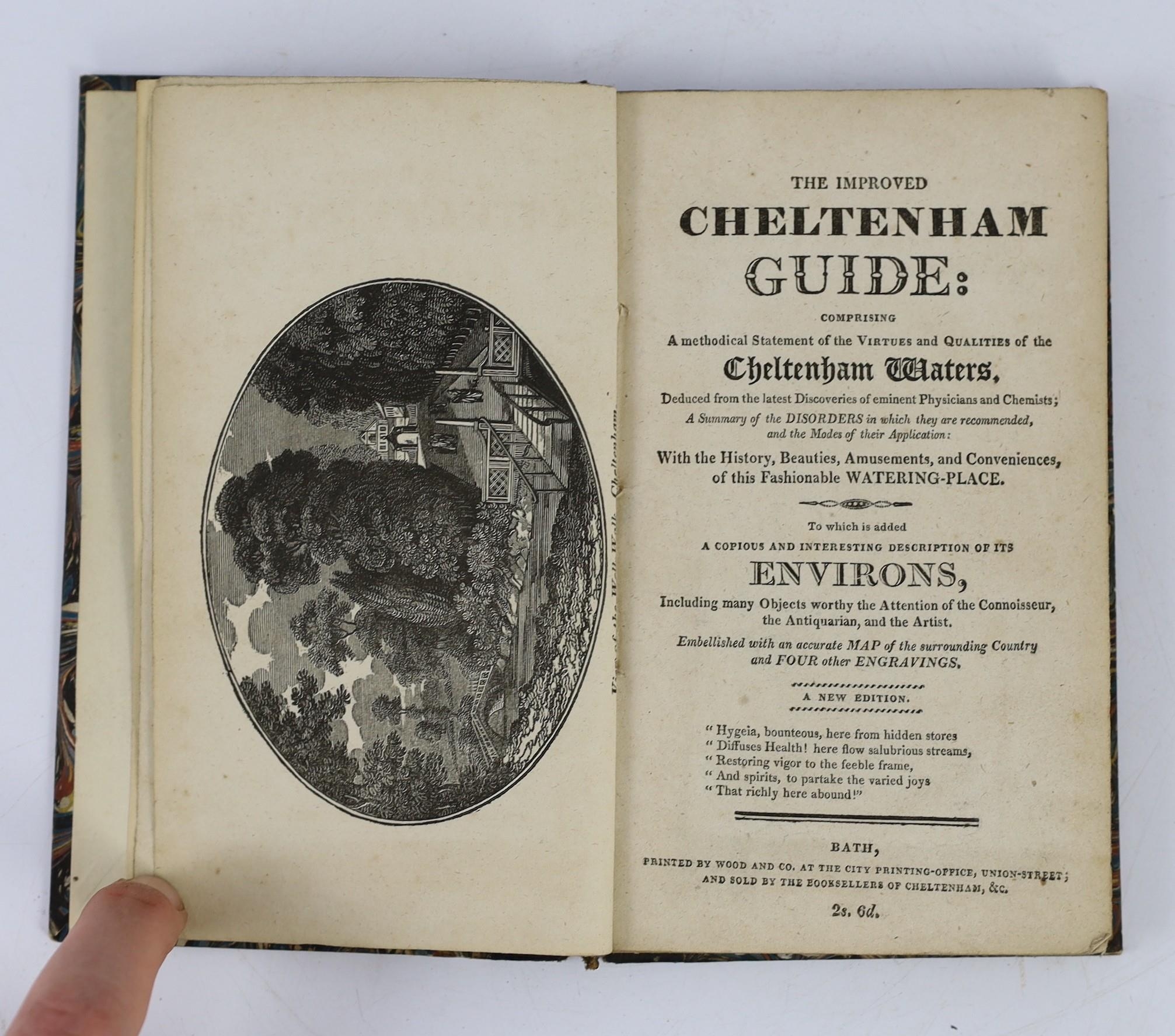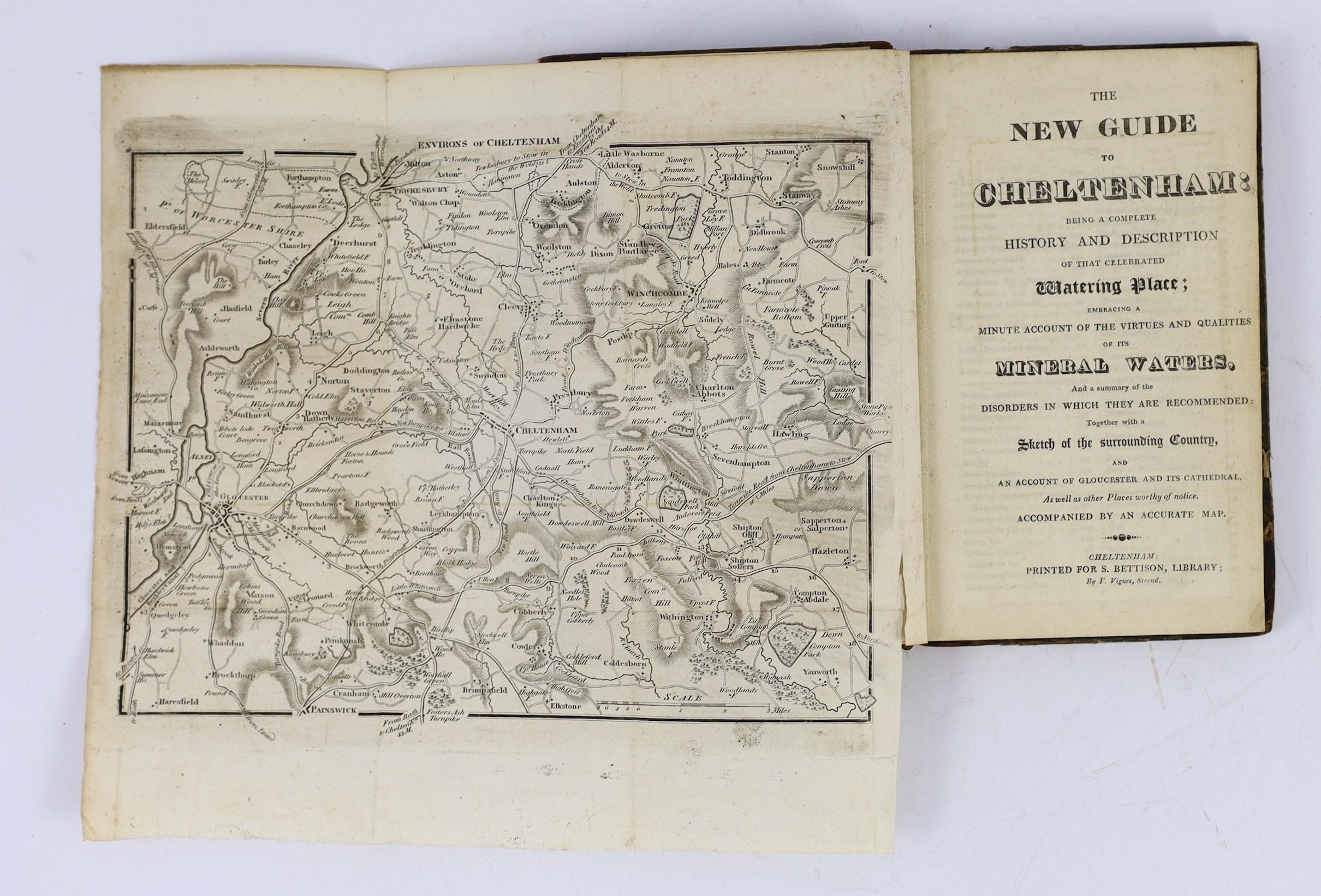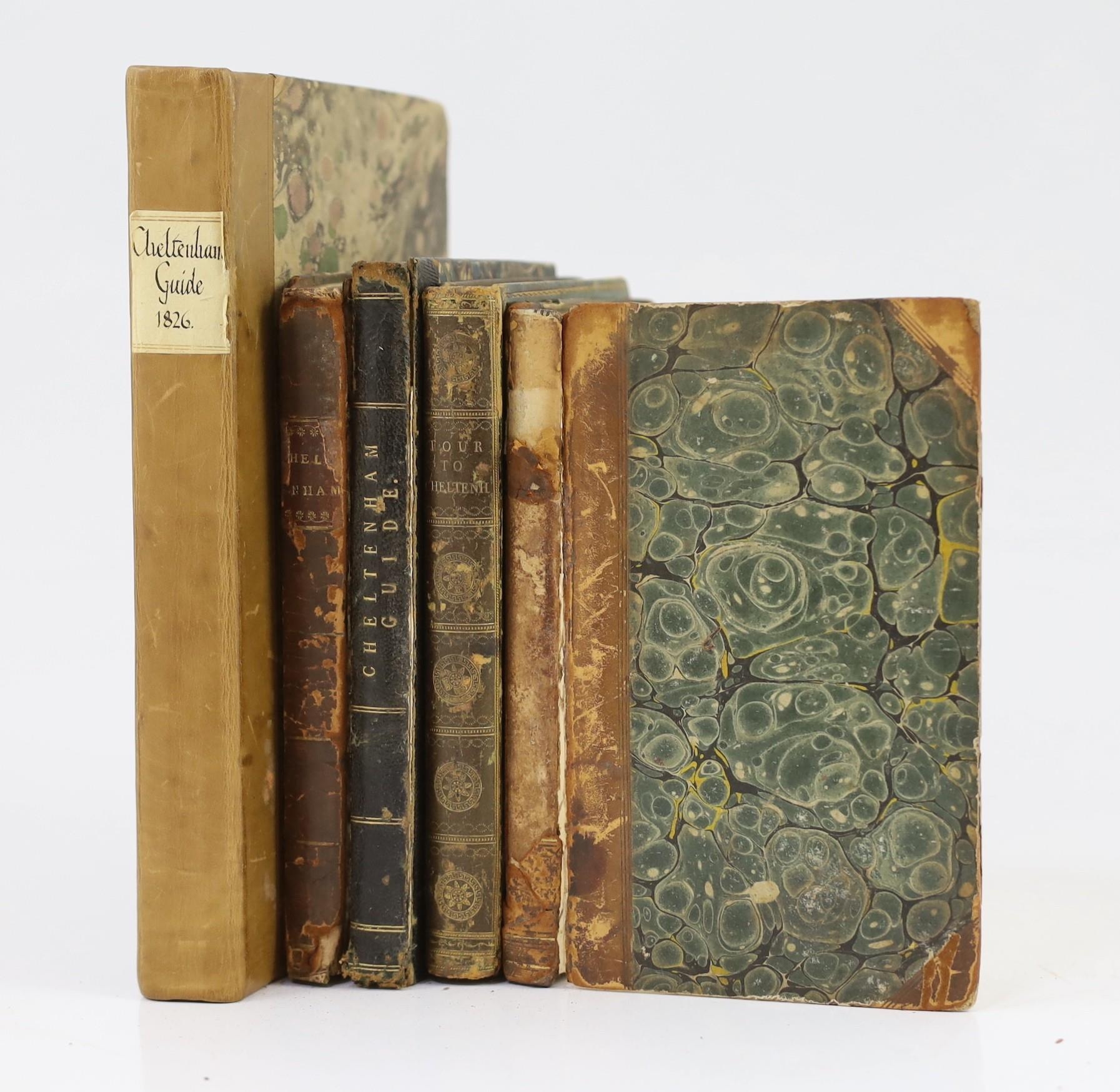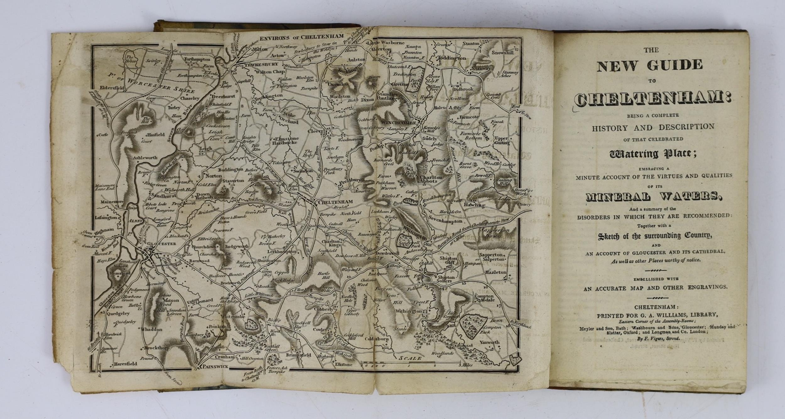 ° ° GLOUCS: The New Guide to Cheltenham...the Virtues and Qualities of its Mineral Waters...together with a Sketch of the Surrounding Country... folded map and 4 plates (2 folded); contemp. half calf and marbled boards, 12mo. Cheltenham, (ca.1820); Another copy - engraved pictorial and printed titles, folded frontis., folded map; old half calf and marbled boards, 12mo. Cheltenham, (ca.1820); The Improved Cheltenham Guide: comprising a methodical statement of the virtues and qualities of the Cheltenham waters...(and) a copious and interesting description of its environs...new edition. folded map and 4 plates; old leather backed marbled boards, 12mo. Bath, (ca.1840); New Historical Description of Cheltenham. (vol. 2 only, of 2). folded map, folded plan and 5 plates, engraved pictorial title; rebound calf backed marbled boards. Cheltenham, 1826, Moreau, Simeon - A Tour to the Royal Spa at Cheltenham...4th edition, to which is prefixed, an Account of the Royal Visit to Cheltenham, in 1788. 3 plates, text decorations, half title; 19th century green gilt decorated calf, ge. and marbled e/ps., 12mo. Bath: printed for the Author...1789 (5)