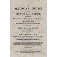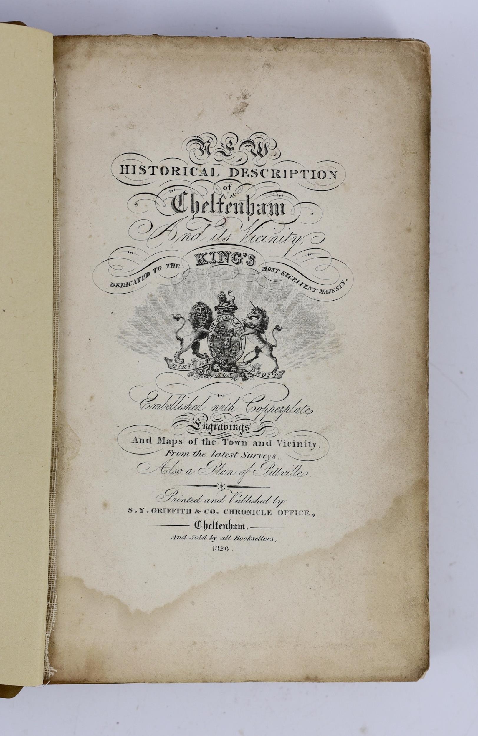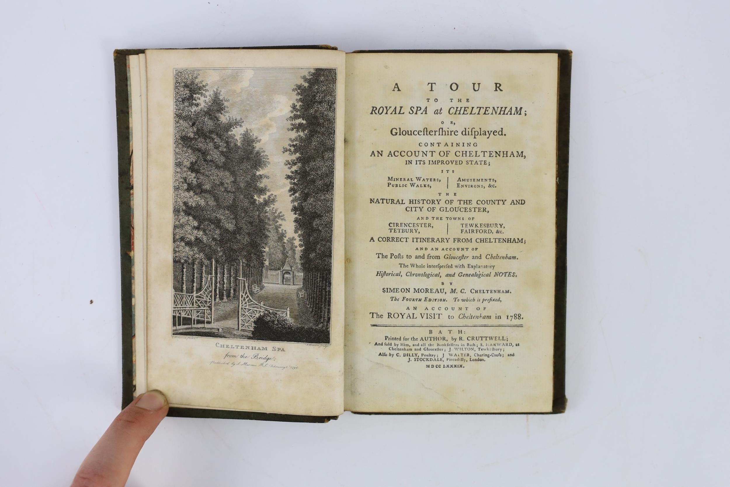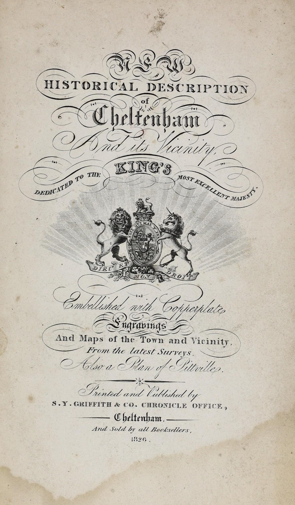 ° ° GLOUCS: The New Guide to Cheltenham...the Virtues and Qualities of its Mineral Waters...together with a Sketch of the Surrounding Country... folded map and 4 plates (2 folded); contemp. half calf and marbled boards, 12mo. Cheltenham, (ca.1820); Another copy - engraved pictorial and printed titles, folded frontis., folded map; old half calf and marbled boards, 12mo. Cheltenham, (ca.1820); The Improved Cheltenham Guide: comprising a methodical statement of the virtues and qualities of the Cheltenham waters...(and) a copious and interesting description of its environs...new edition. folded map and 4 plates; old leather backed marbled boards, 12mo. Bath, (ca.1840); New Historical Description of Cheltenham. (vol. 2 only, of 2). folded map, folded plan and 5 plates, engraved pictorial title; rebound calf backed marbled boards. Cheltenham, 1826, Moreau, Simeon - A Tour to the Royal Spa at Cheltenham...4th edition, to which is prefixed, an Account of the Royal Visit to Cheltenham, in 1788. 3 plates, text decorations, half title; 19th century green gilt decorated calf, ge. and marbled e/ps., 12mo. Bath: printed for the Author...1789 (5)