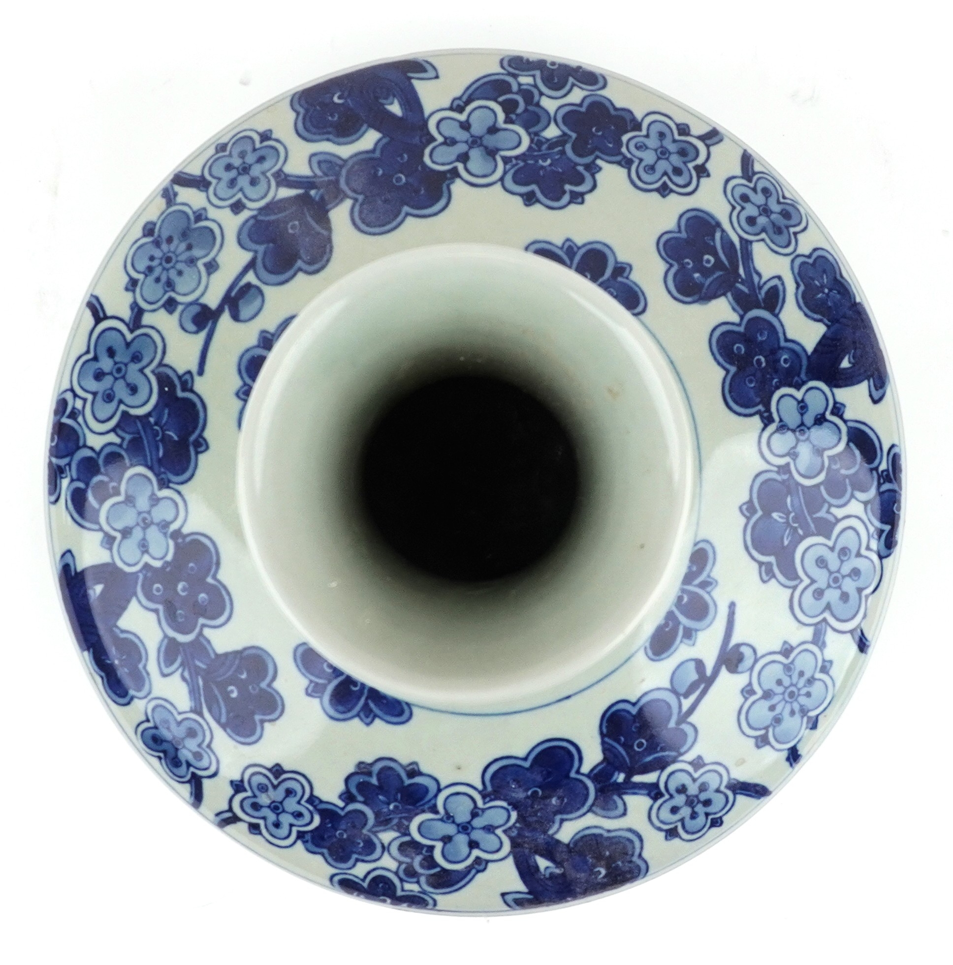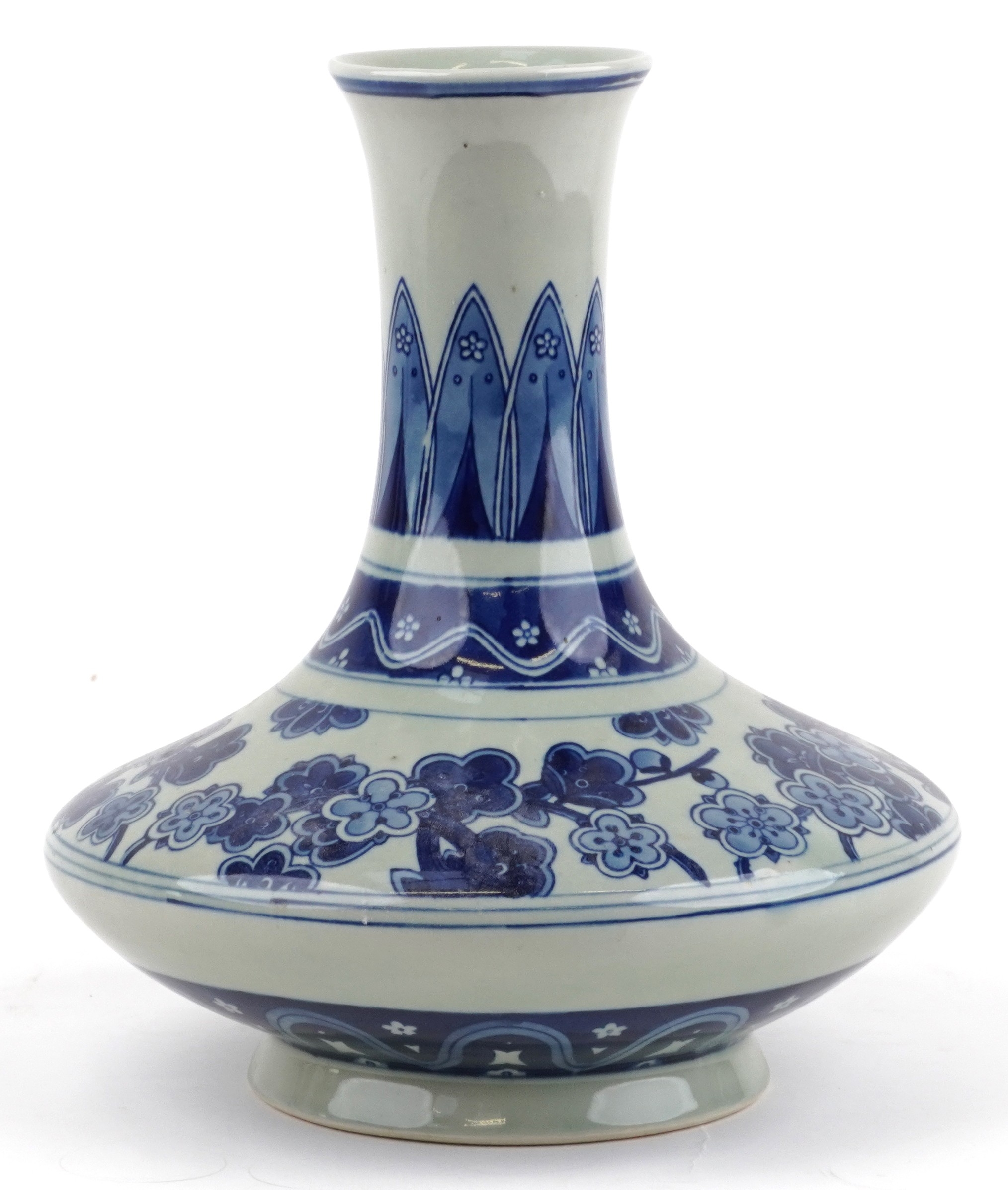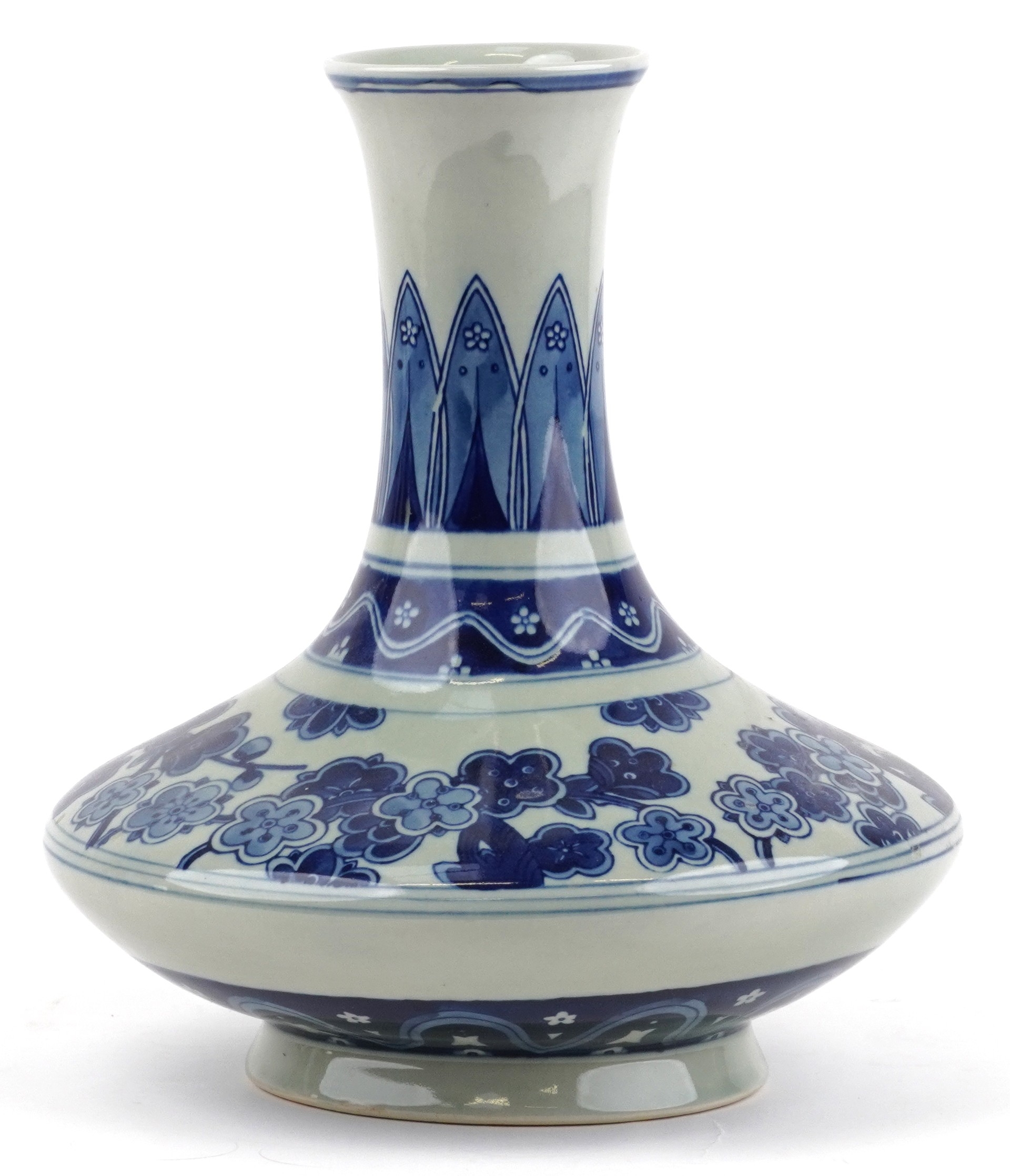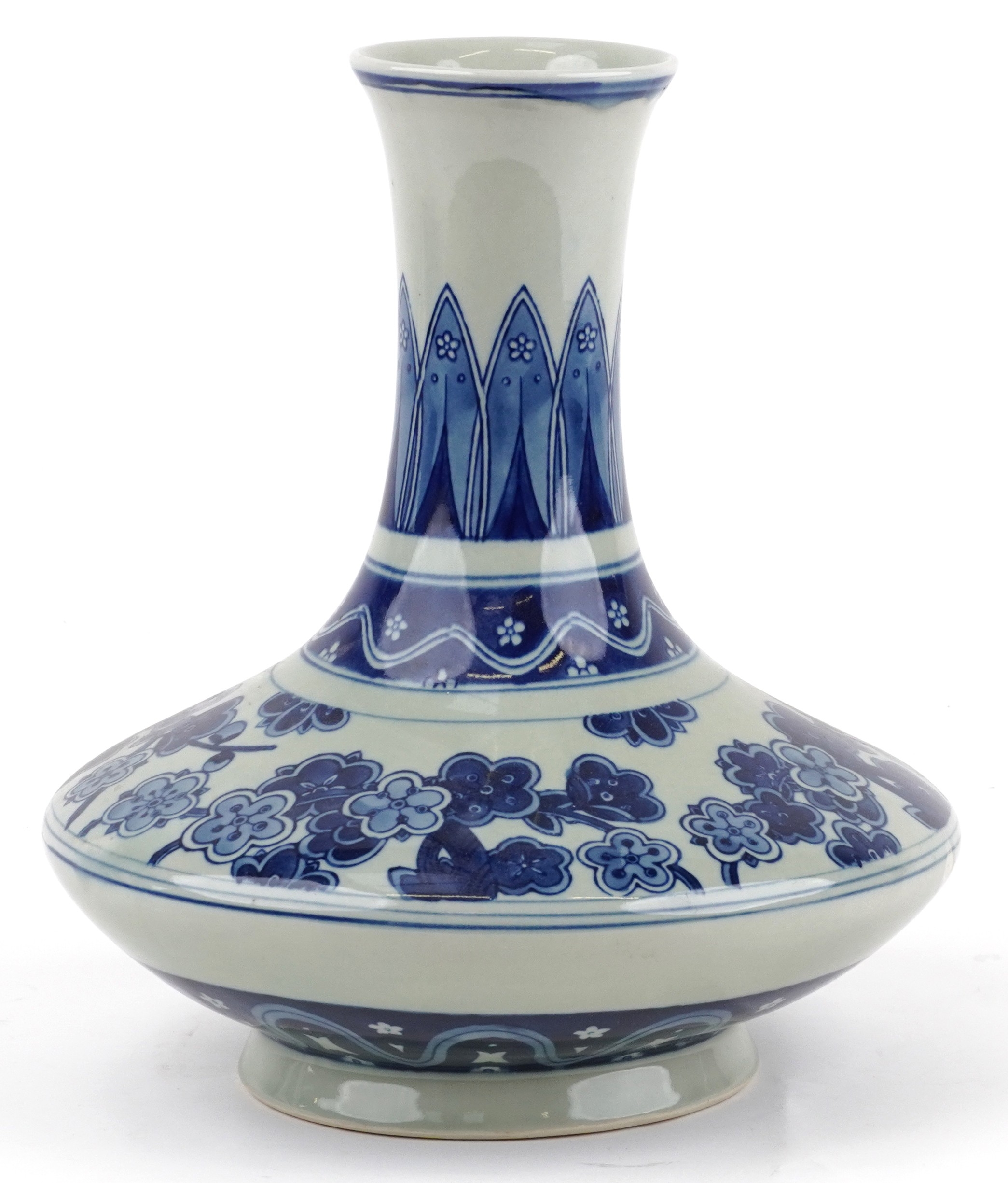 A Chinese blue and white porcelain vase, hand painted with a floral border, bearing four character marks to the base, 32cm high.