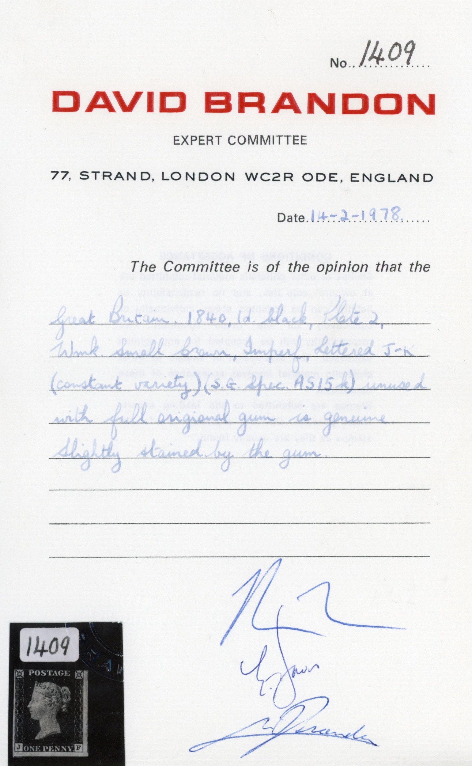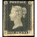 1840 1d black, Pl. 2 (JF), with constant variety, mint, unmounted o.g. with three good to large margins, just touching at top and showing traces of adjacent stamps at right and foot. Some gum toning showing through to the front, still a very desirable example. Brandon cert (1978), Spec. AS14k, SG 2var, £13,000