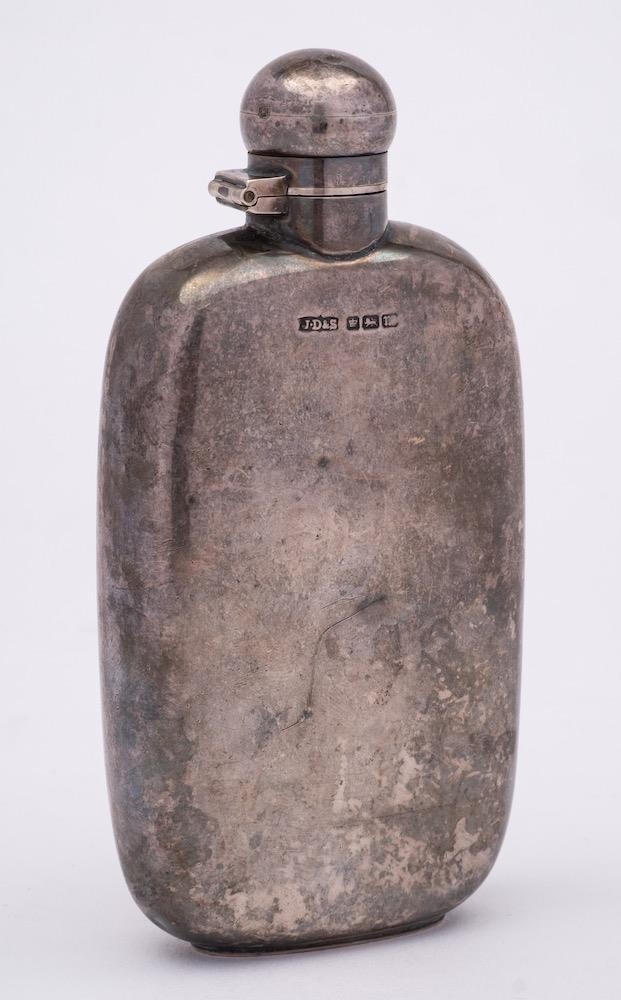 An Edward VII silver hip flask, maker James Dixon & Sons, Sheffield, 1904: of rectangular outline, with twist hinged top, 13cm high, 114gms, 3.67ozs