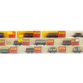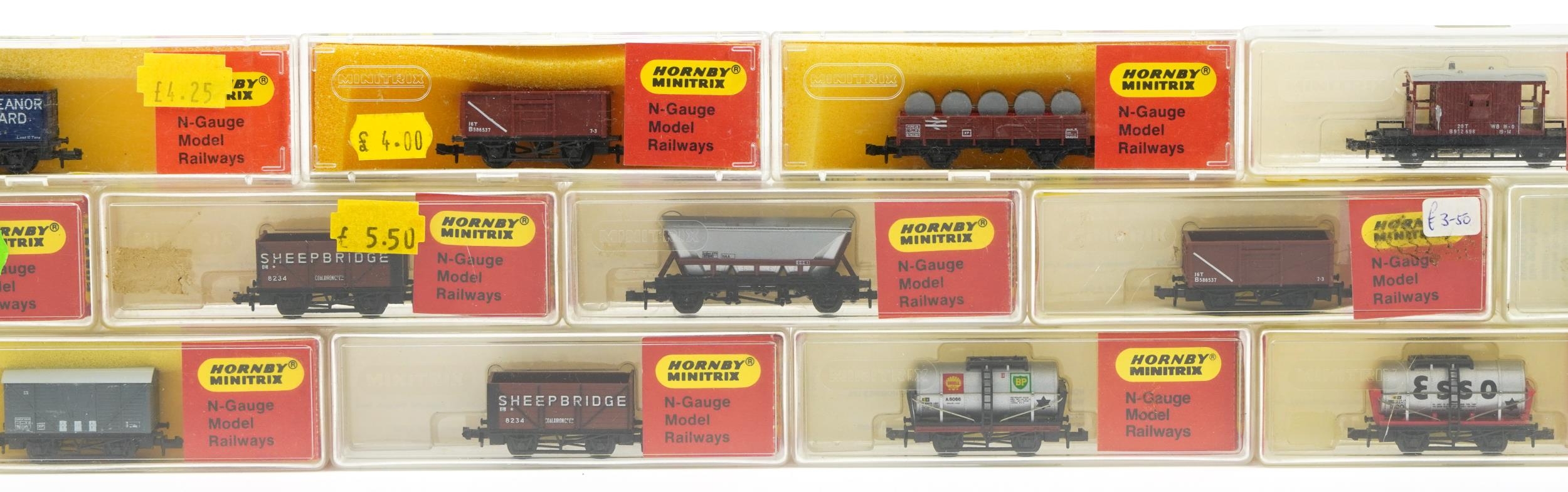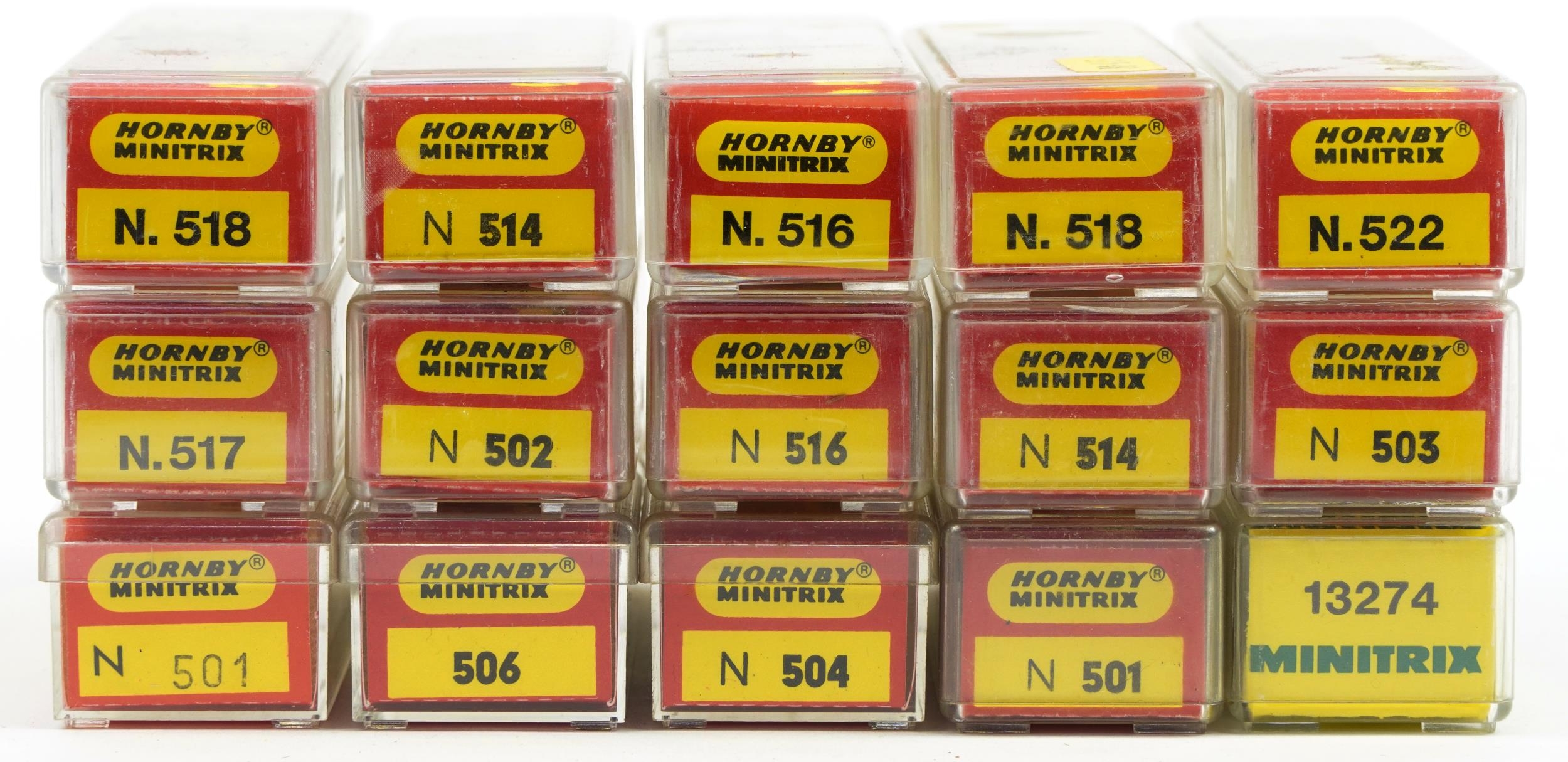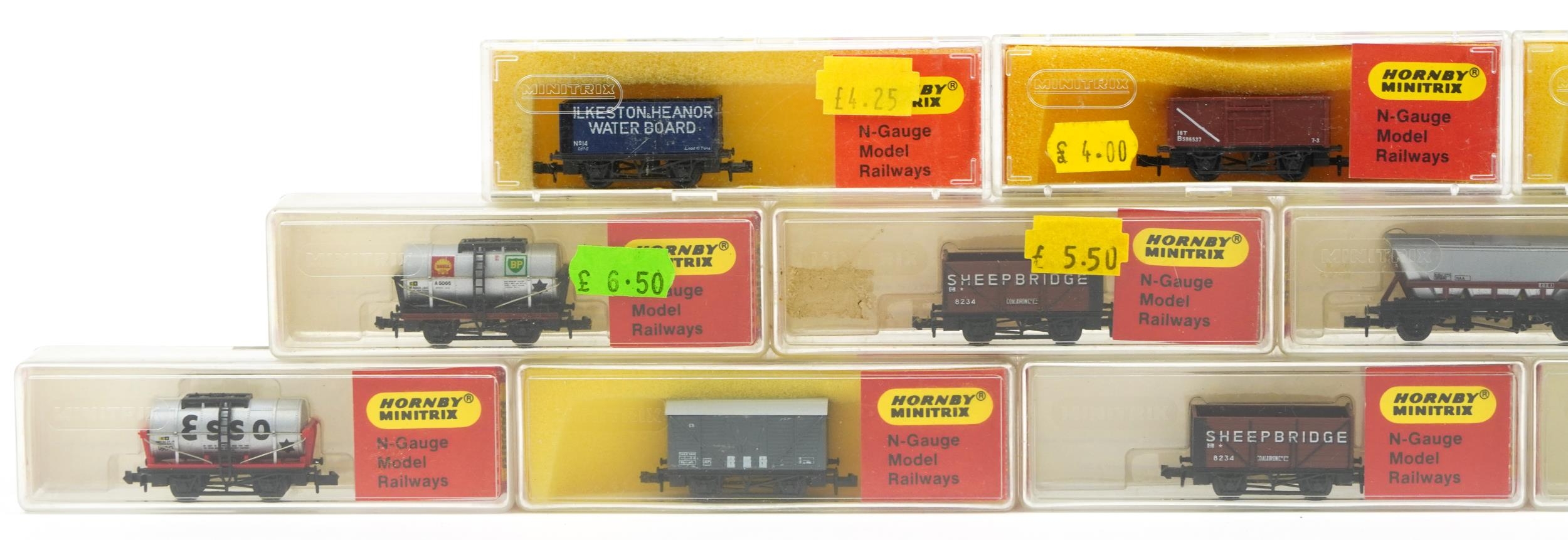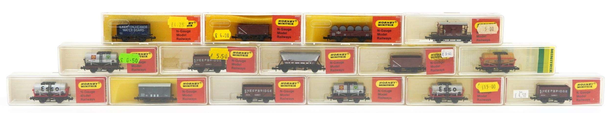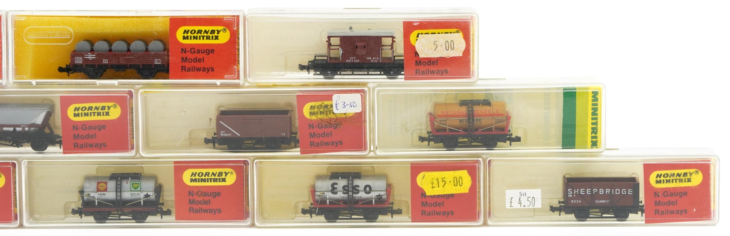 Fifteen Hornby Minitrix N gauge model railway tankers and wagons with cases