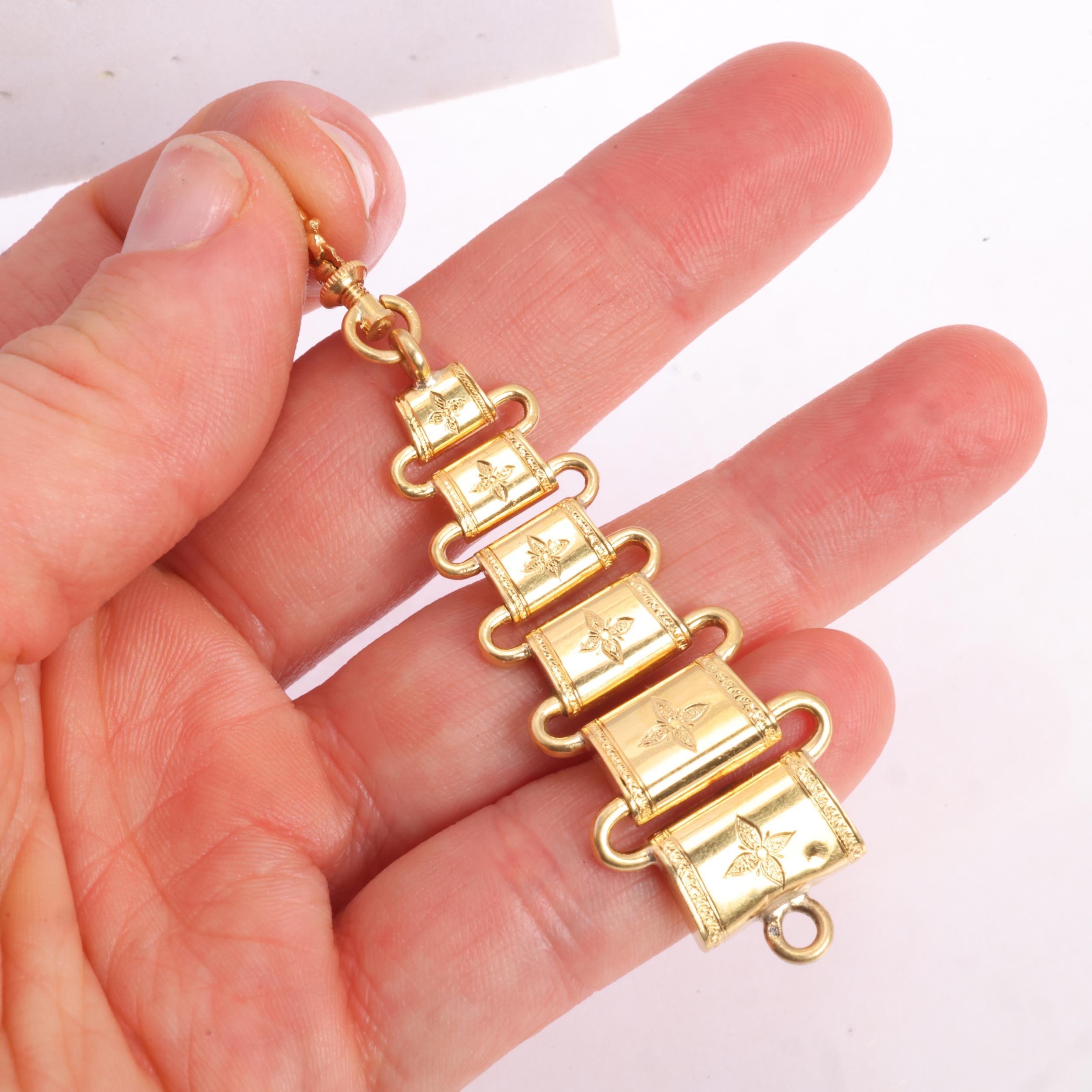 An Antique French 18ct gold watch fob chain, graduated rectangular form, with chased floral decoration and 18ct gold locking dog clip, overall 71.4mm, 6.2g
