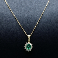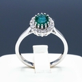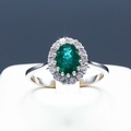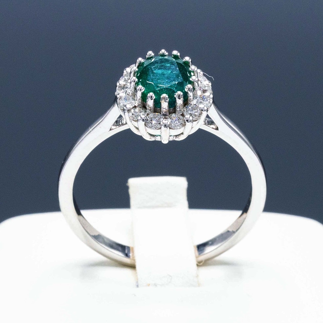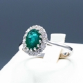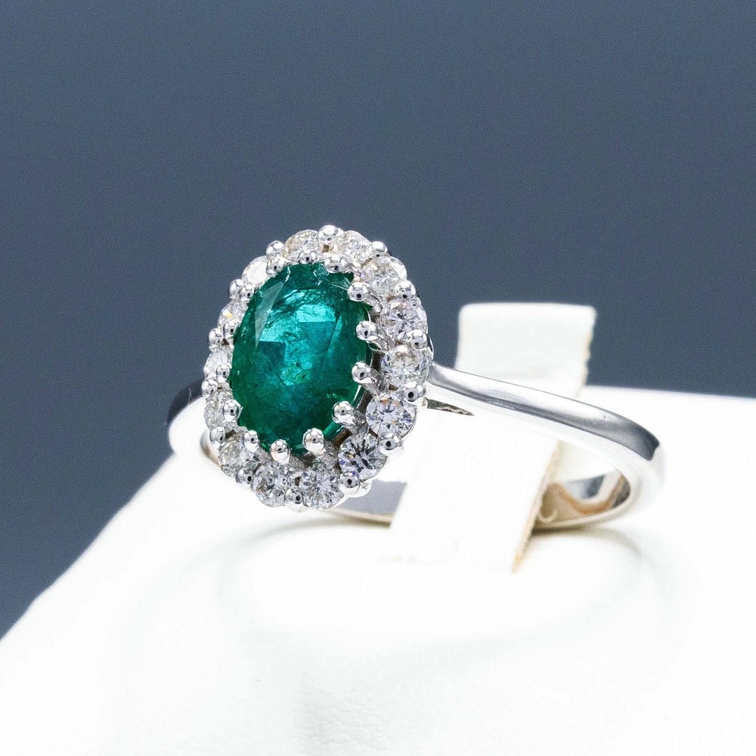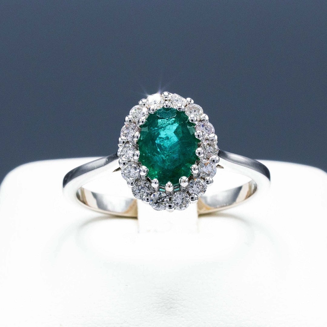 AN 18CT WHITE GOLD EMERALD AND DIAMOND CLUSTER RING. set with an oval emerald of 0.86ct, with round brilliant cut diamonds of 0.30ct.