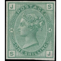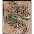 1880 1s Orange-brown Pl.13 (Wmk. Spray). Fine used block of four lettered GA-HB cancelled by Glasgow NPB datestamps for FE.10.1881. Slightly faded and some surface rubbing nevertheless a rarely seen multiple. SG151. Cat. £4500.