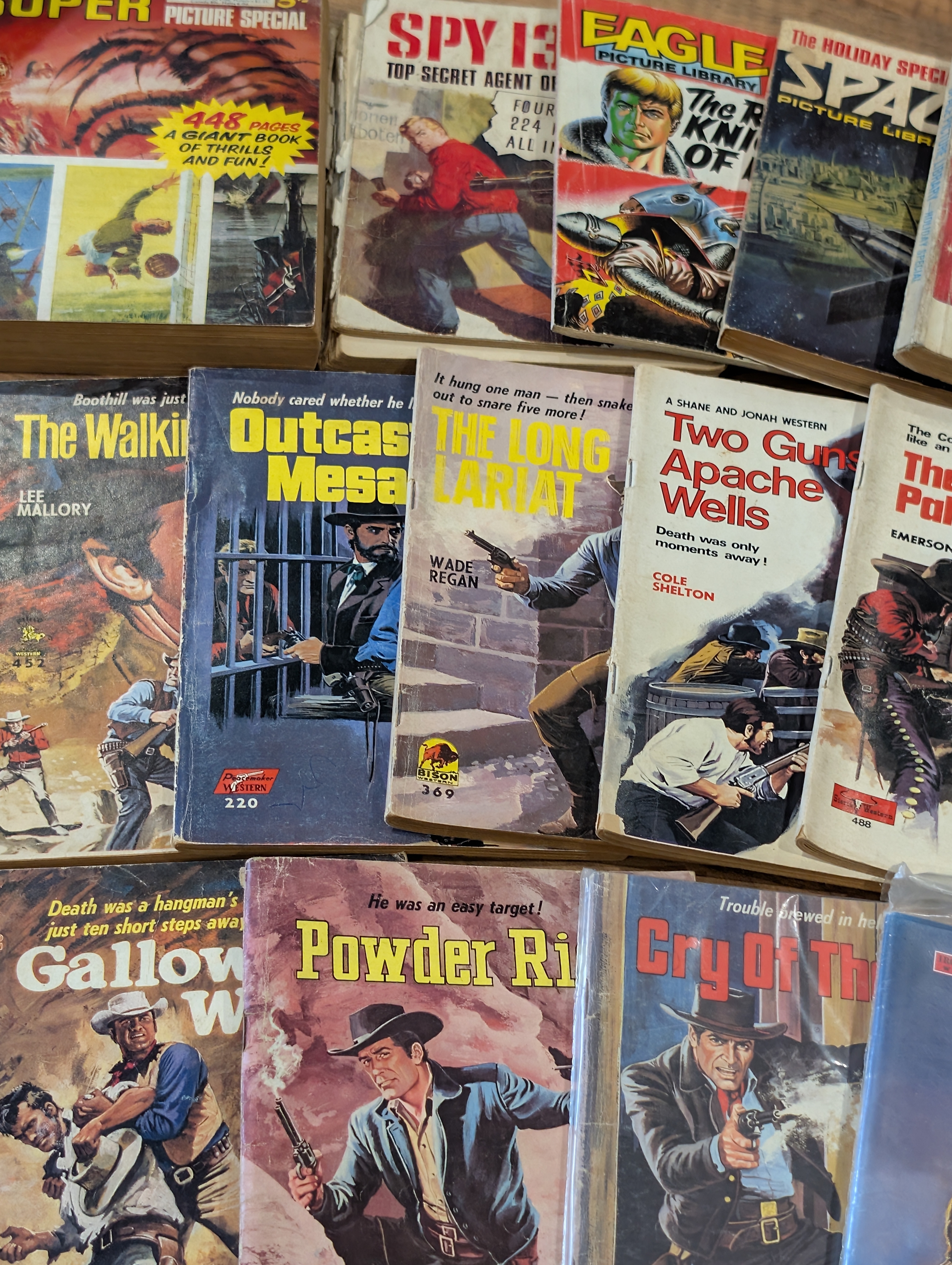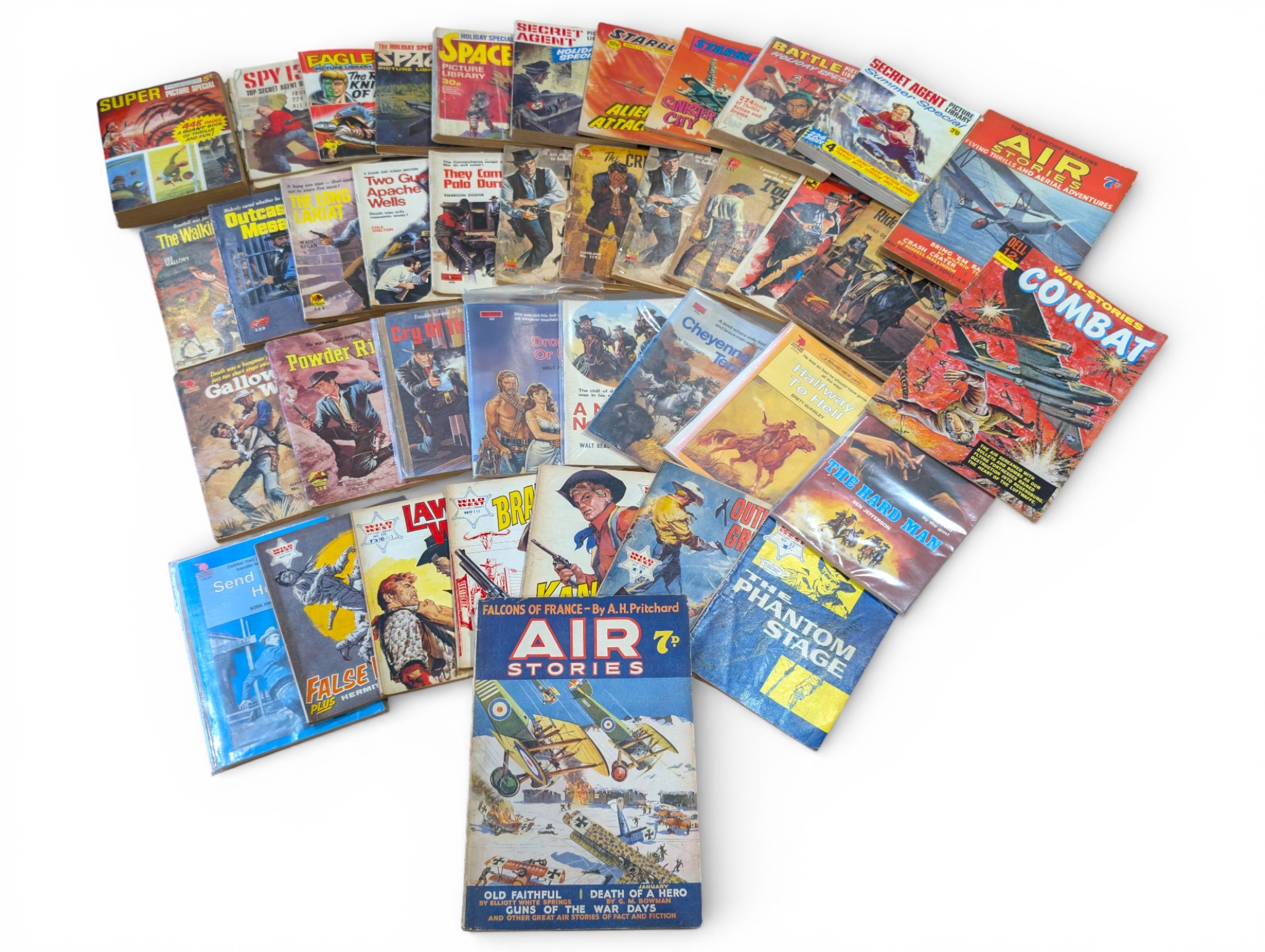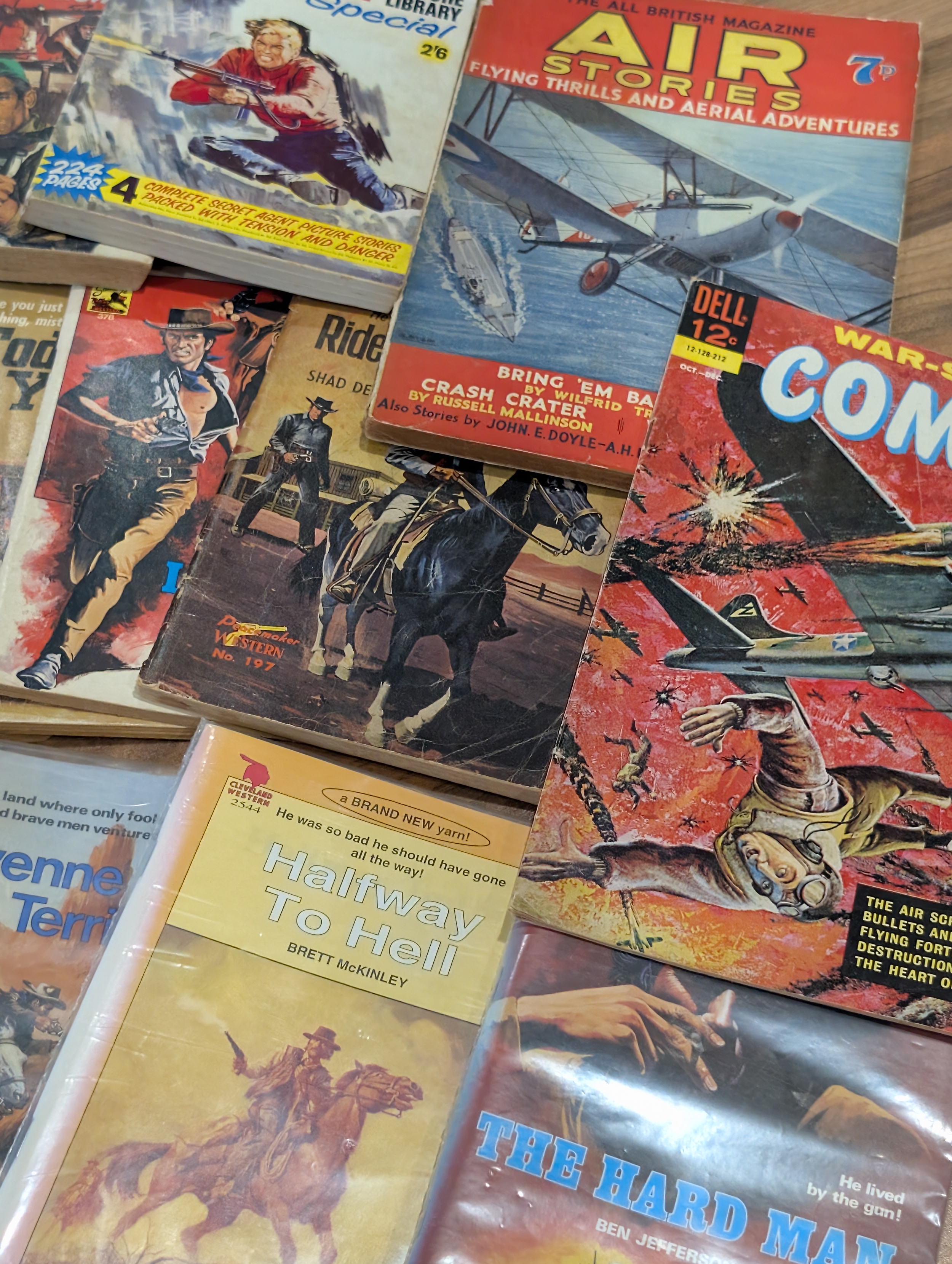 A mixed lot of mid-20th century British war, adventure and western titles, including Fleetway / IPC-style picture libraries, war stories, air combat, espionage and western themes.