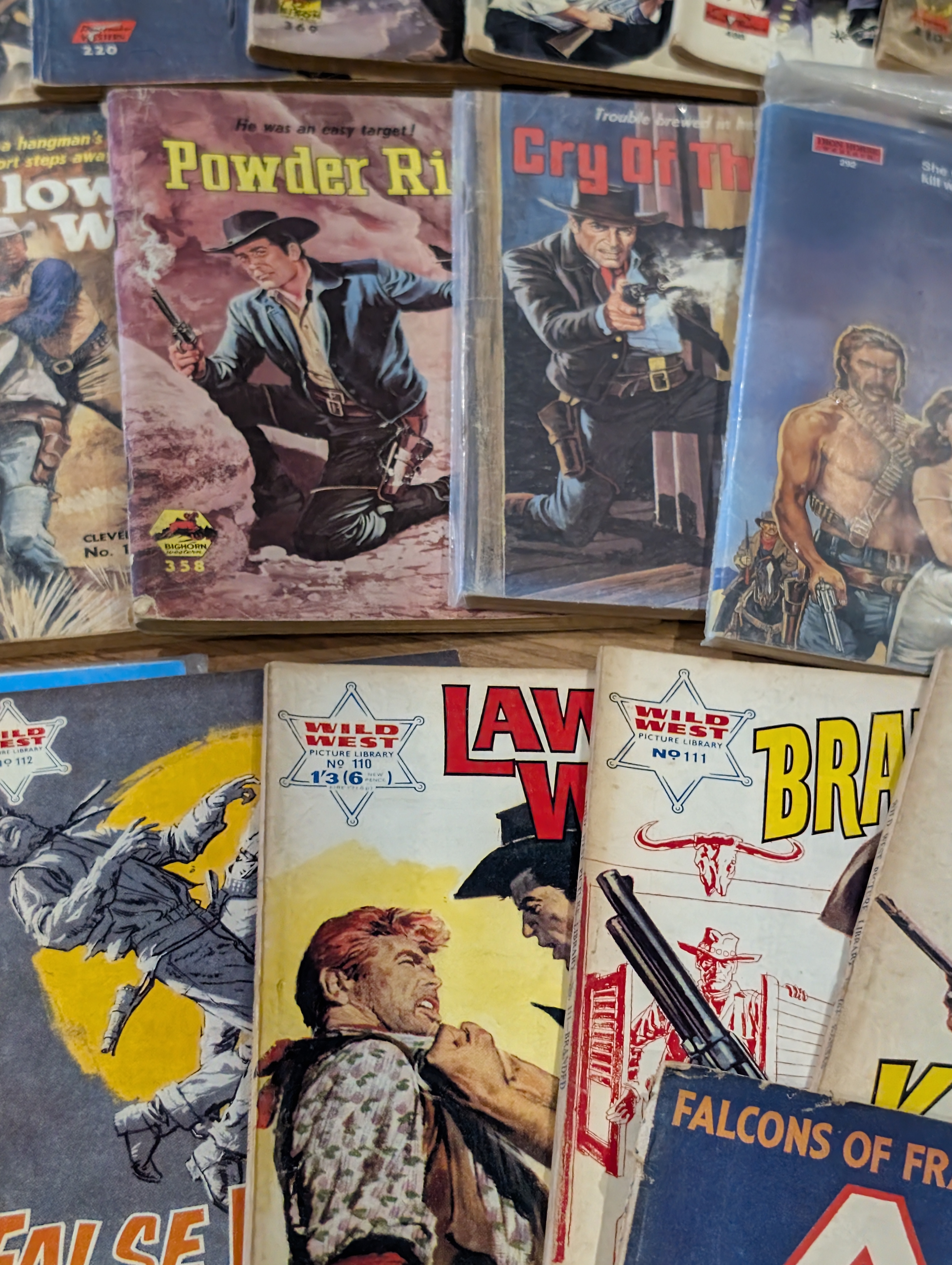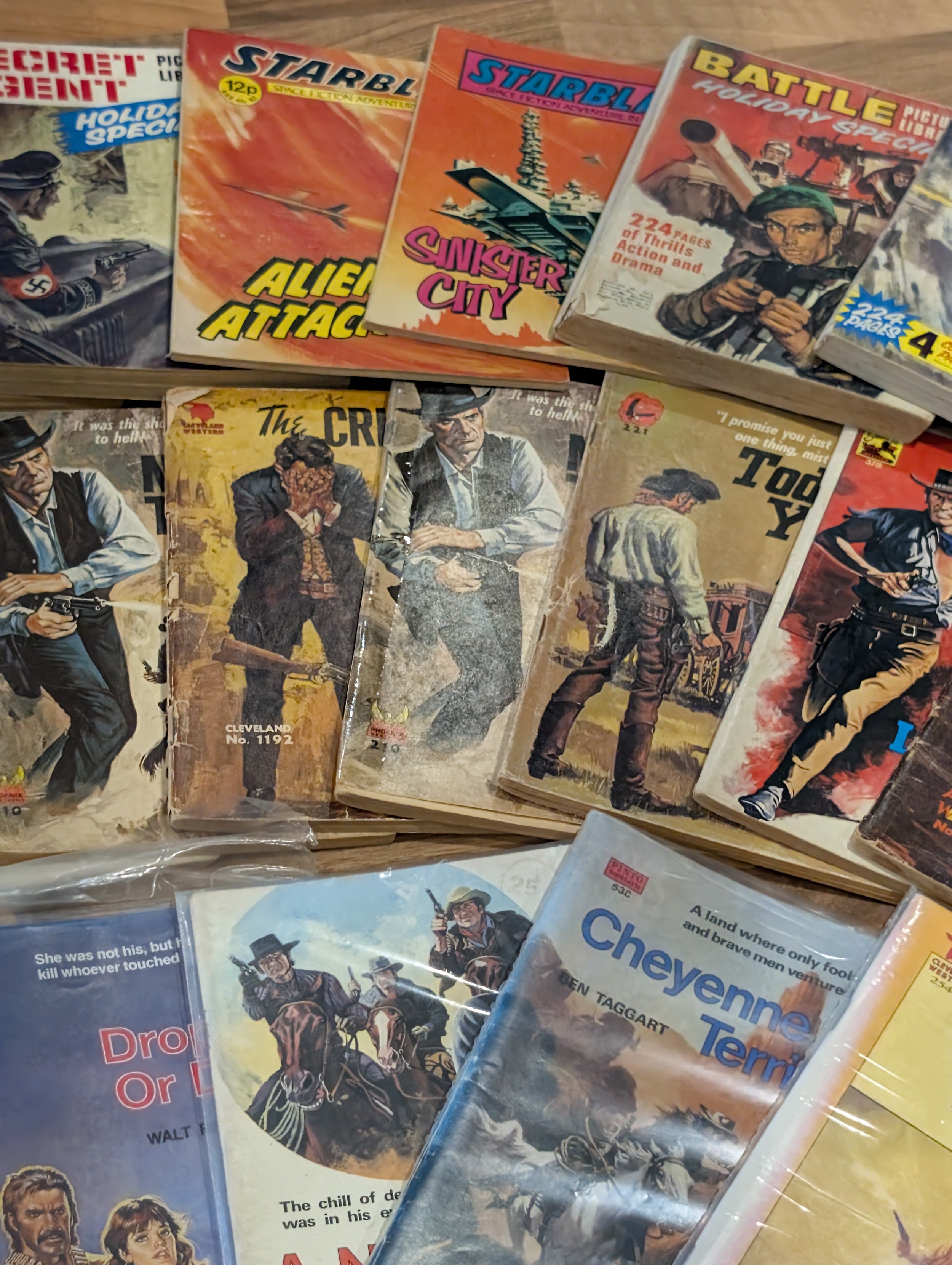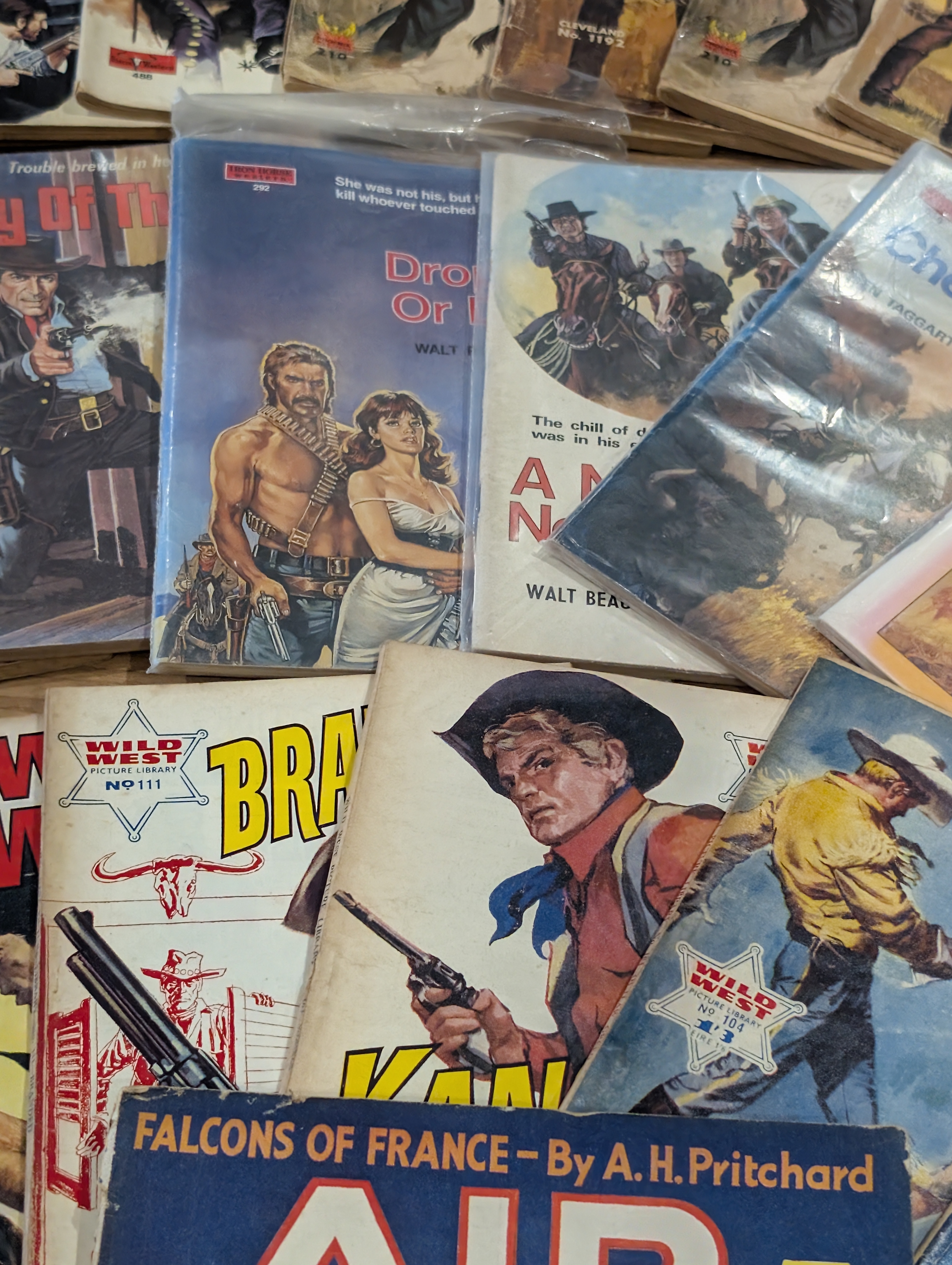 A mixed lot of mid-20th century British war, adventure and western titles, including Fleetway / IPC-style picture libraries, war stories, air combat, espionage and western themes.