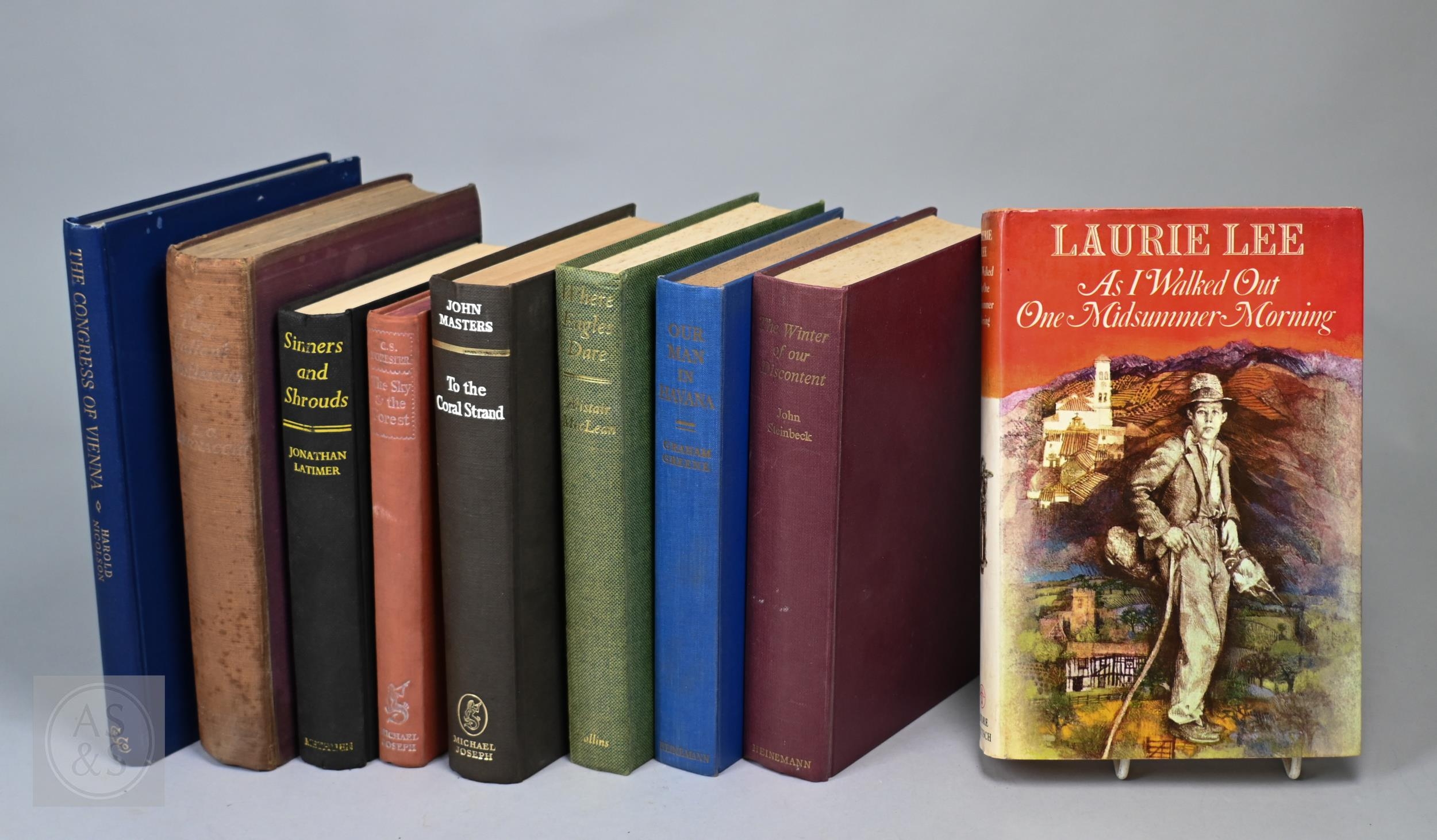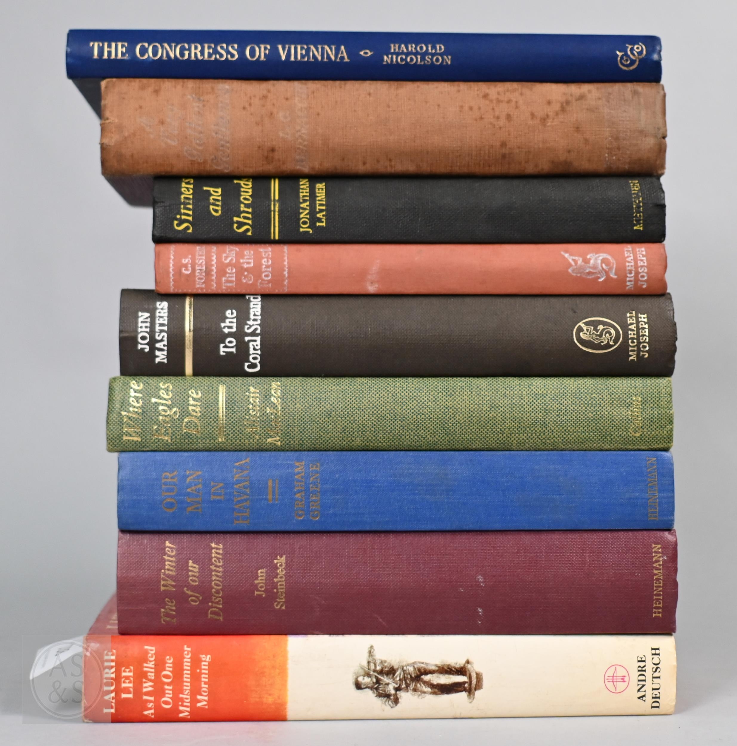 Various first edition books; Graham Greene, Our Man in Havana, 1958; Alistair MacLean, Where Eagles Dare, 1967; Laurie Lee, I Walked Out One Midsummer Morning, 1969 (D/W); John Steinbeck, The Winter of Our Discontent, 1961; C S Forester, The Sky and the Forest, 1948; John Masters, To the Coral Strand, 1962; Jonathan Latimer, Sinners and Shrouds, 1956; Harold Nicholson, The Congress of Vienna, 1946; L C Bernacchi, A Very Gallant Gentleman, 1933 (9)
