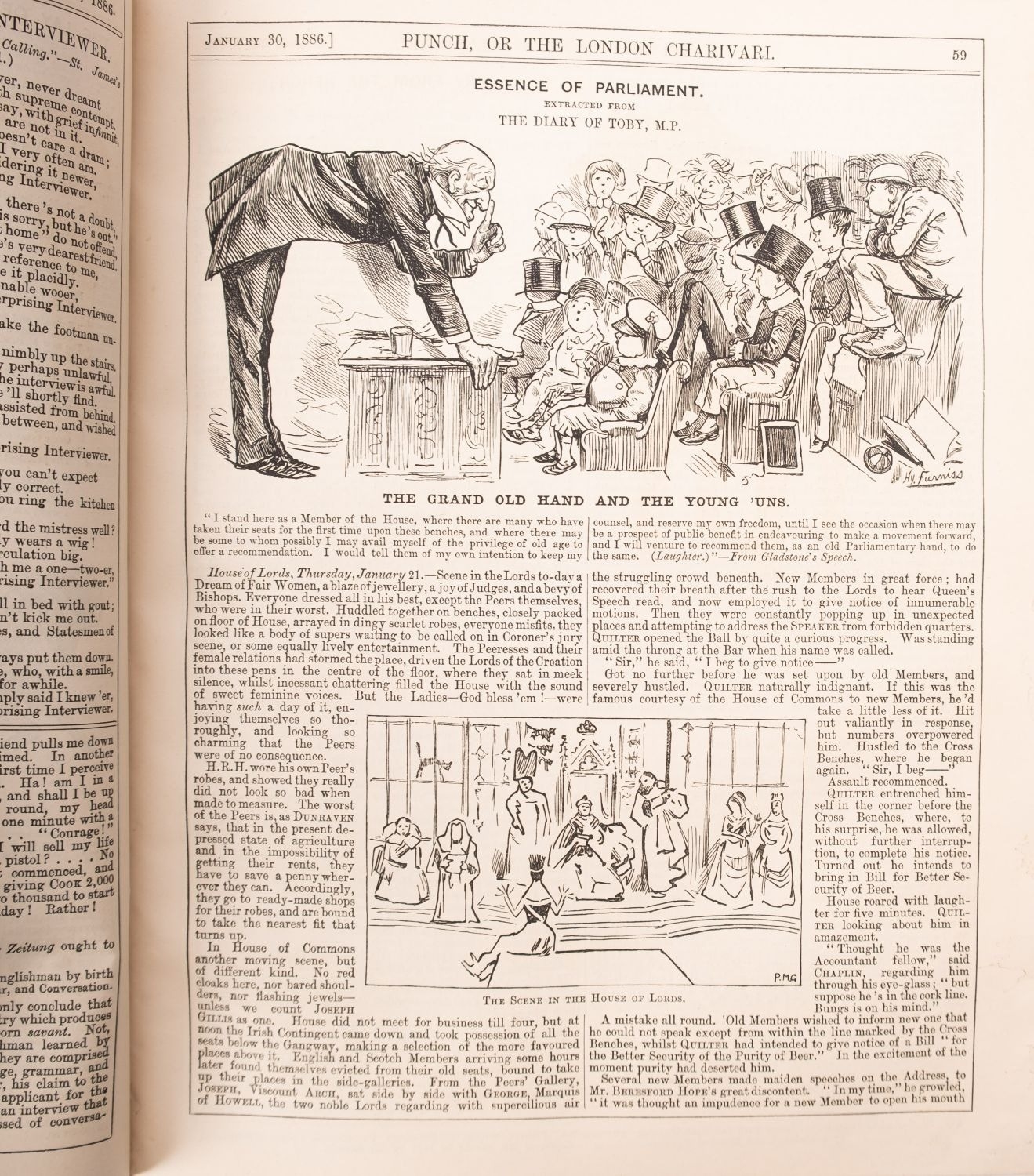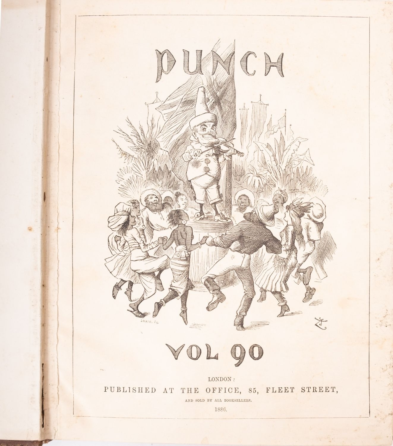 PUNCH. Punch, or the London Charivari. A broken run*, 1914-1946 in 47 vols., num. illustrations, blue cloth, mixed condition, 4to;... together with Vol 90, 1886, half-morocco distressed, 4to. (48) [*lacking 1914 Jan-Jun, 1915 Jan-June, 1917, 1927 Jul-Dec, 1935 Jul-Dec, 1936 Jul-Dec, 1937 Jul-Dec, 1939 Jan-Jun, 1944 Jul-Dec, 1945 Jan-Jun]