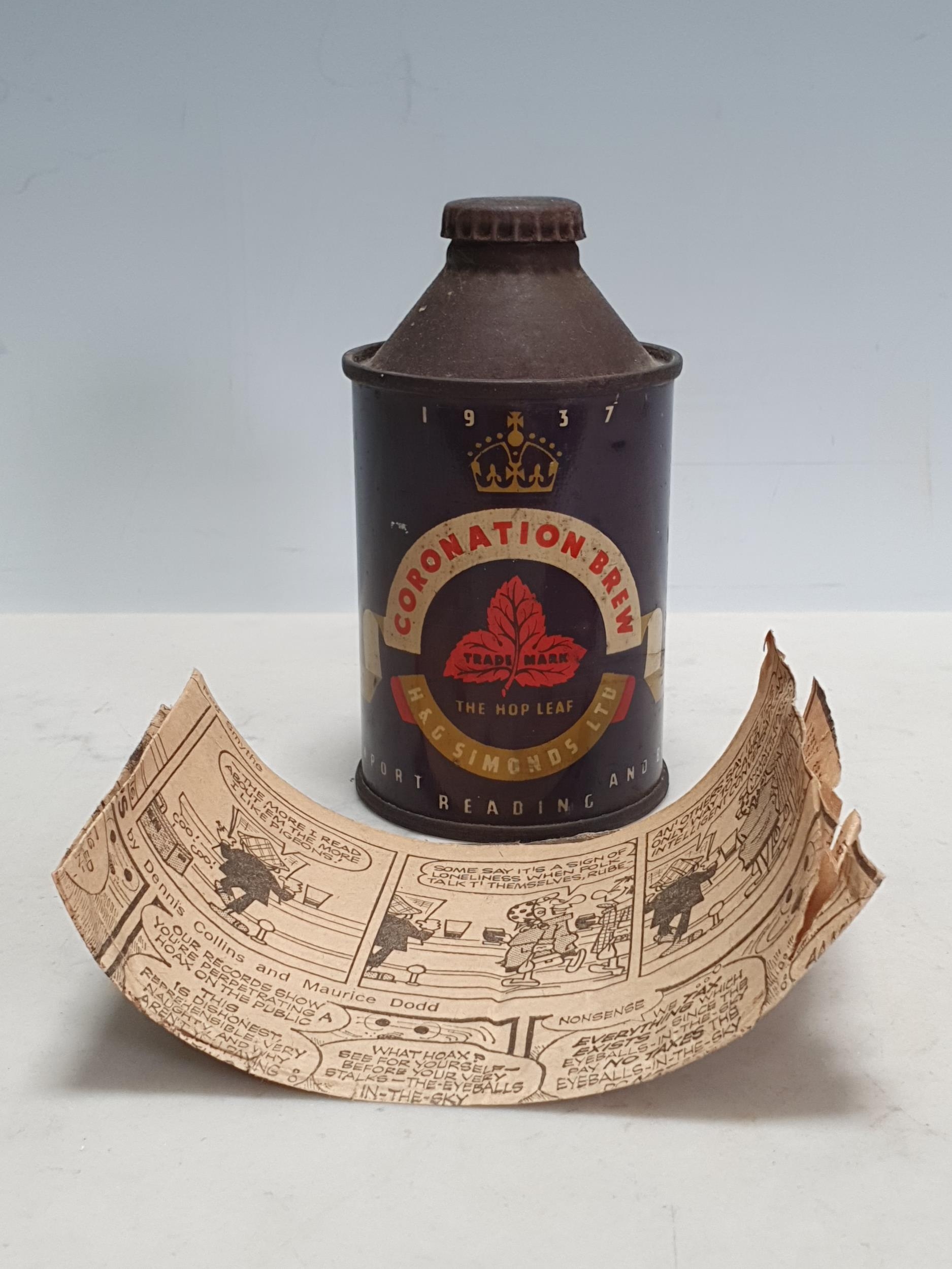 A 1937 Simonds "Coronation Brew" cone top Beer Can and a related newspaper clipping, 5in H (R1)