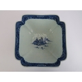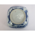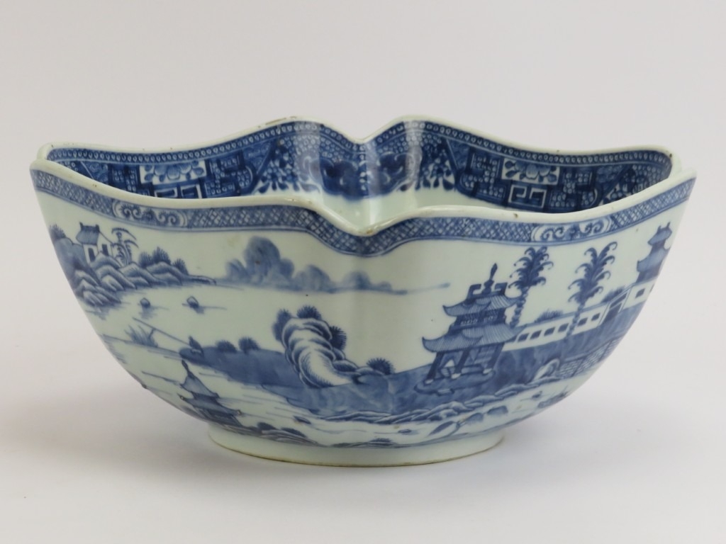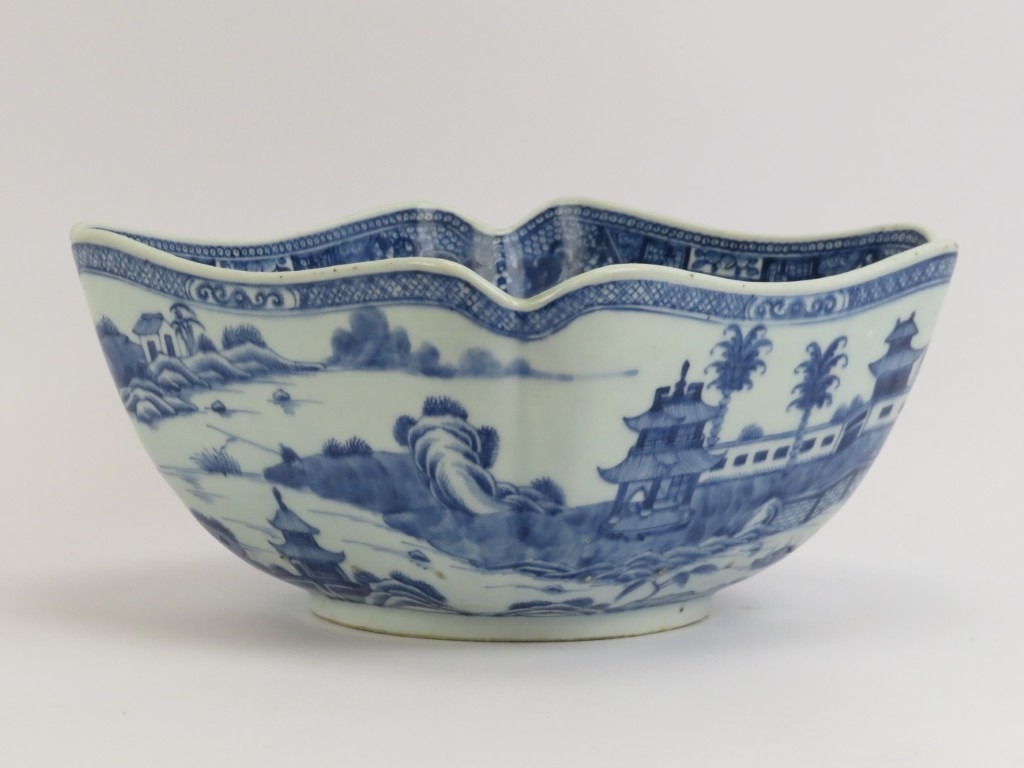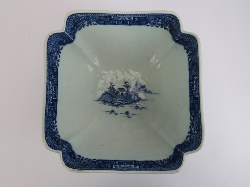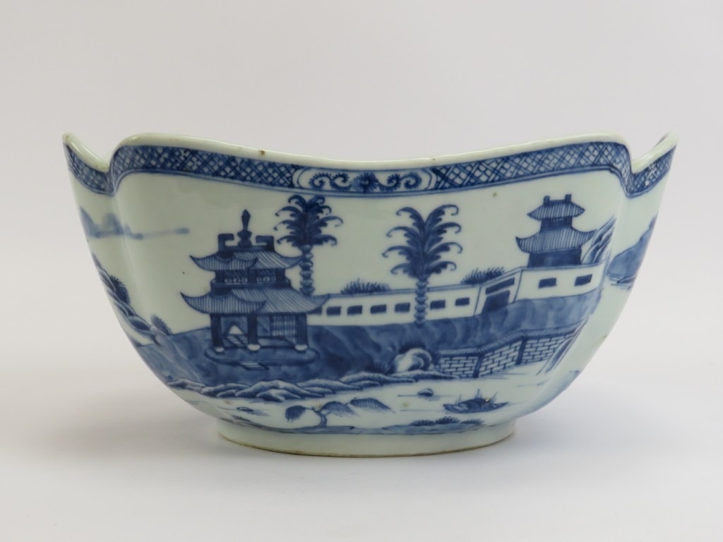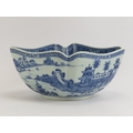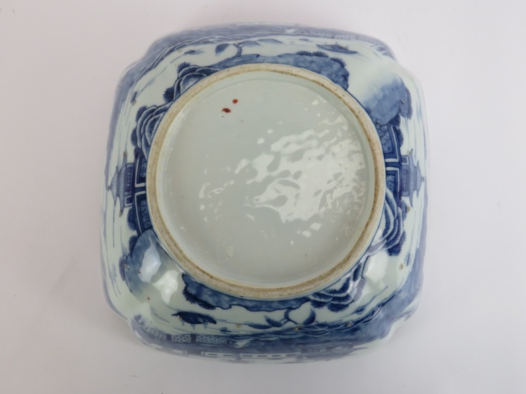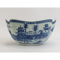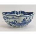 A Chinese blue and white decorated salad bowl, 19th century. Of lobed square form, decorated with two river landscape scenes depicting a palace and pavilions to the exterior. 13 cm height, 25.8 cm width.
