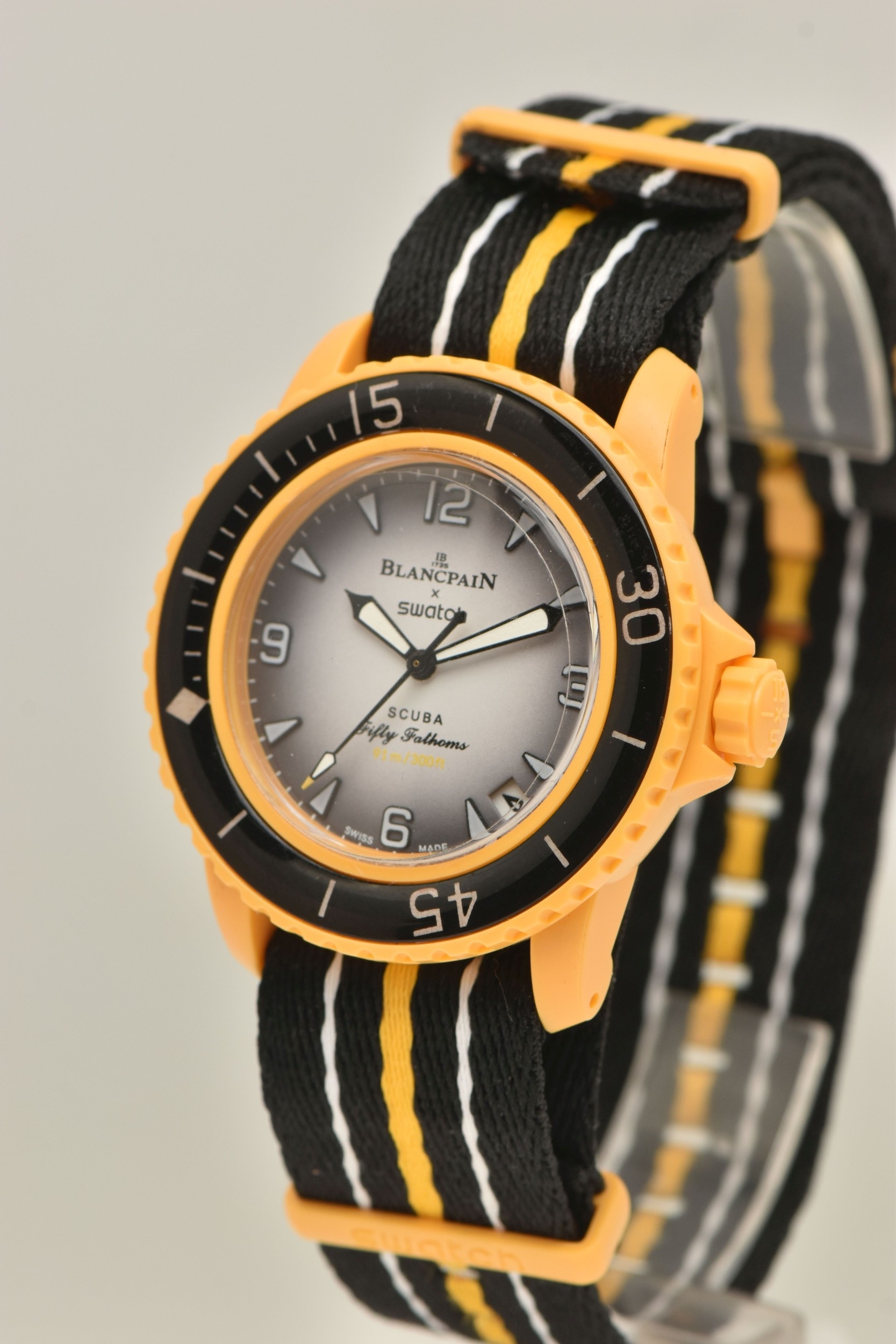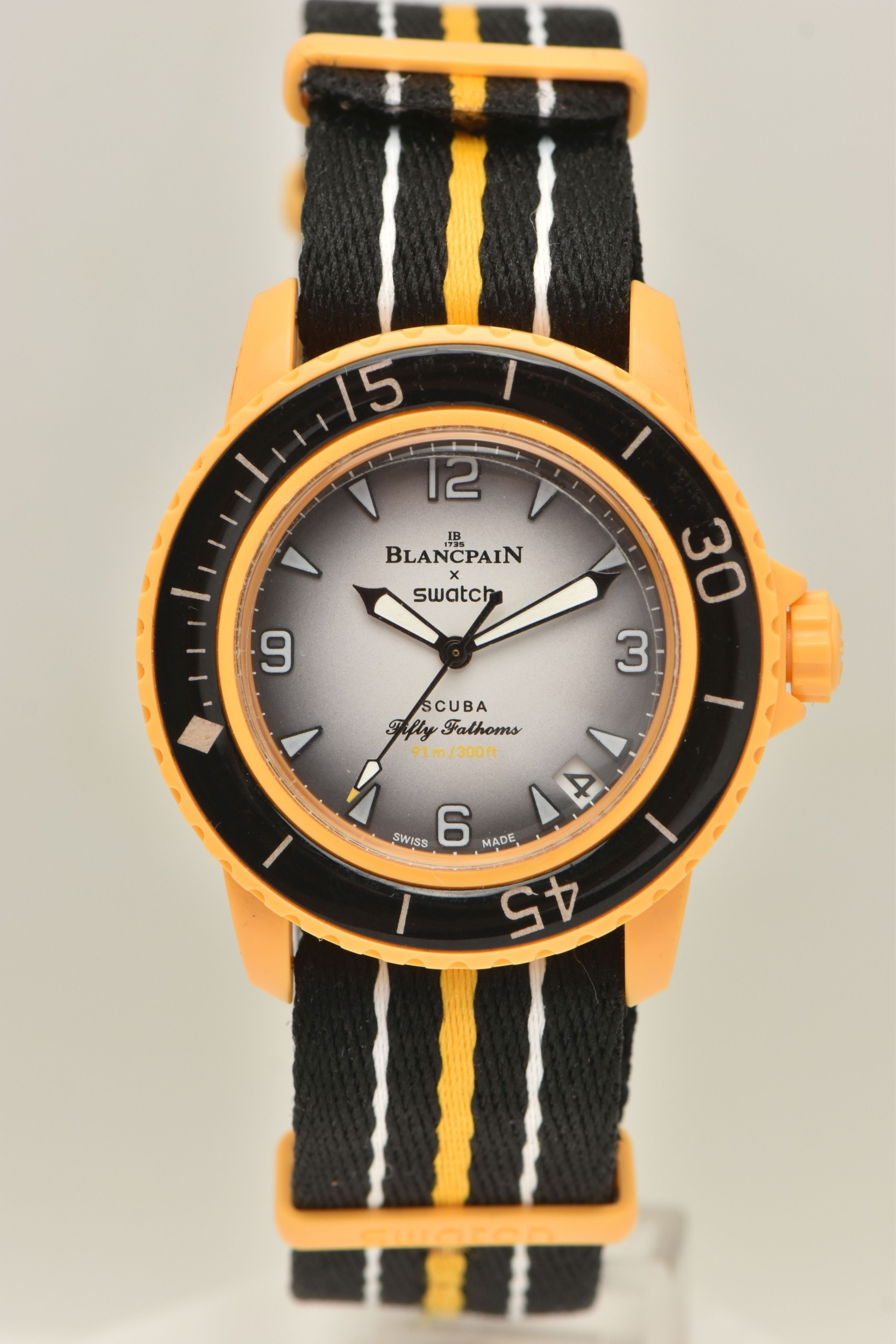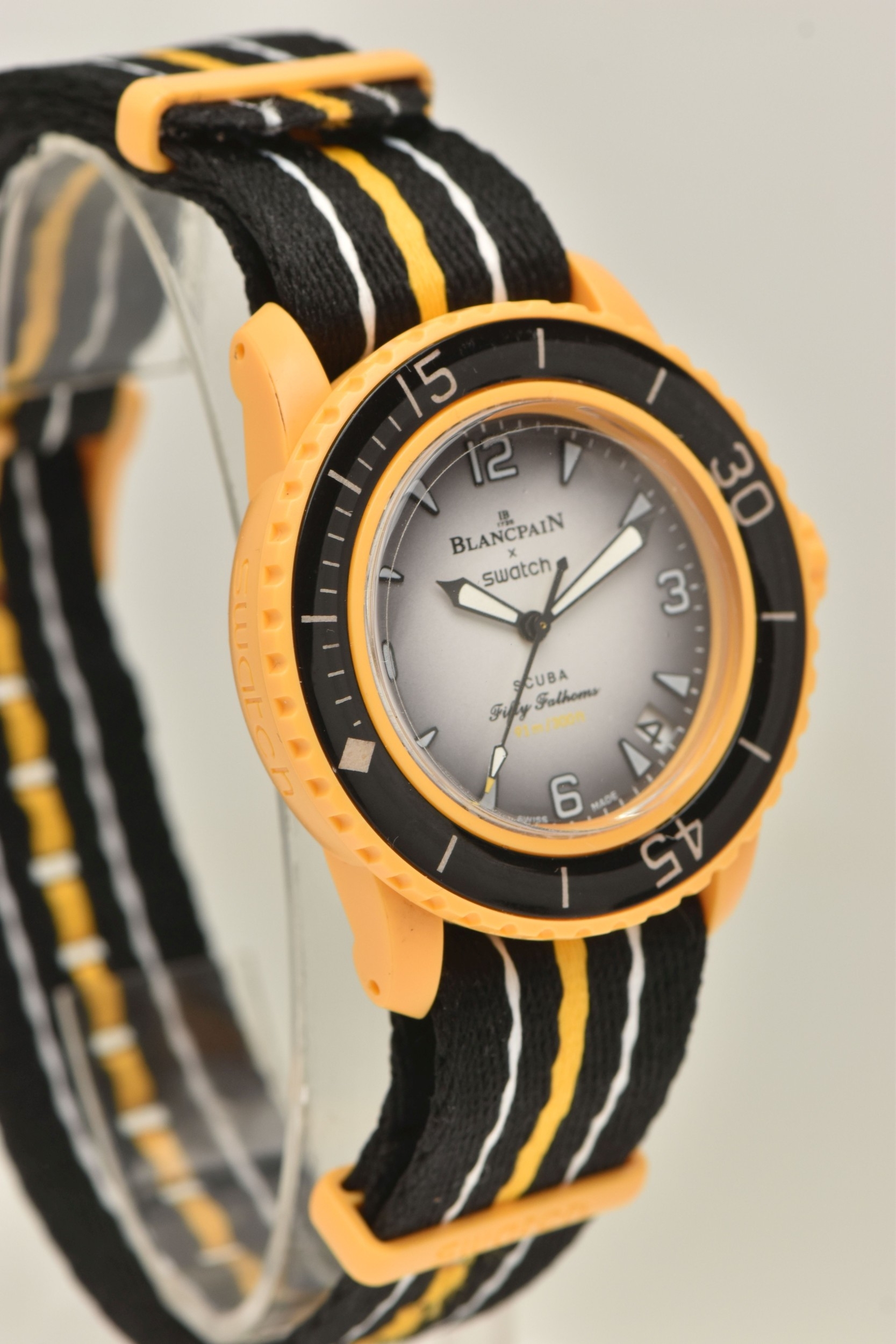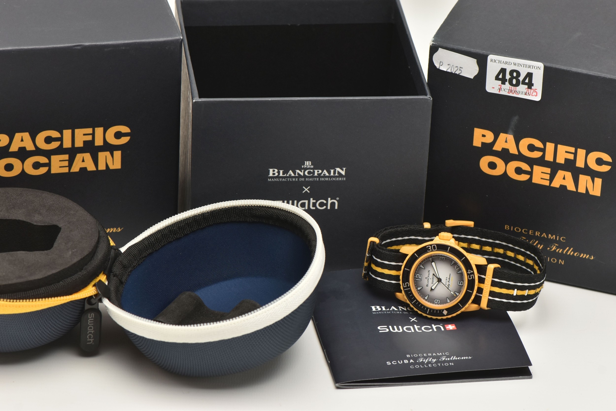 A 'BLANCPAIN X SWATCH' PACIFIC OCEAN BIOCERAMIC WRISTWATCH, quartz movement, round grey fade dial signed 'Blancpain x Swatch' Scuba Fifty Fathoms 91m 300ft, Arabic numerals and baton markers, date aperture between the four and five o'clock position, rotating bezel, approximate case width 42mm, fitted with a fabric black and orange strap, together with case, outer box and booklets, (condition report: general light wear, not currently working, battery replacement required, we cannot guarantee the working condition of the watch)