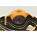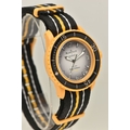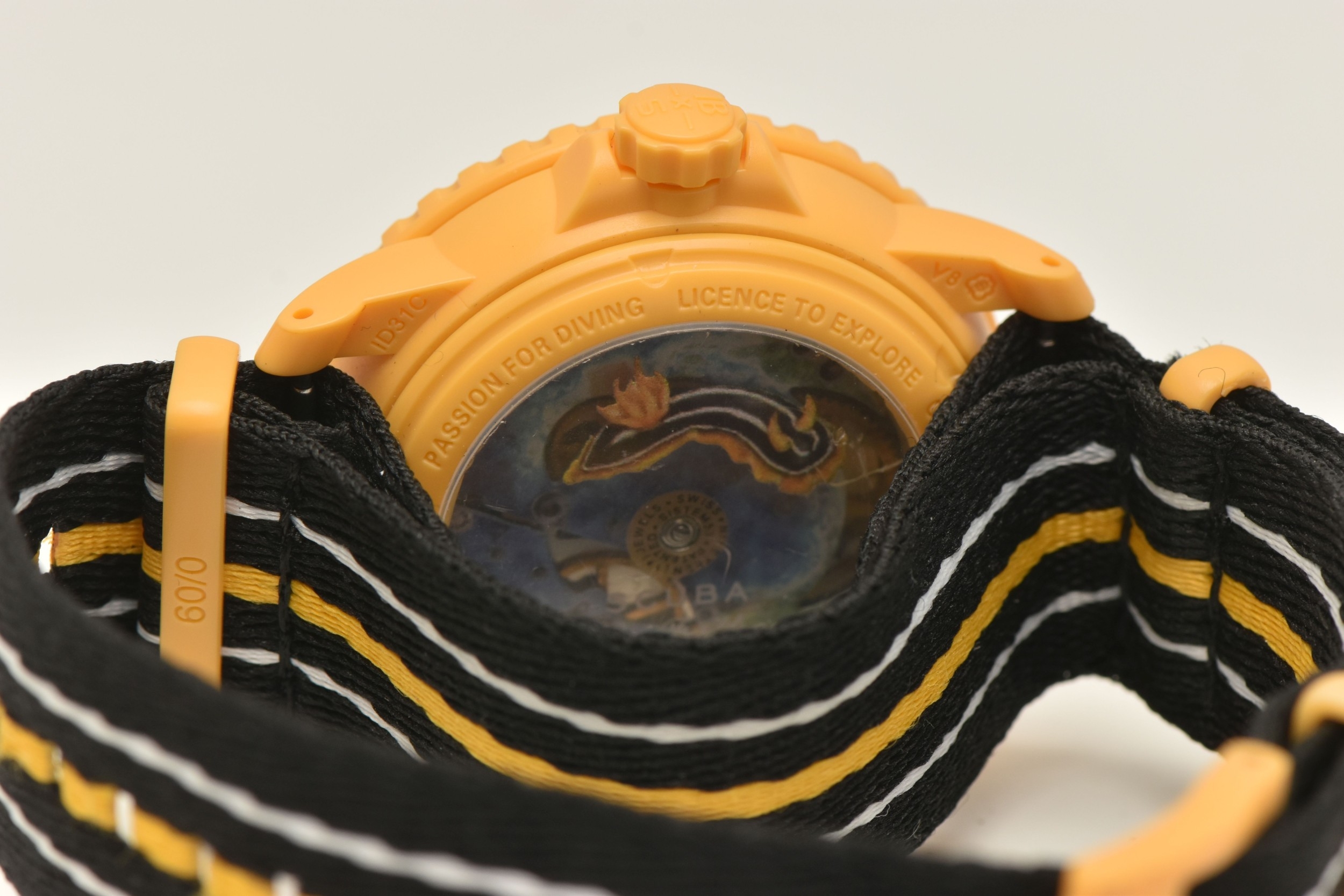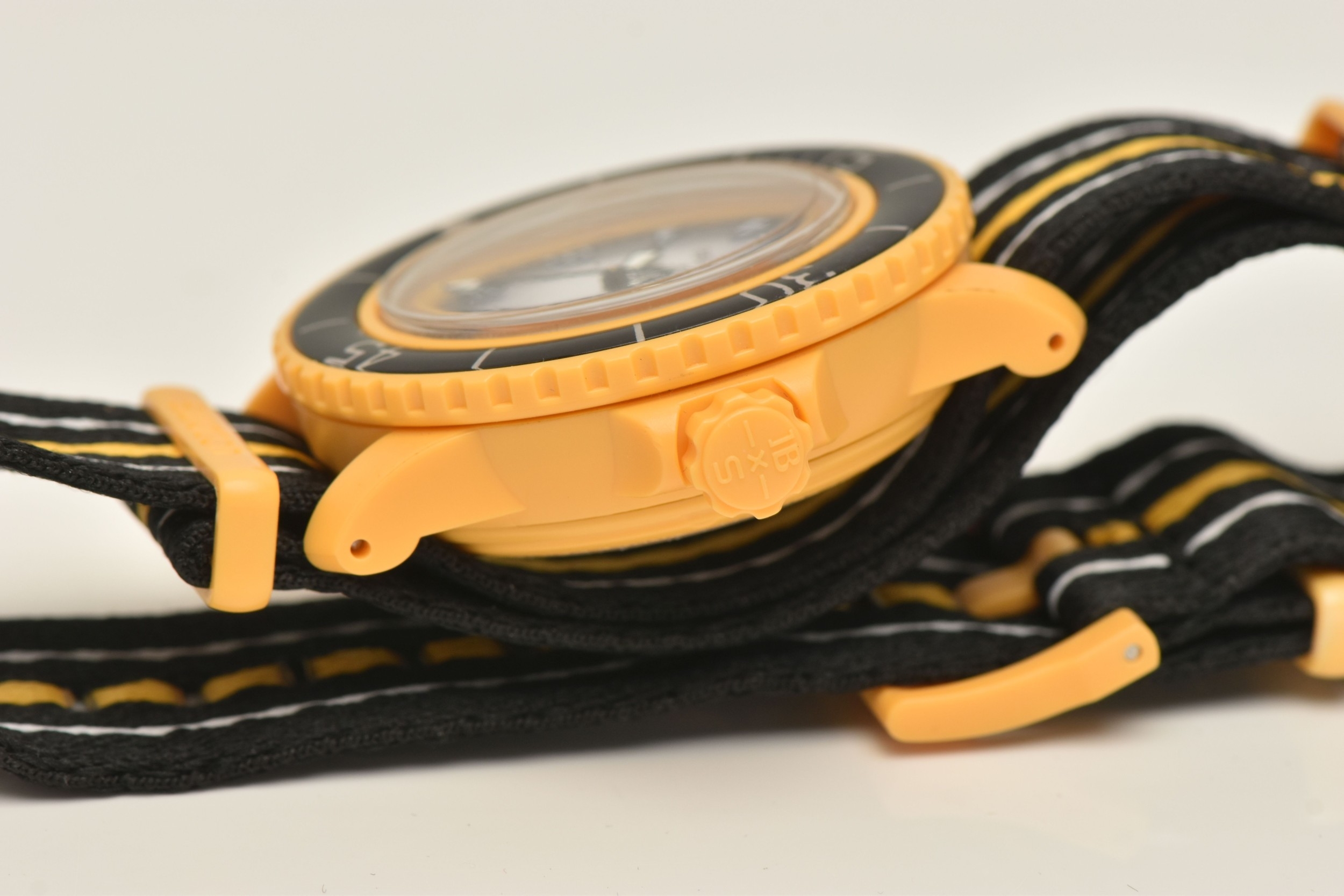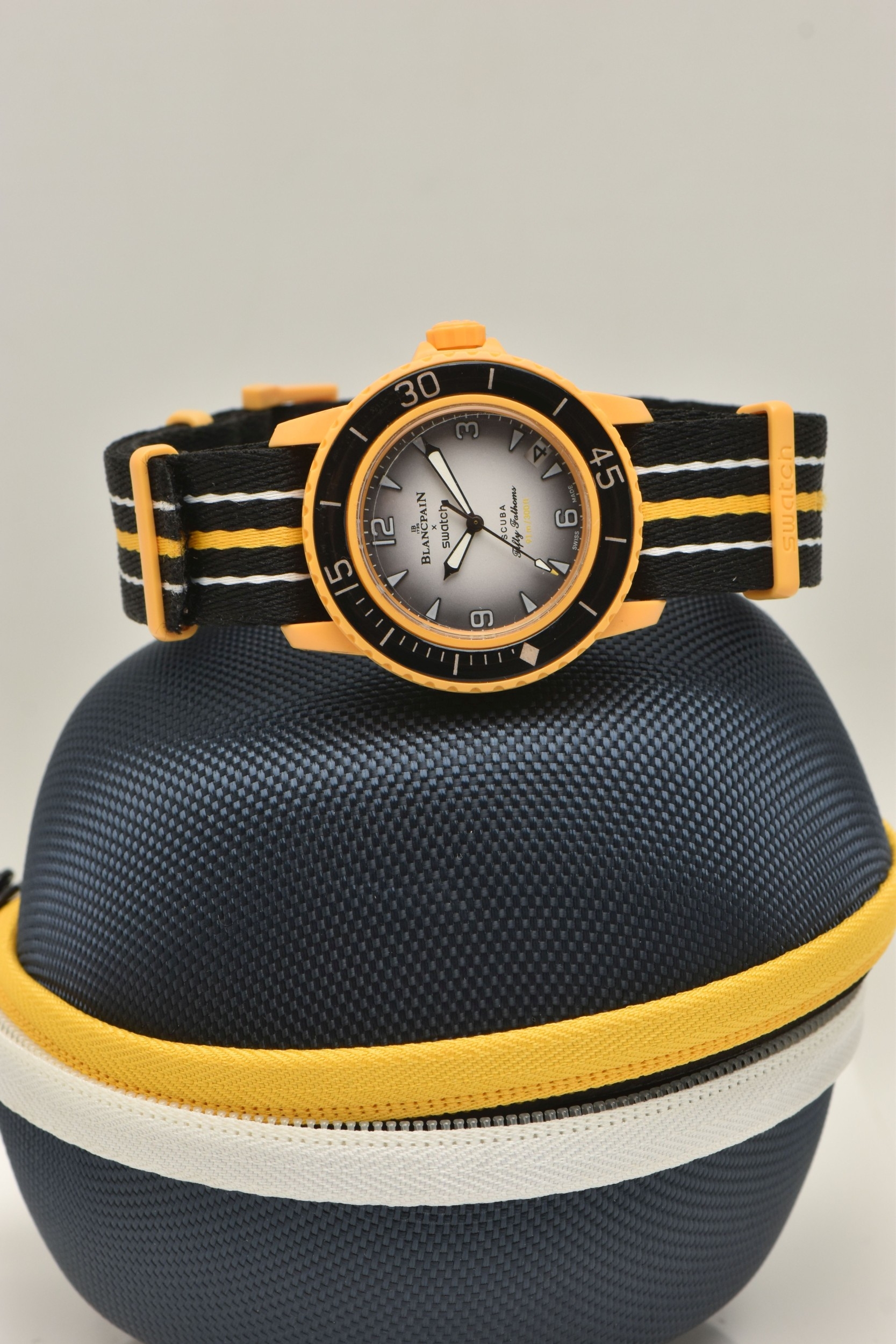 A 'BLANCPAIN X SWATCH' PACIFIC OCEAN BIOCERAMIC WRISTWATCH, quartz movement, round grey fade dial signed 'Blancpain x Swatch' Scuba Fifty Fathoms 91m 300ft, Arabic numerals and baton markers, date aperture between the four and five o'clock position, rotating bezel, approximate case width 42mm, fitted with a fabric black and orange strap, together with case, outer box and booklets, (condition report: general light wear, not currently working, battery replacement required, we cannot guarantee the working condition of the watch)