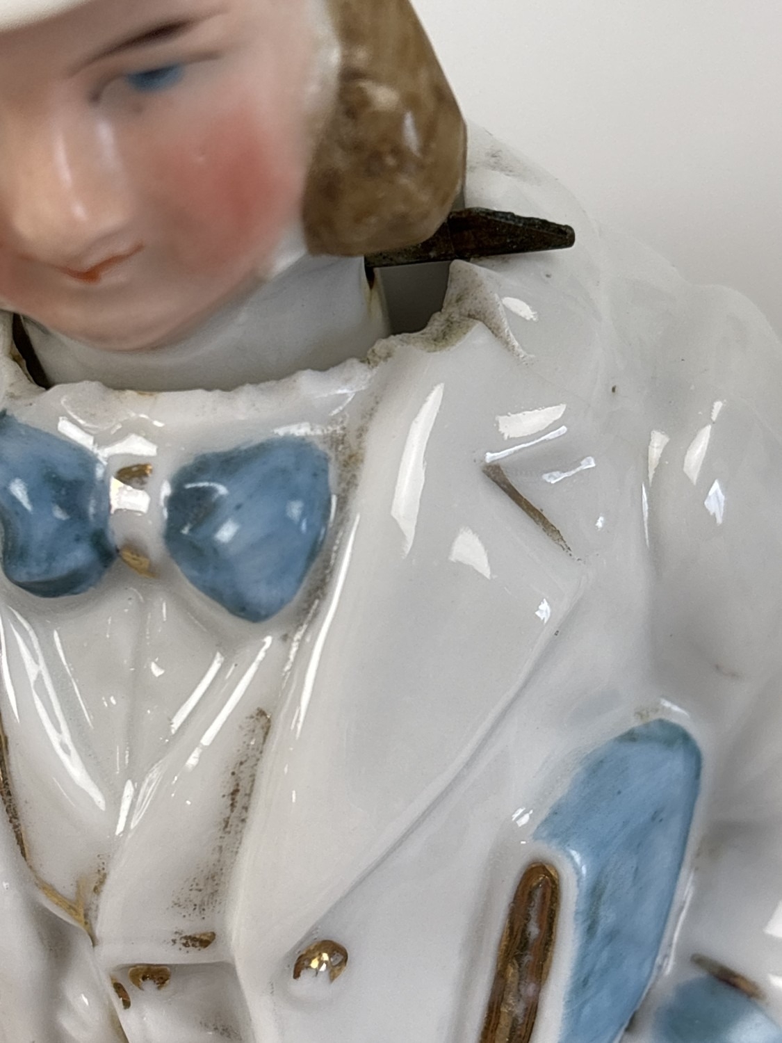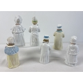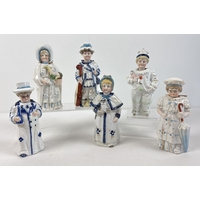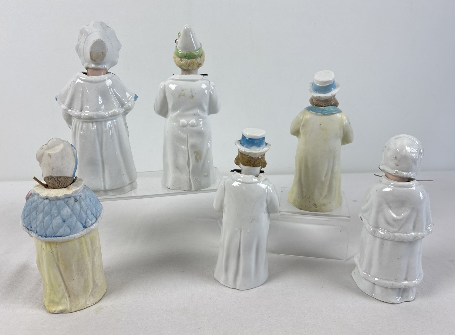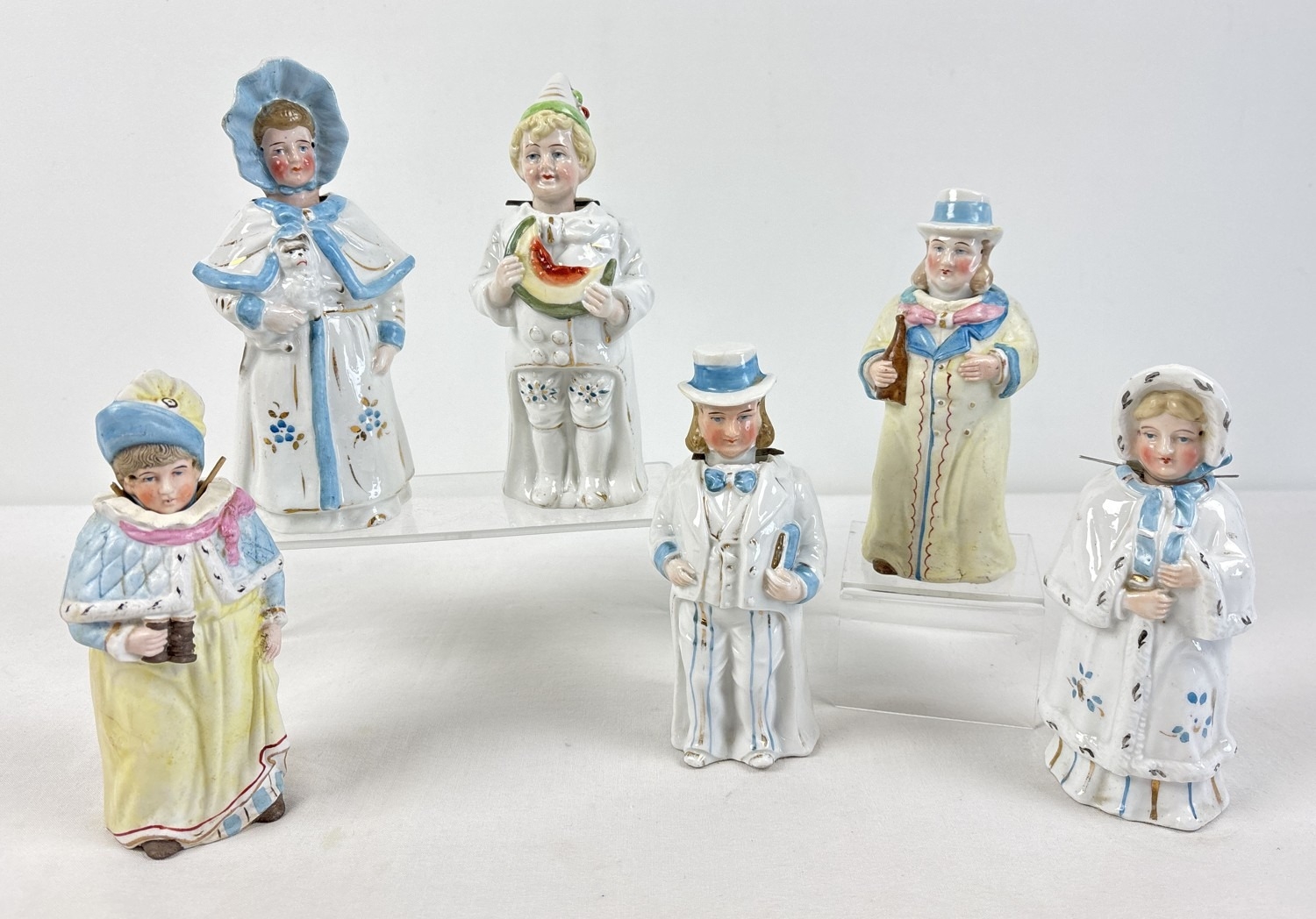 6 assorted antique bisque nodder figurines in varying designs and colours, to include a pair in yellow, pink & blue colours. All approx. 17-18cm tall.