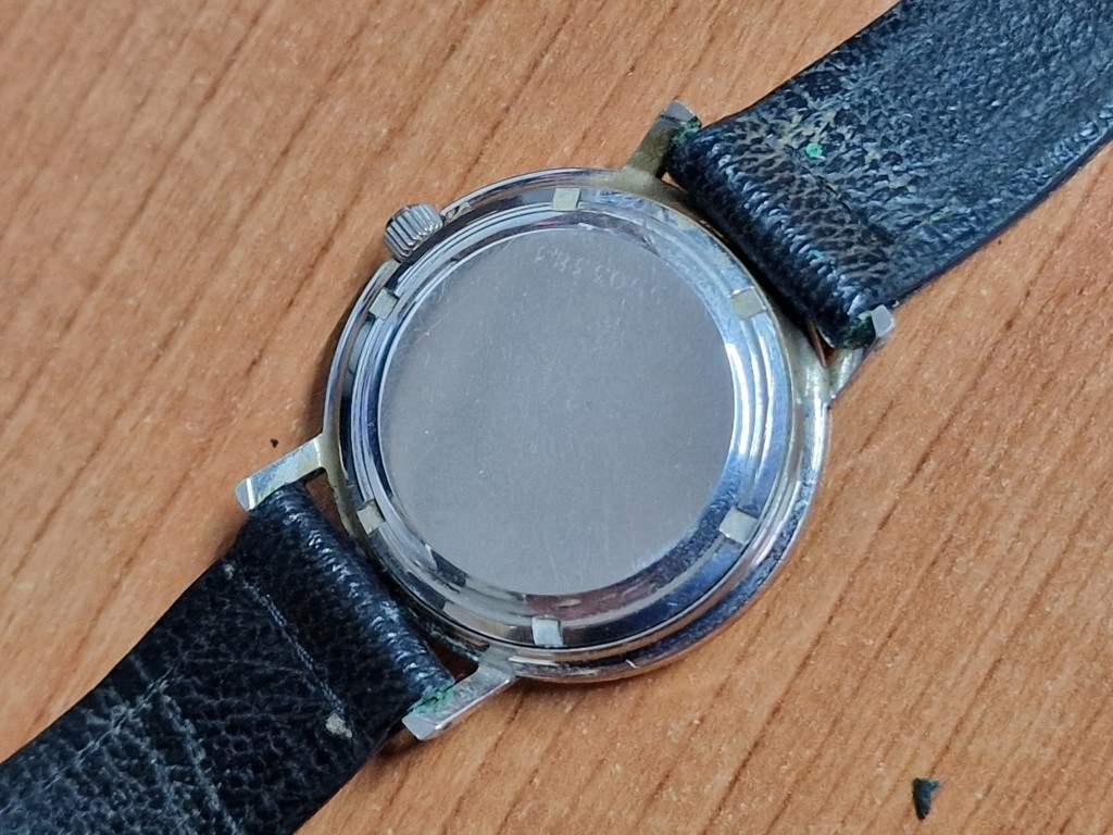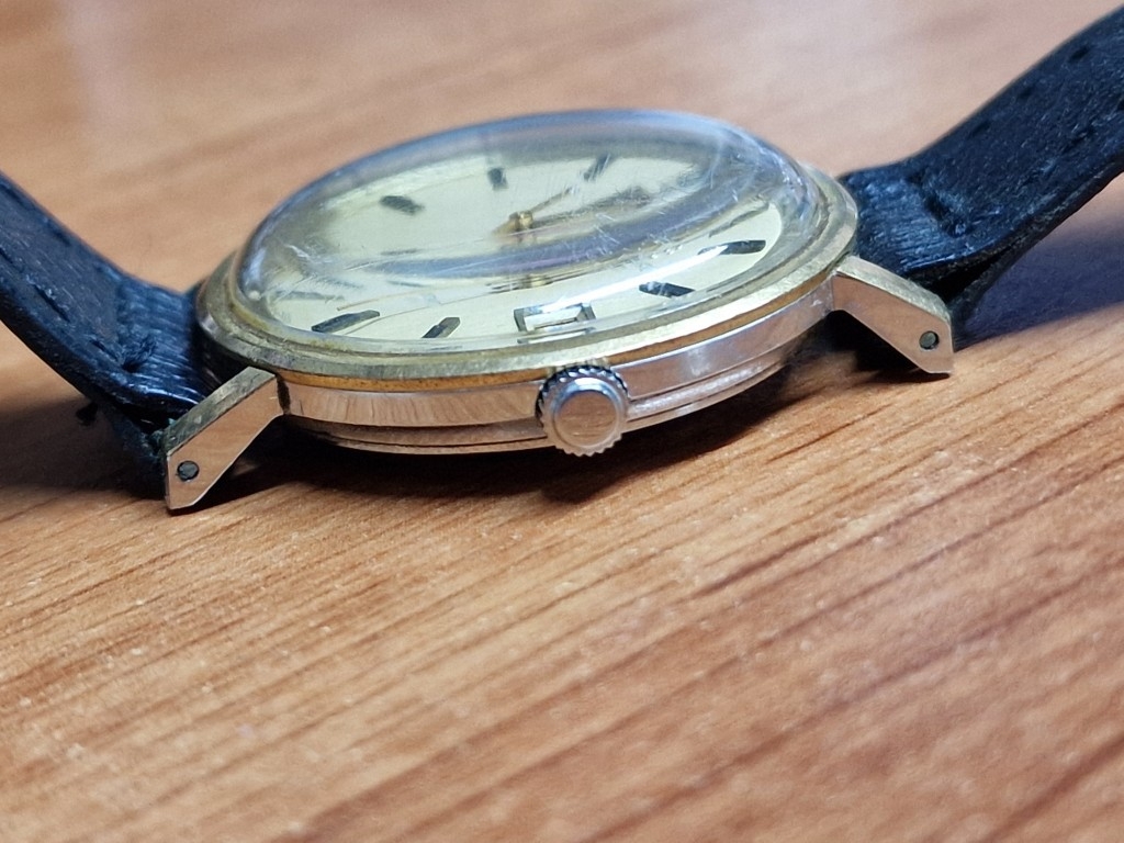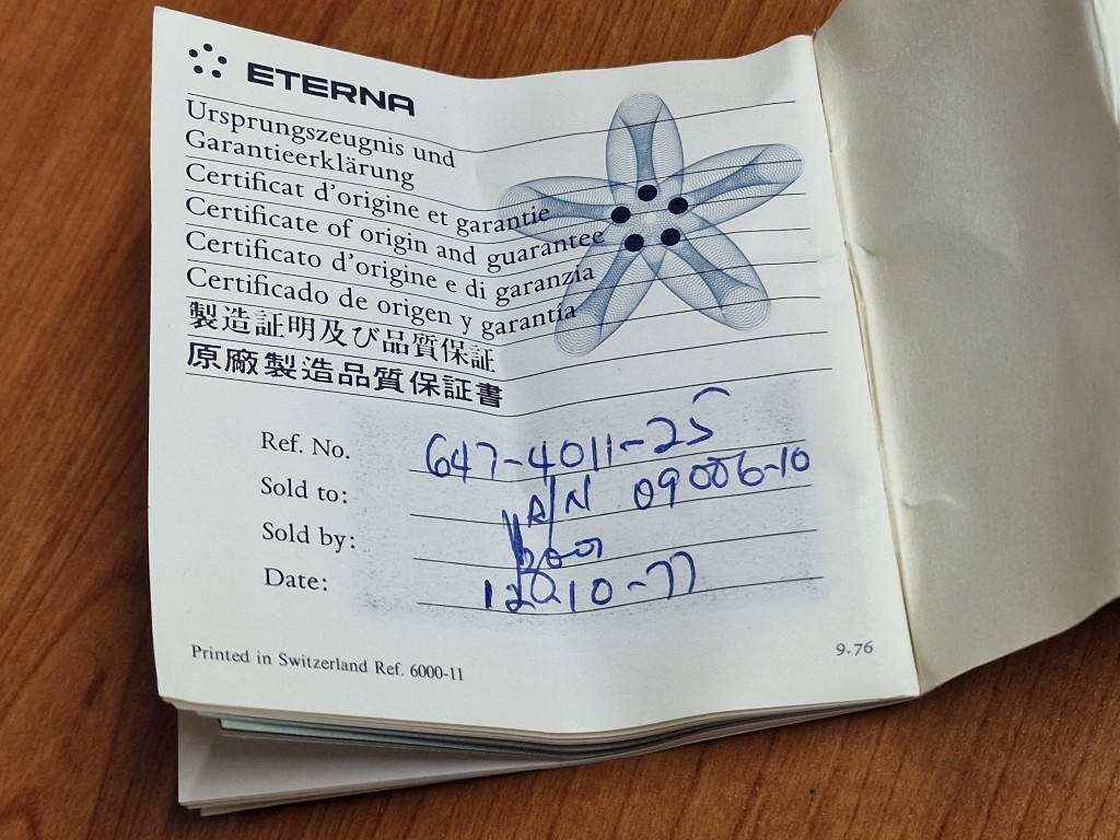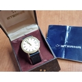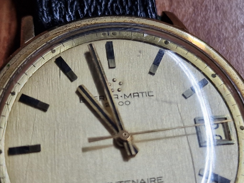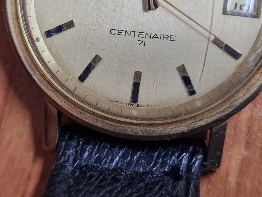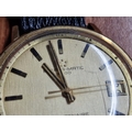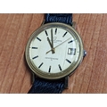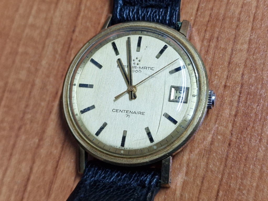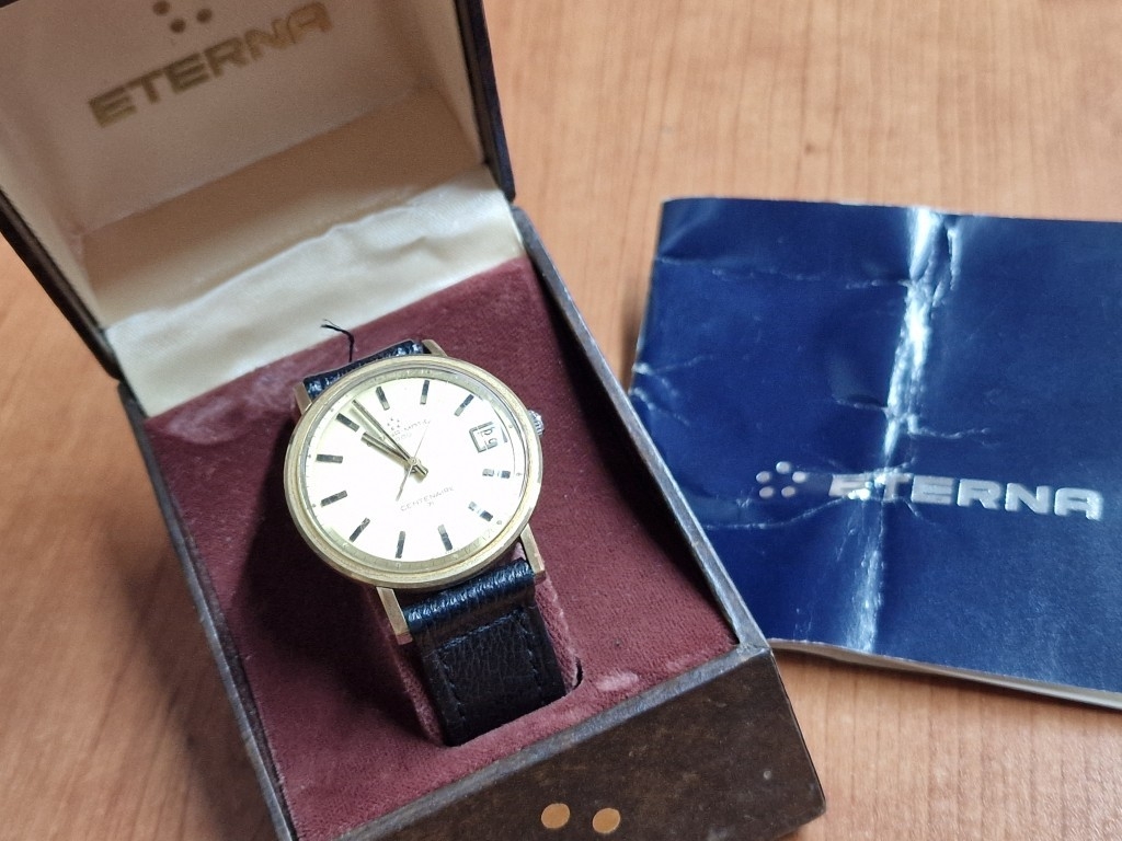 Eterna-Matic 'Centenaire 71' Vintage Gent's Wrist Watch, Automatic, Date, Baton Hour Markers, Gold Tone Case and Face on Black Leather Strap, with Original Box and Papers, Dated 1977 * Running When Lotted *