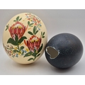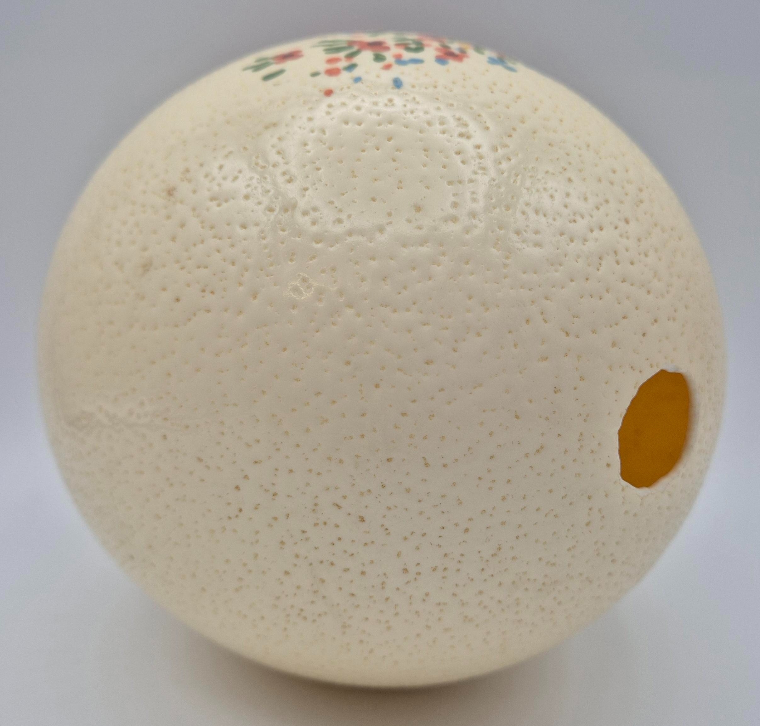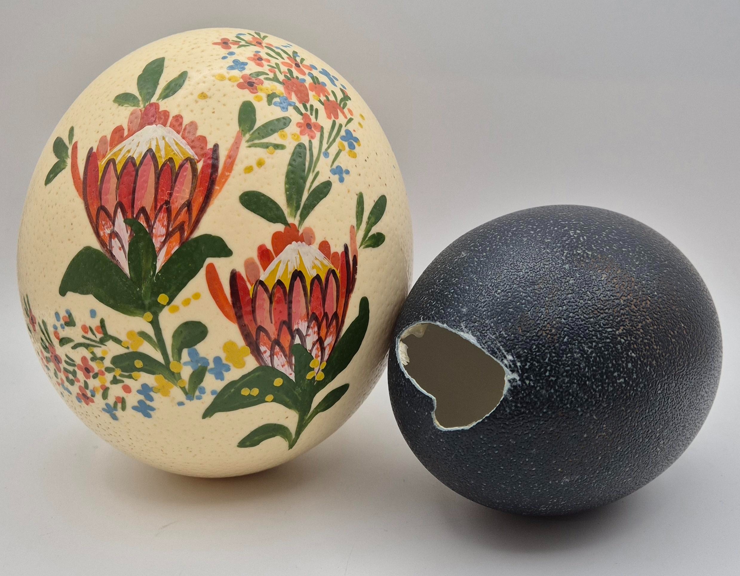 Two hollowed eggs. To include a hand-painted Ostrich egg & Emu egg (with damage).