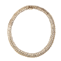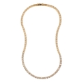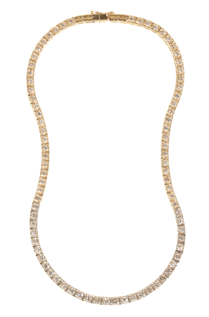 A DIAMOND LINE NECKLACE, eighty-one brilliant-cut diamonds, thirty-one claw-set in white gold, flanked either side with twenty-six, and twenty-four brilliant-cut diamonds claw-set in yellow gold, approx 5.67ct total weight, the box clasp stamped "750", 41cm long, approx 48grams total weight
