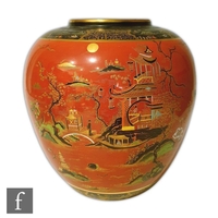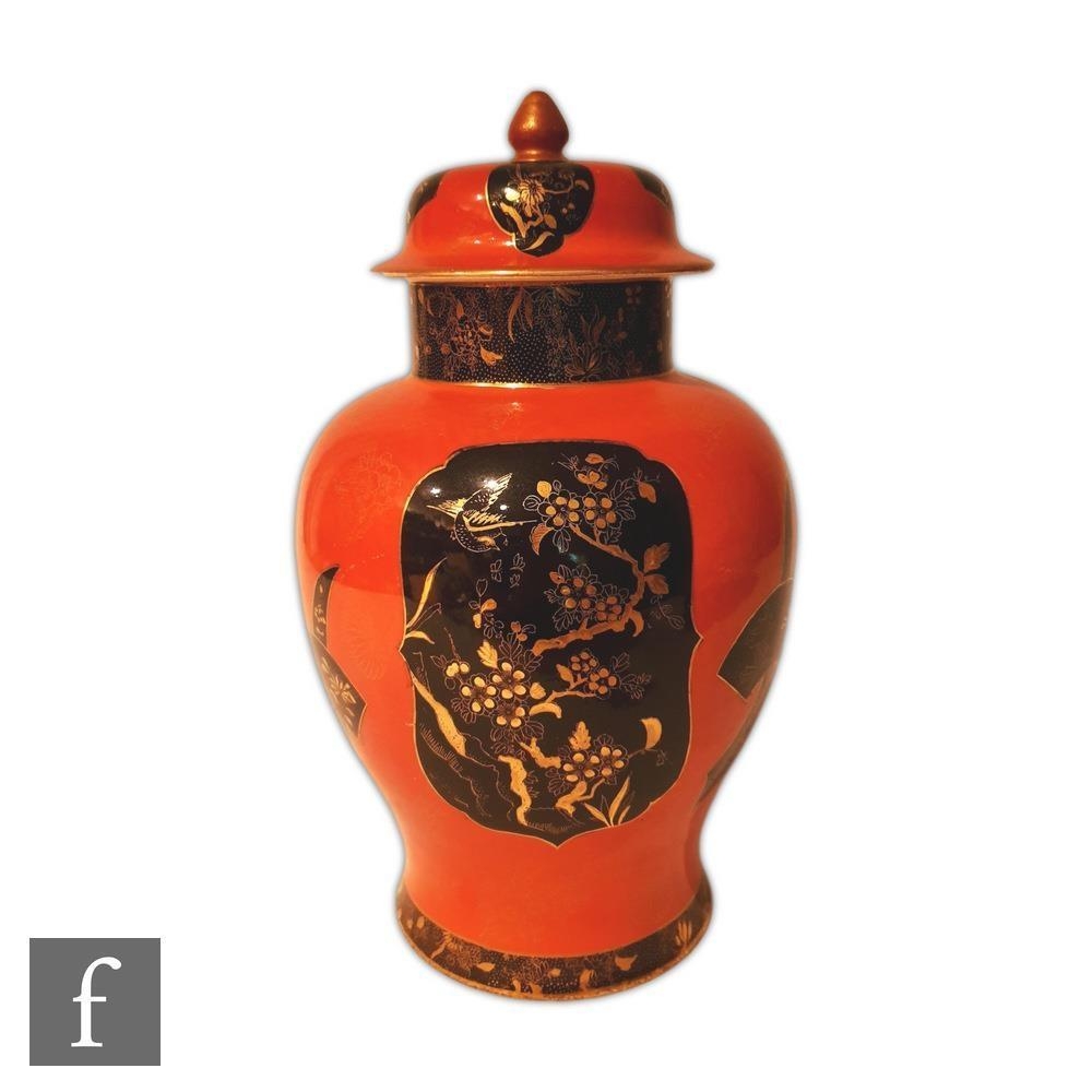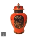 A 1920s Wiltshaw and Robinson Carlton Ware Kien Lung vase and cover decorated with black and gilt cartouche in the Aesthetic style against a red ground, printed marks, height 34cm, S/D.