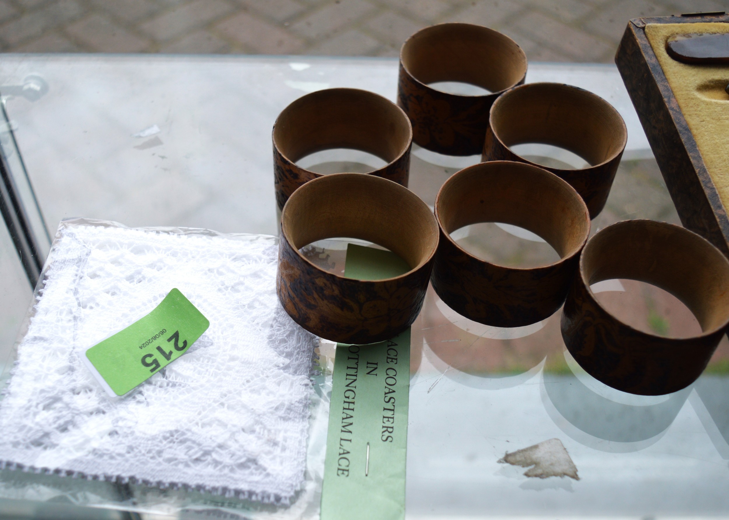 Set of Six Finely Decorated Wooden Napkin Rings, Plus a New in Packaging Set of Six Nottingham Lace Coasters