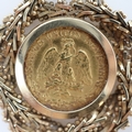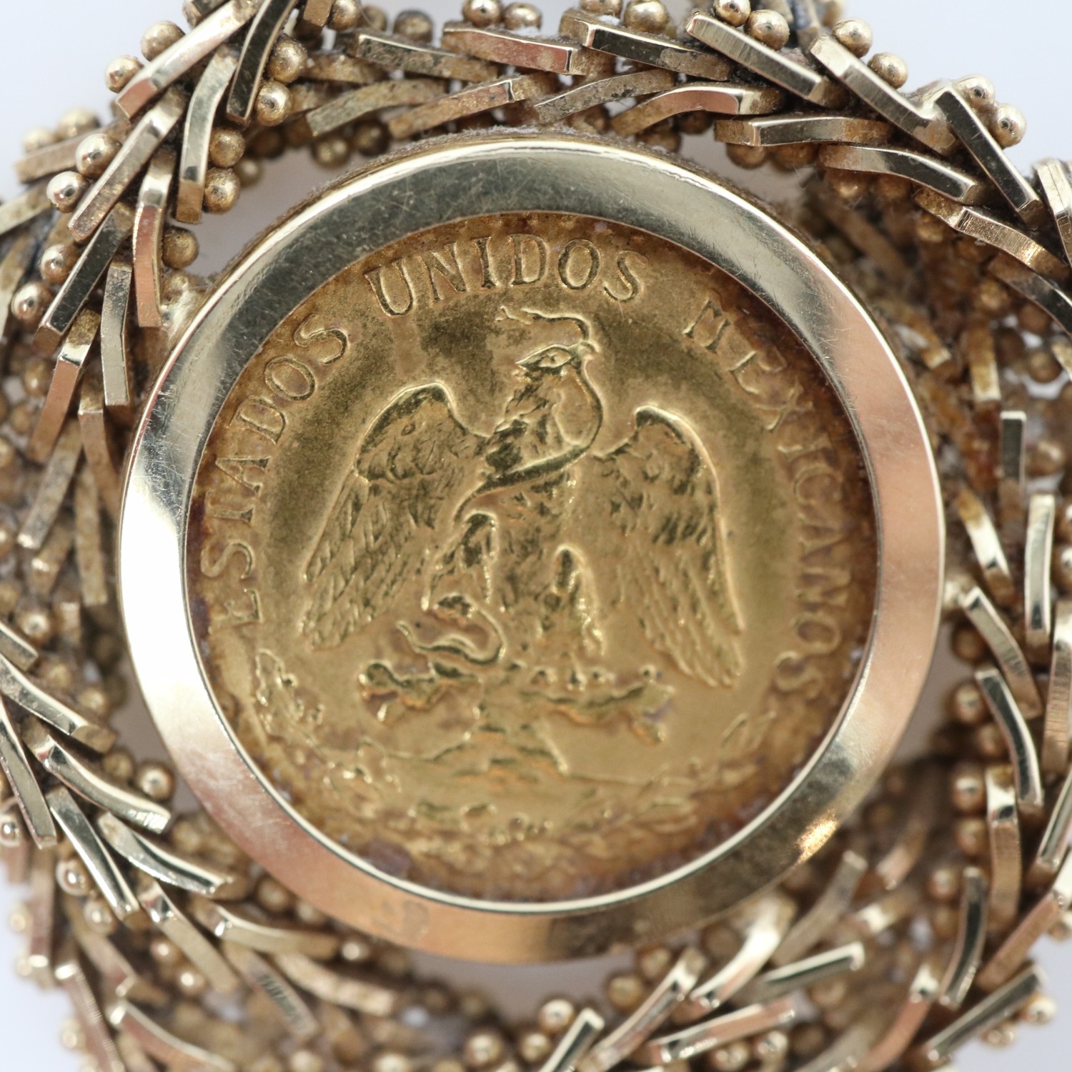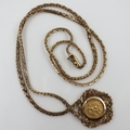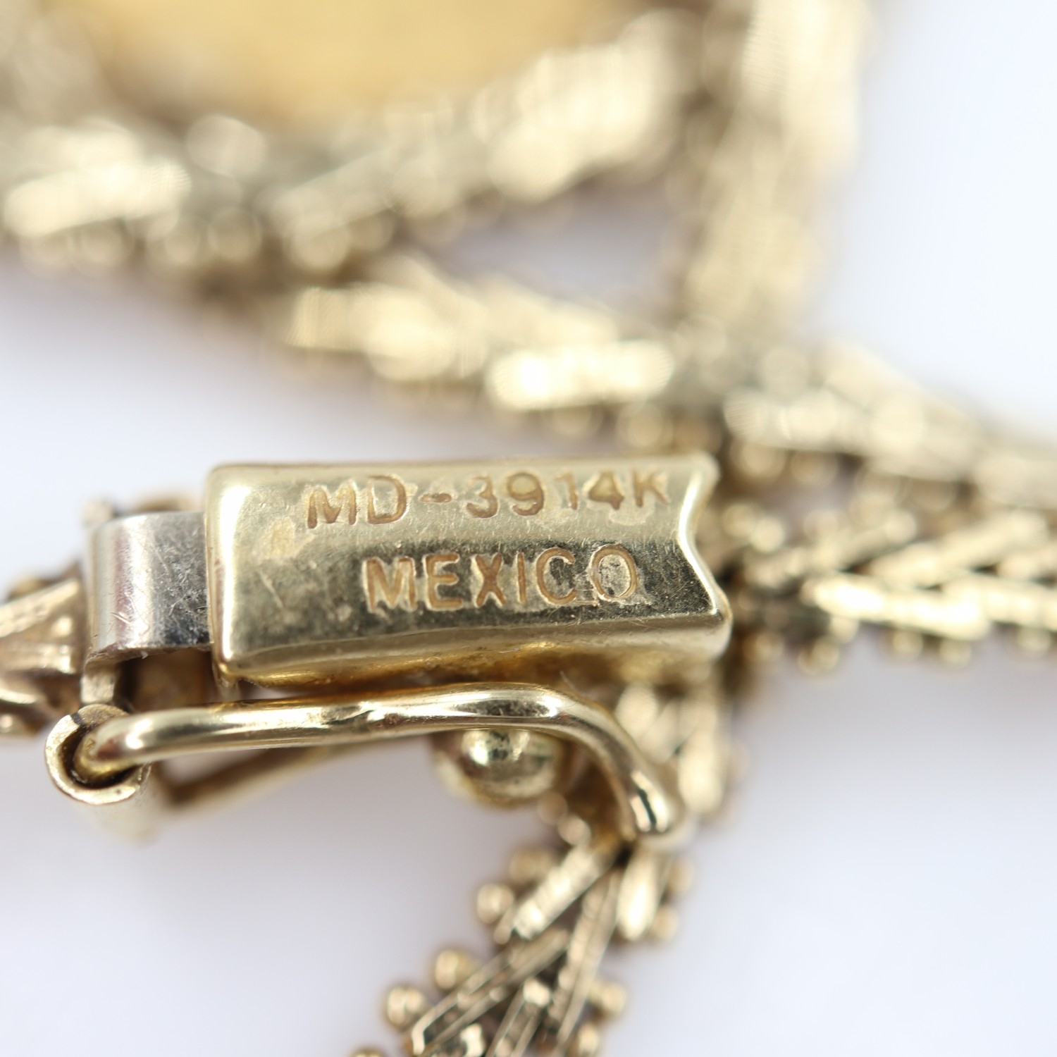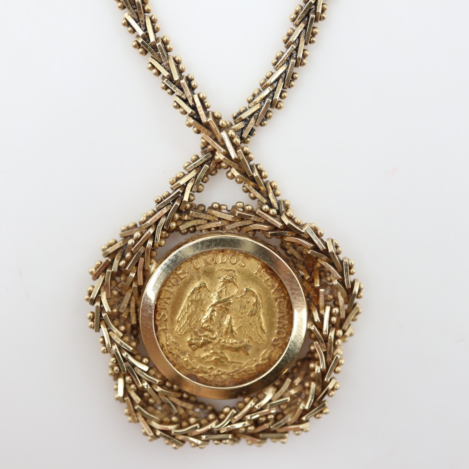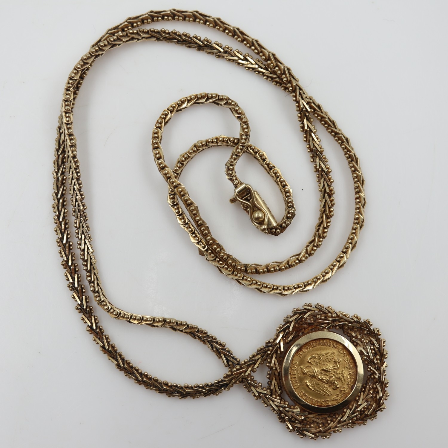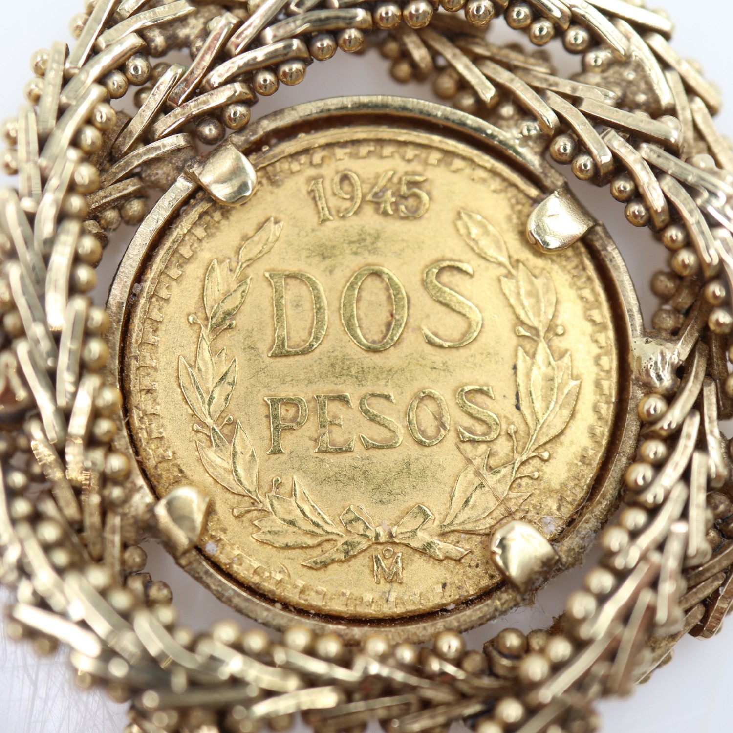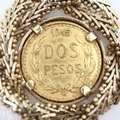 14ct gold ladies neck chain with 1945 Dos pesos pendant, L: 46cm, 18.3g. UK P&P Group 1 (£18+VAT for the first lot and £2+VAT for subsequent lots)