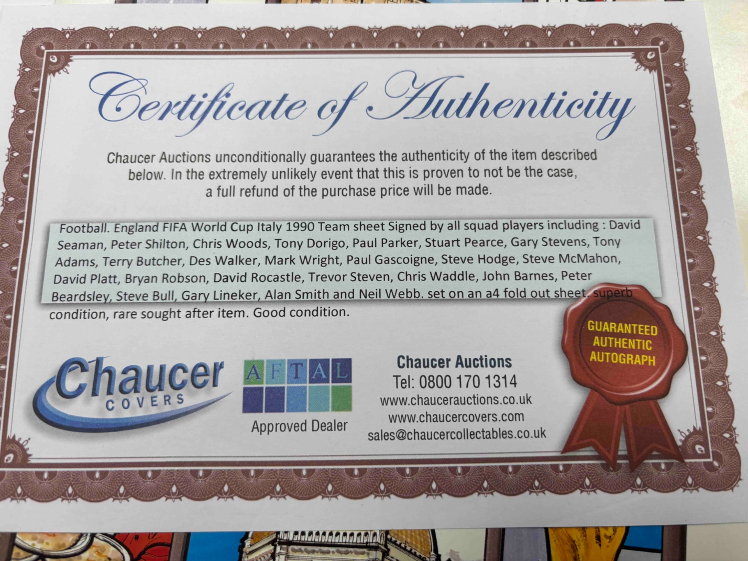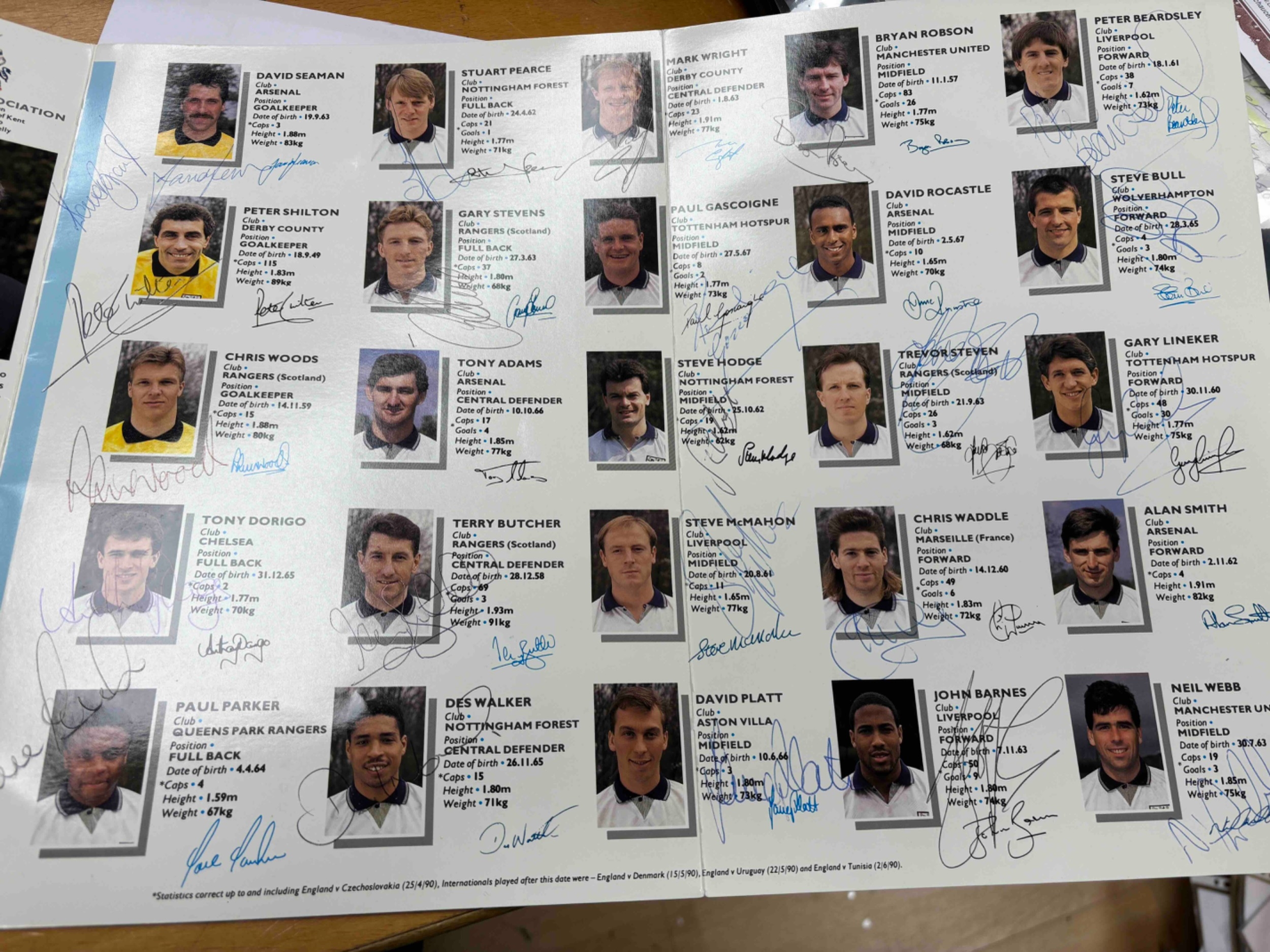 England Italia 90 Team Presentation, fully signed by all squad players including Gascoigne, Lineker, Shilton, Barnes, Beardsley, Bull, Robson, Platt. Full list on COA.