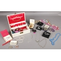 A jewellery box and collection of costume jewellery. Brooches, necklaces, beads etc.
