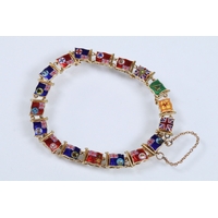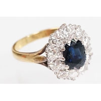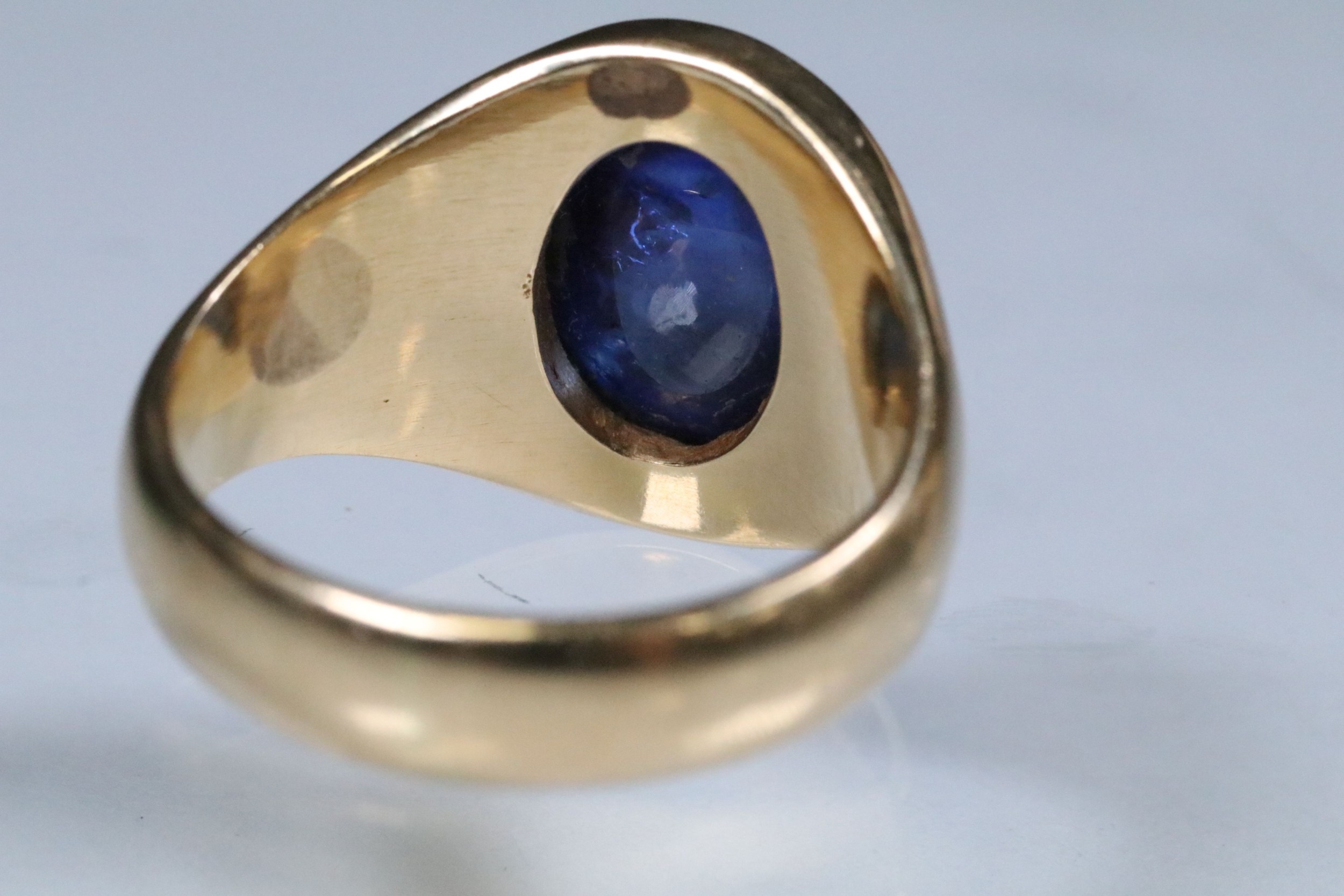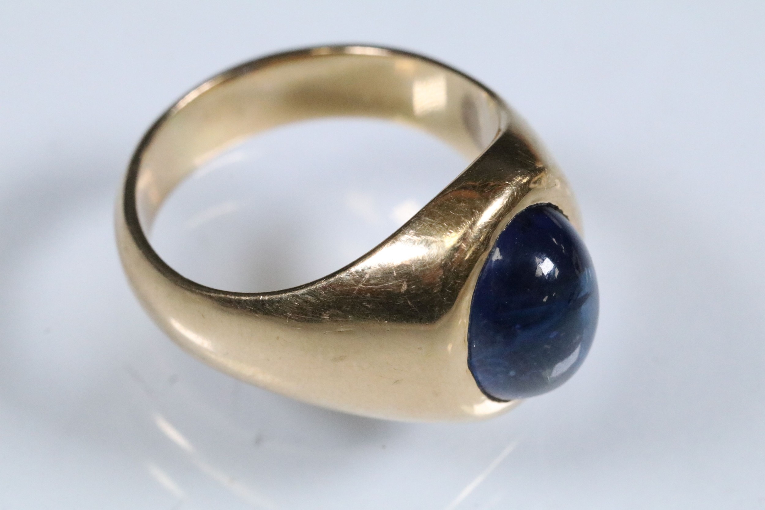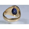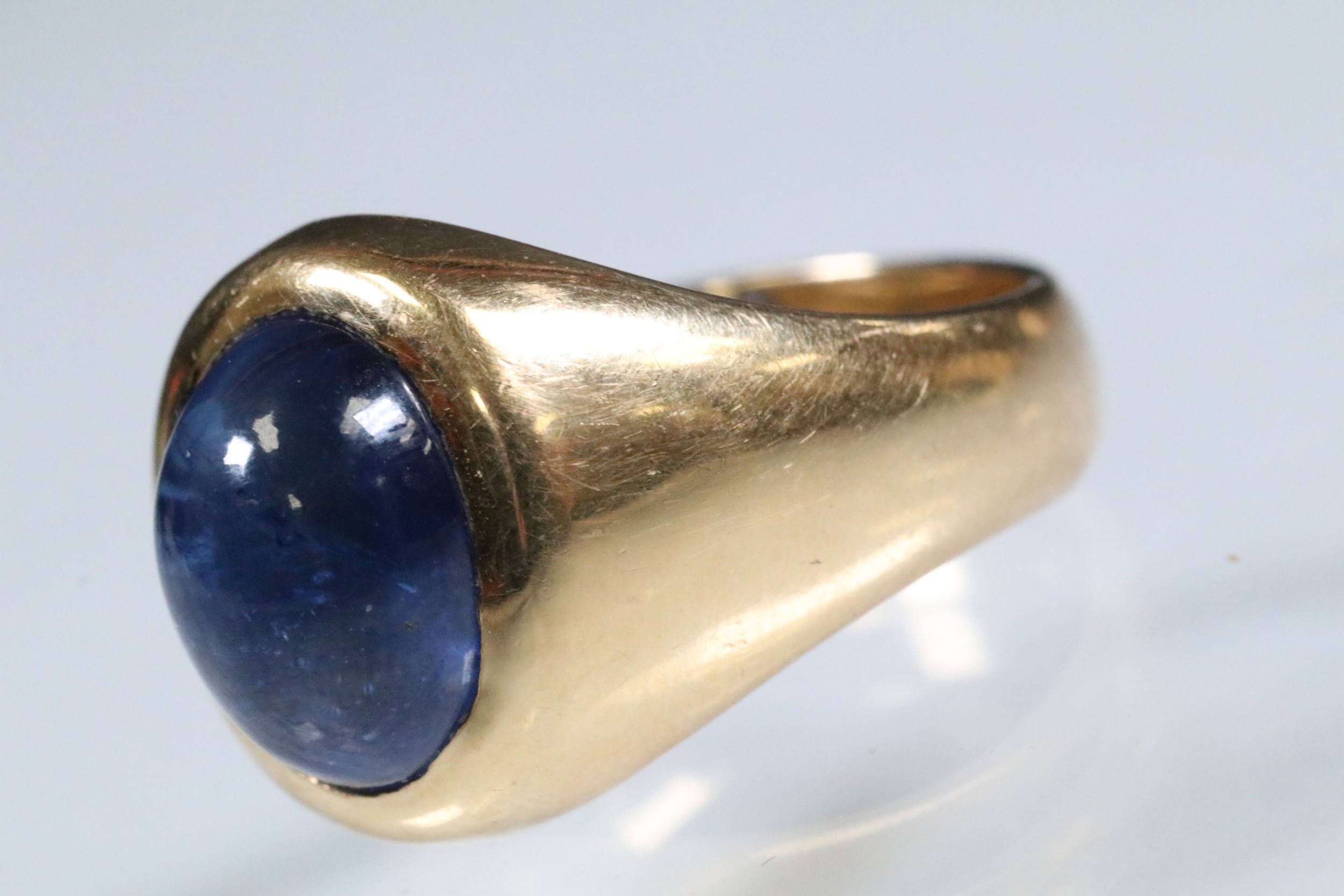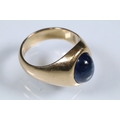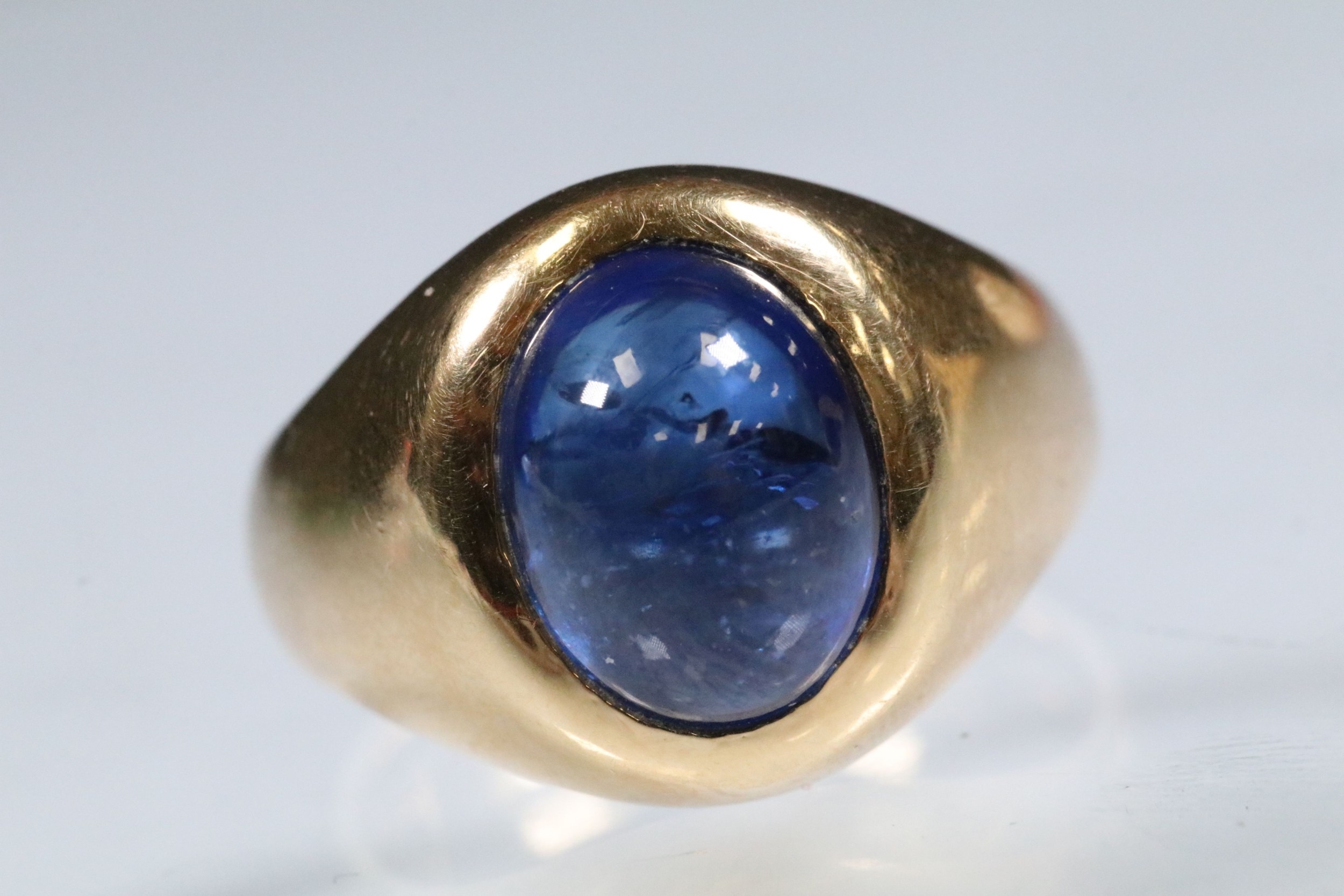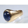 Blue sapphire single stone ring being bezel set with a large blue sapphire cabochon within a yellow metal ring mount. Ring unmarked, tests indicate 18ct gold. Sapphire measures approx 11 x 9 x 6 mm. Size Q.