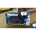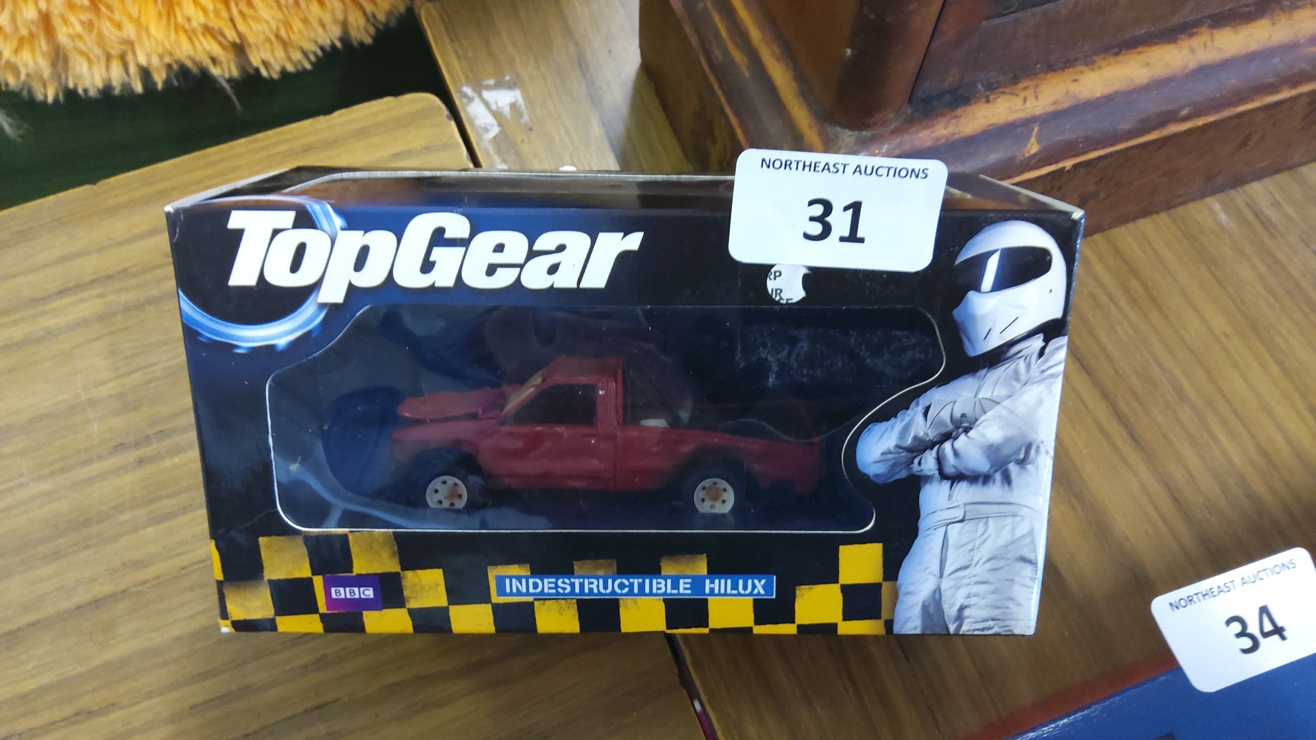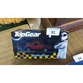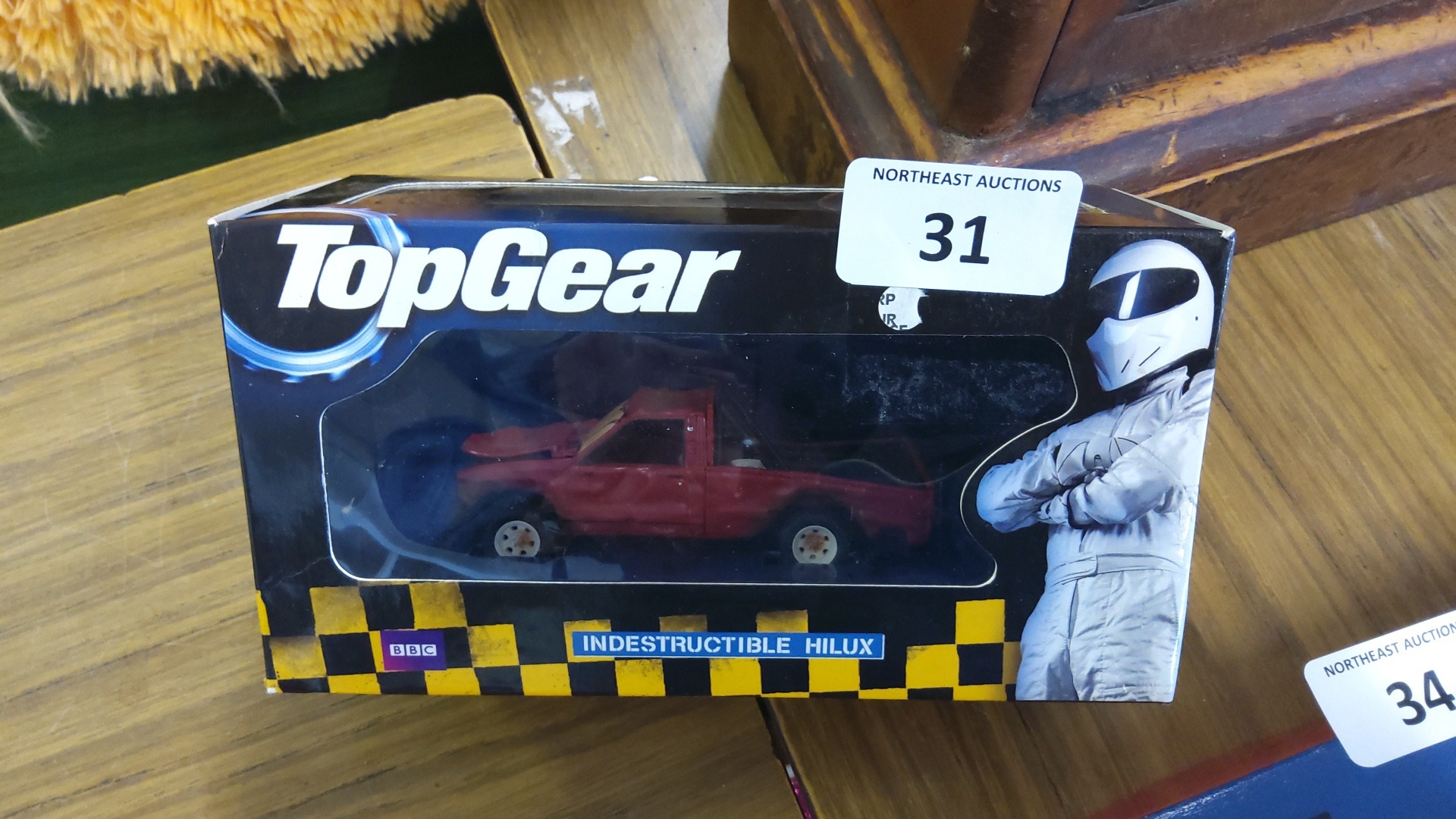 BBC Top Gear boxed die-cast model ‘Indestructible Hilux’—a red Toyota Hilux pickup within a window display carton, printed with The Stig and chequered livery.