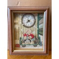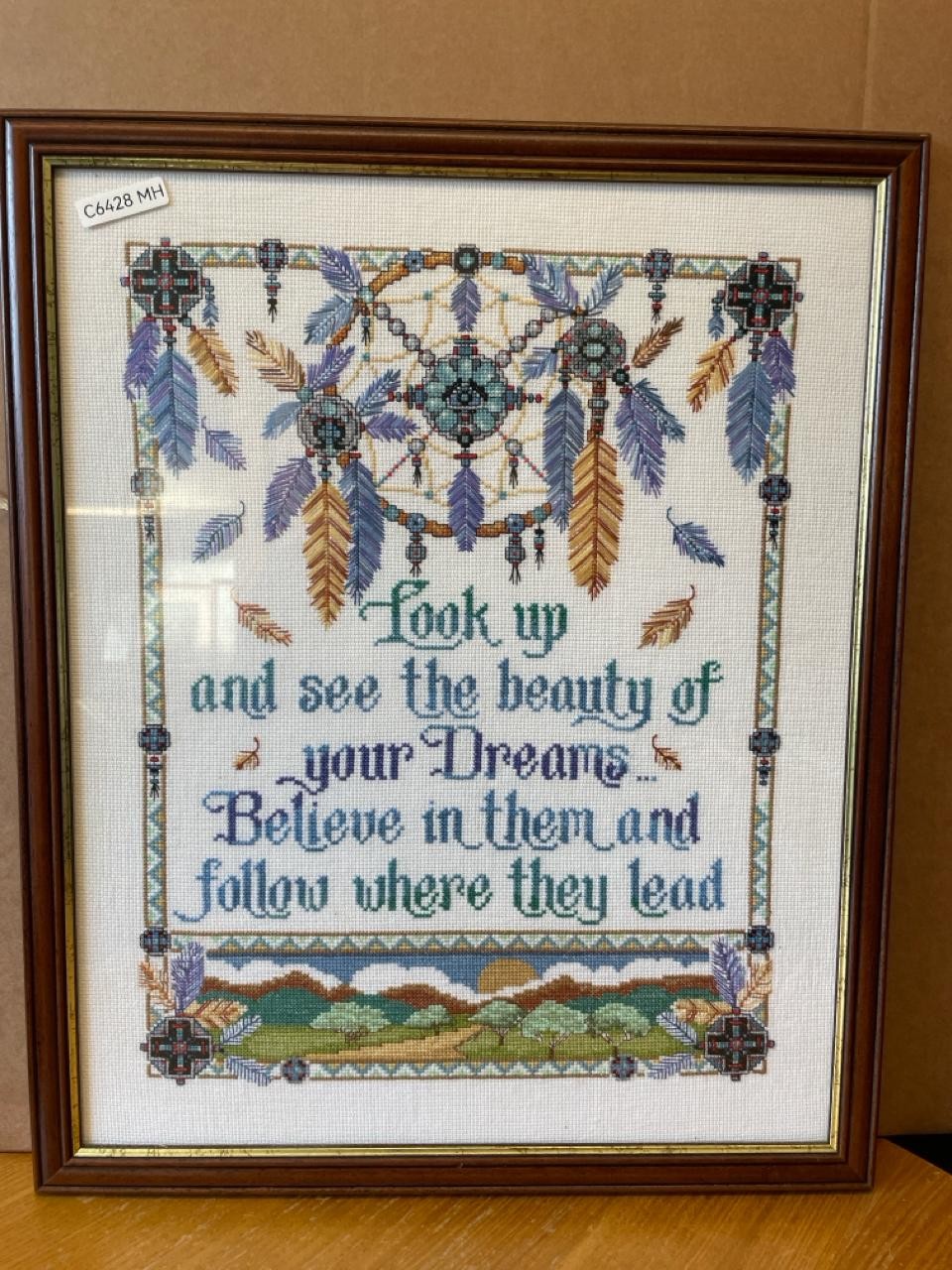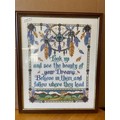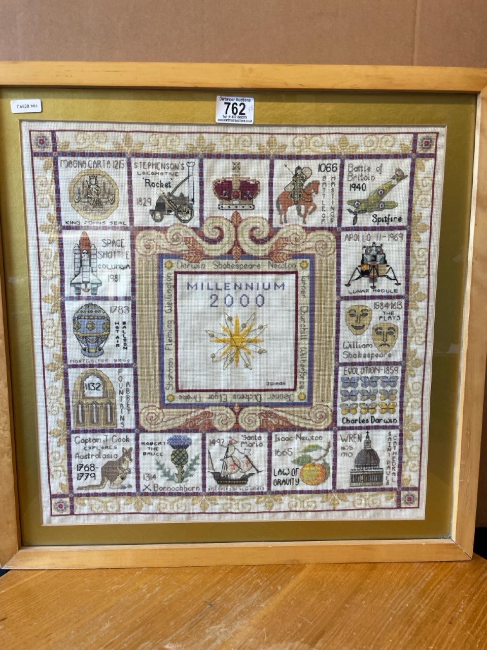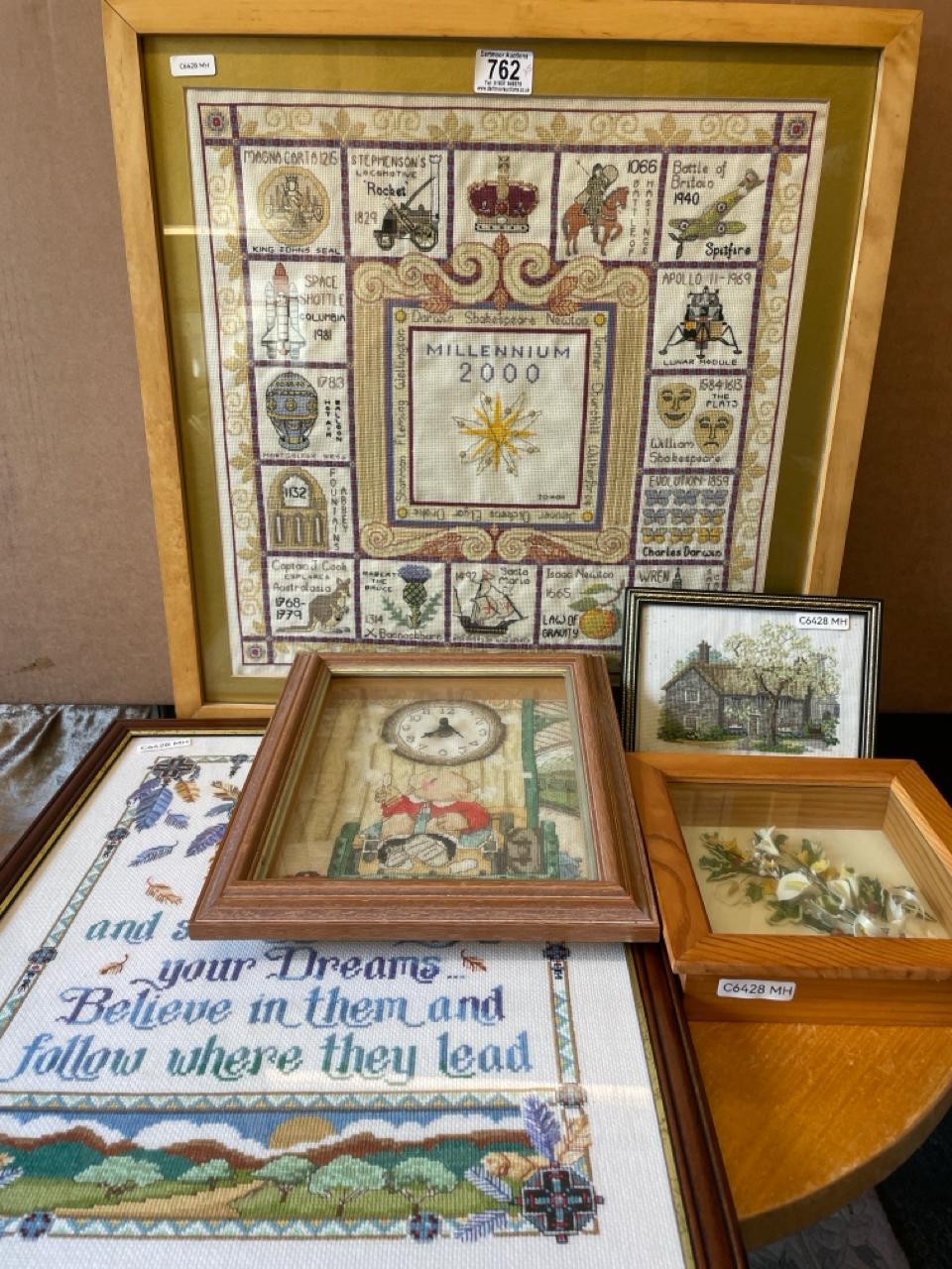 Four framed needlepoint Items including a Millennium sampler (frame approx H54cm x W54cm), child’s nursery clock (frame approx H26cm x W21cm), small house scene (frame approx H15cm x W20cm) and a motto (frame approx H50cm W41cm) plus a decoupage bouquet (frame approx H20cm x W20cm).