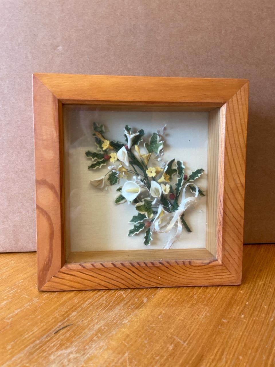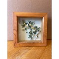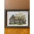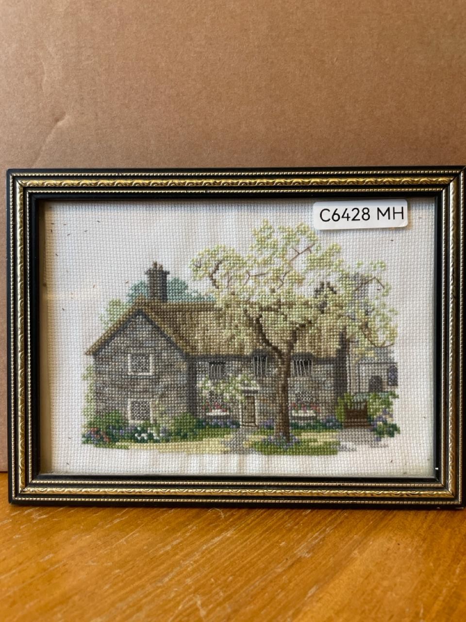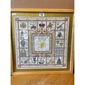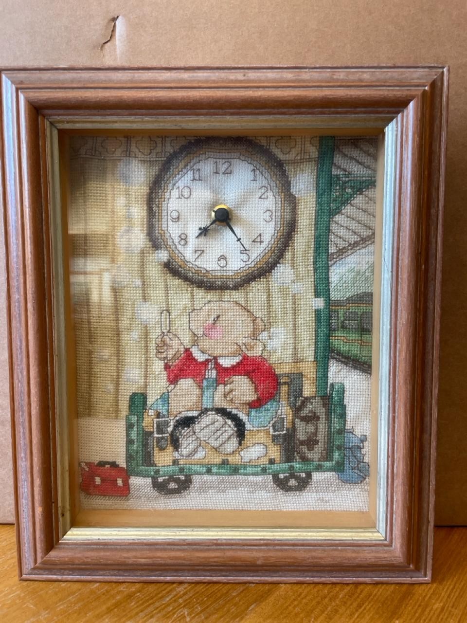 Four framed needlepoint Items including a Millennium sampler (frame approx H54cm x W54cm), child’s nursery clock (frame approx H26cm x W21cm), small house scene (frame approx H15cm x W20cm) and a motto (frame approx H50cm W41cm) plus a decoupage bouquet (frame approx H20cm x W20cm).