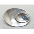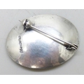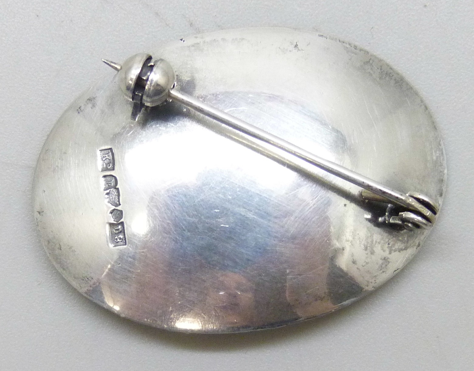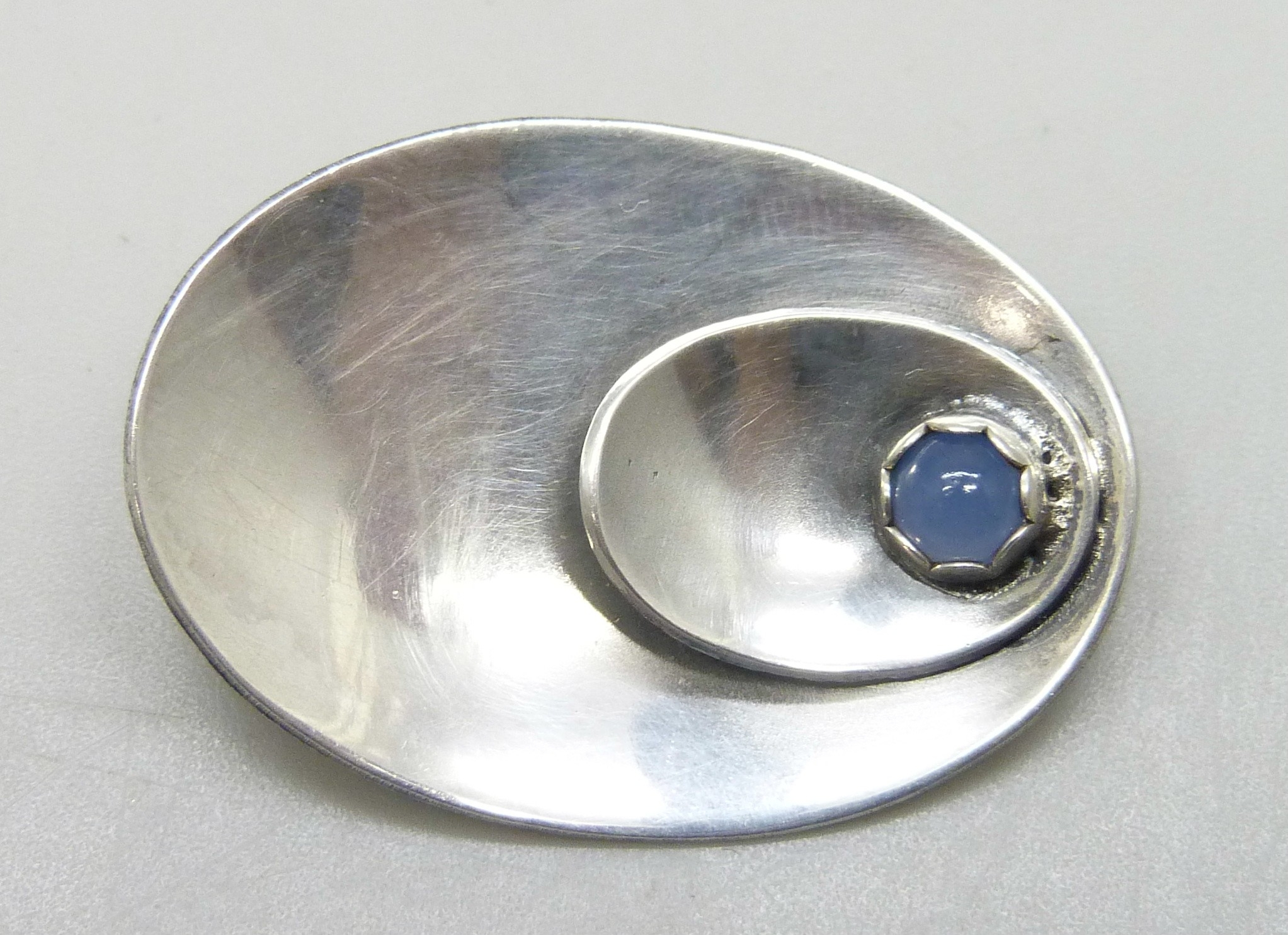 Alton Guldvaru Ab - Scandinavian jewellery, a 1950s silver Swedish brooch set with a cabochon cut chalcedony, Swedish hallmarks, KP, 1954, 3.5cm
