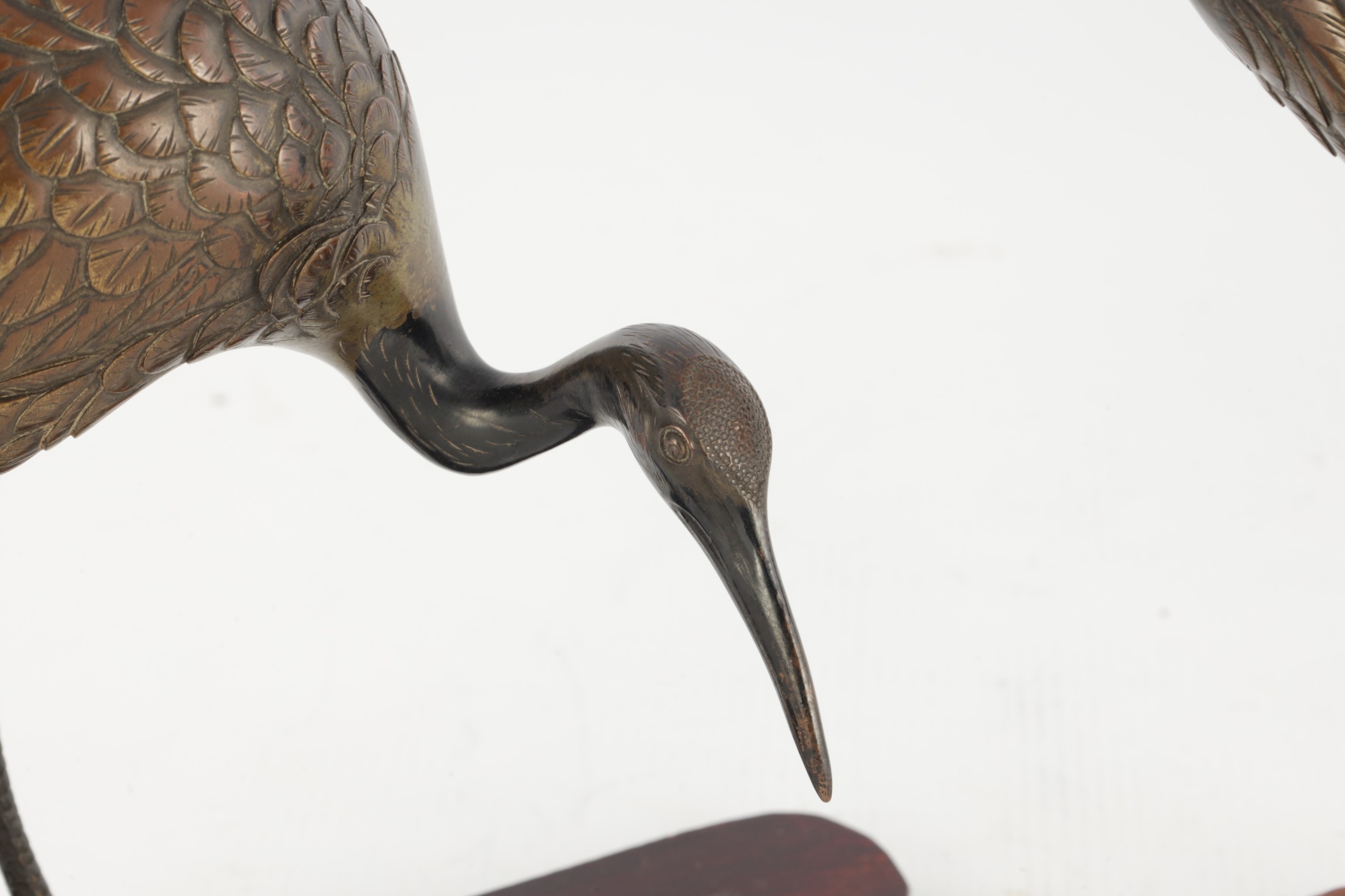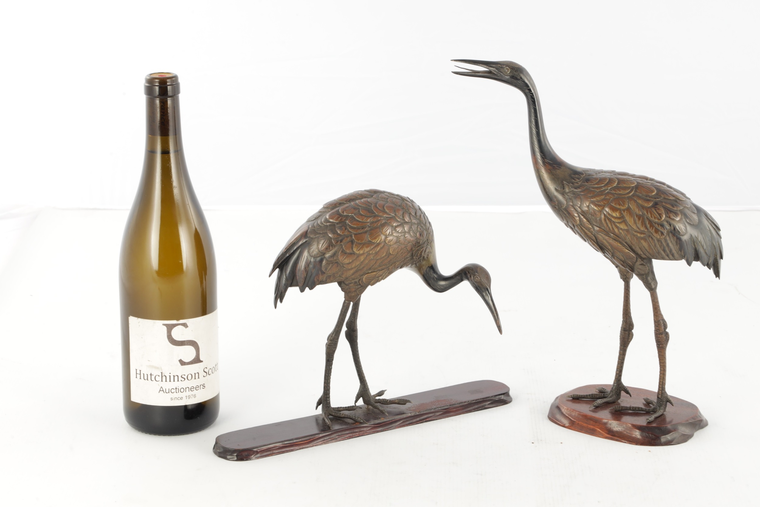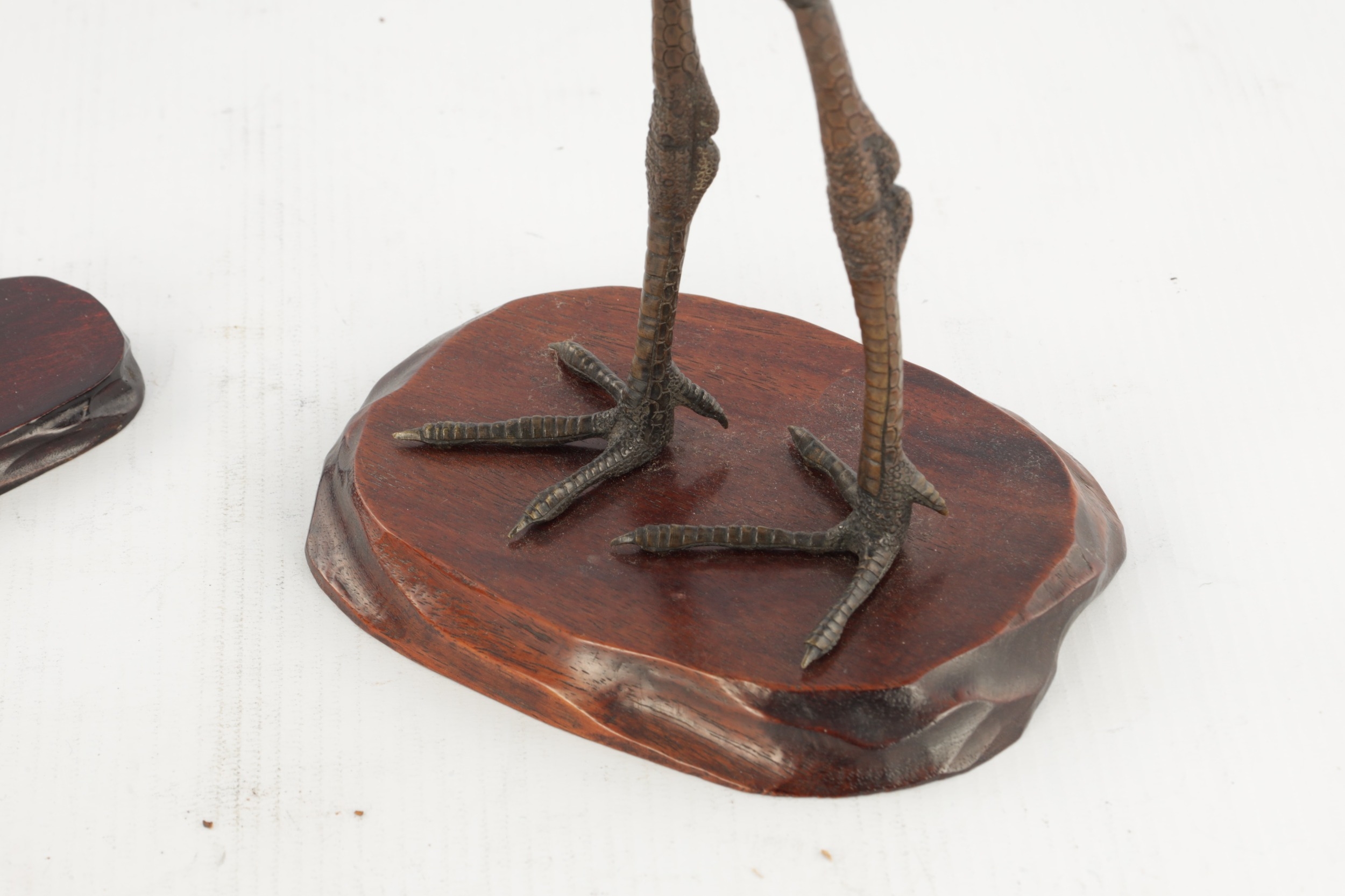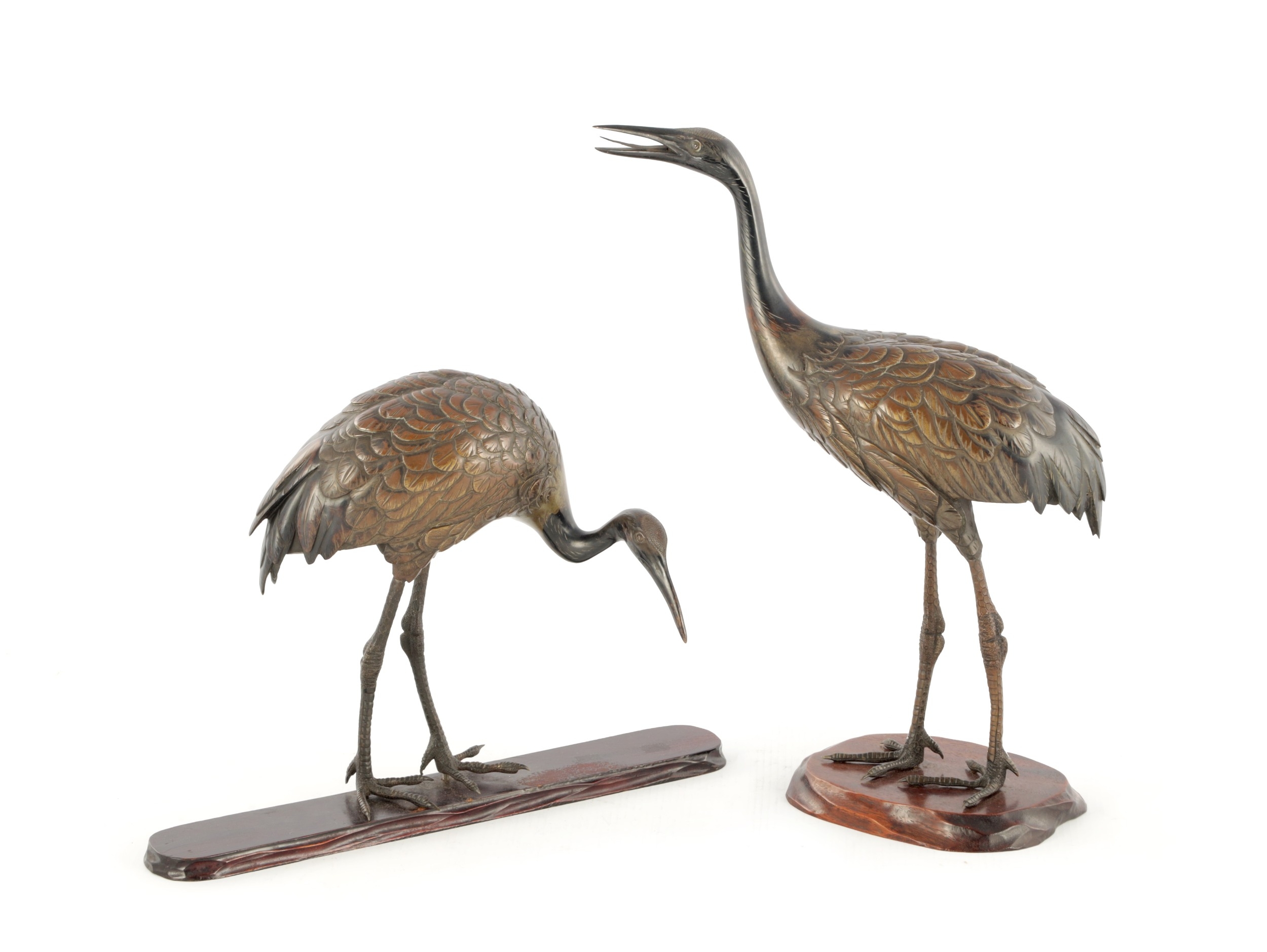 A PAIR OF JAPANESE MEIJI PERIOD BRONZE SCULPTURES OF CRANES with a silvered and patinated finish on hardwood bases. (30.5cm high )