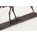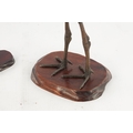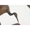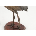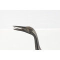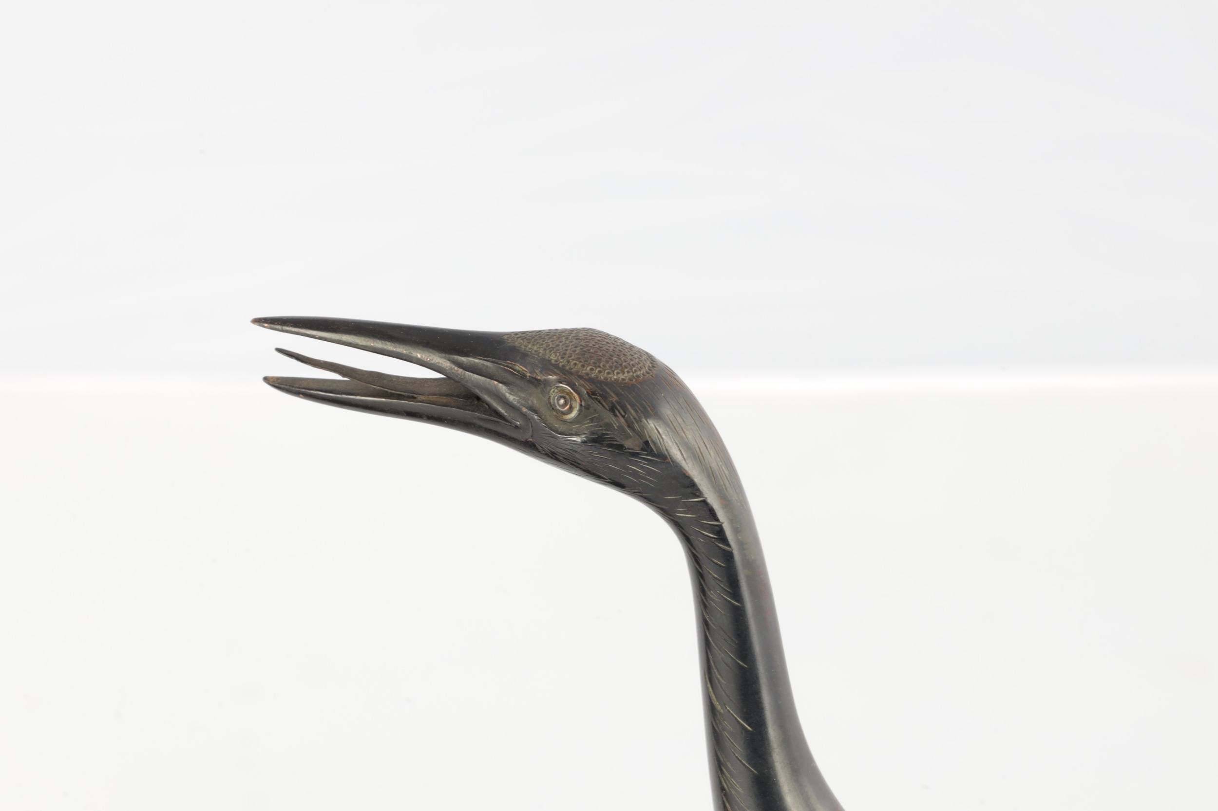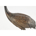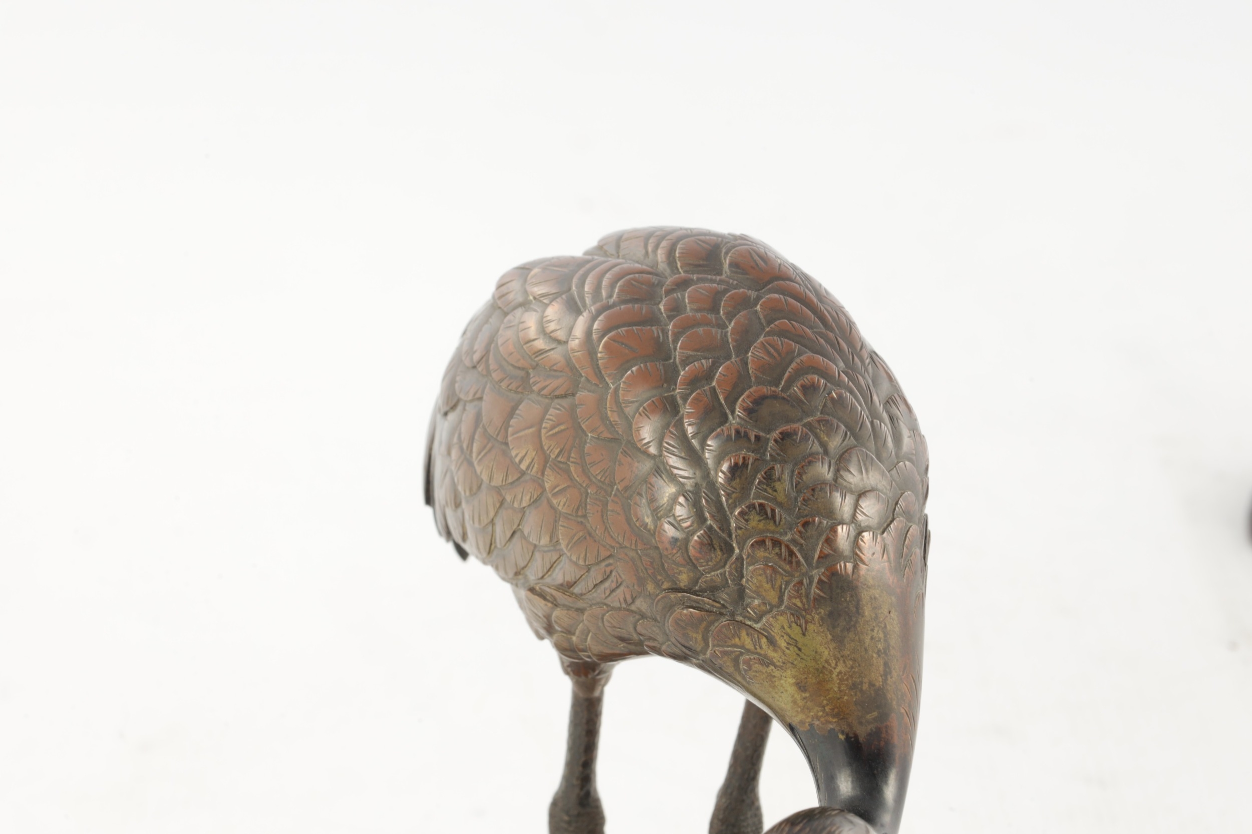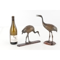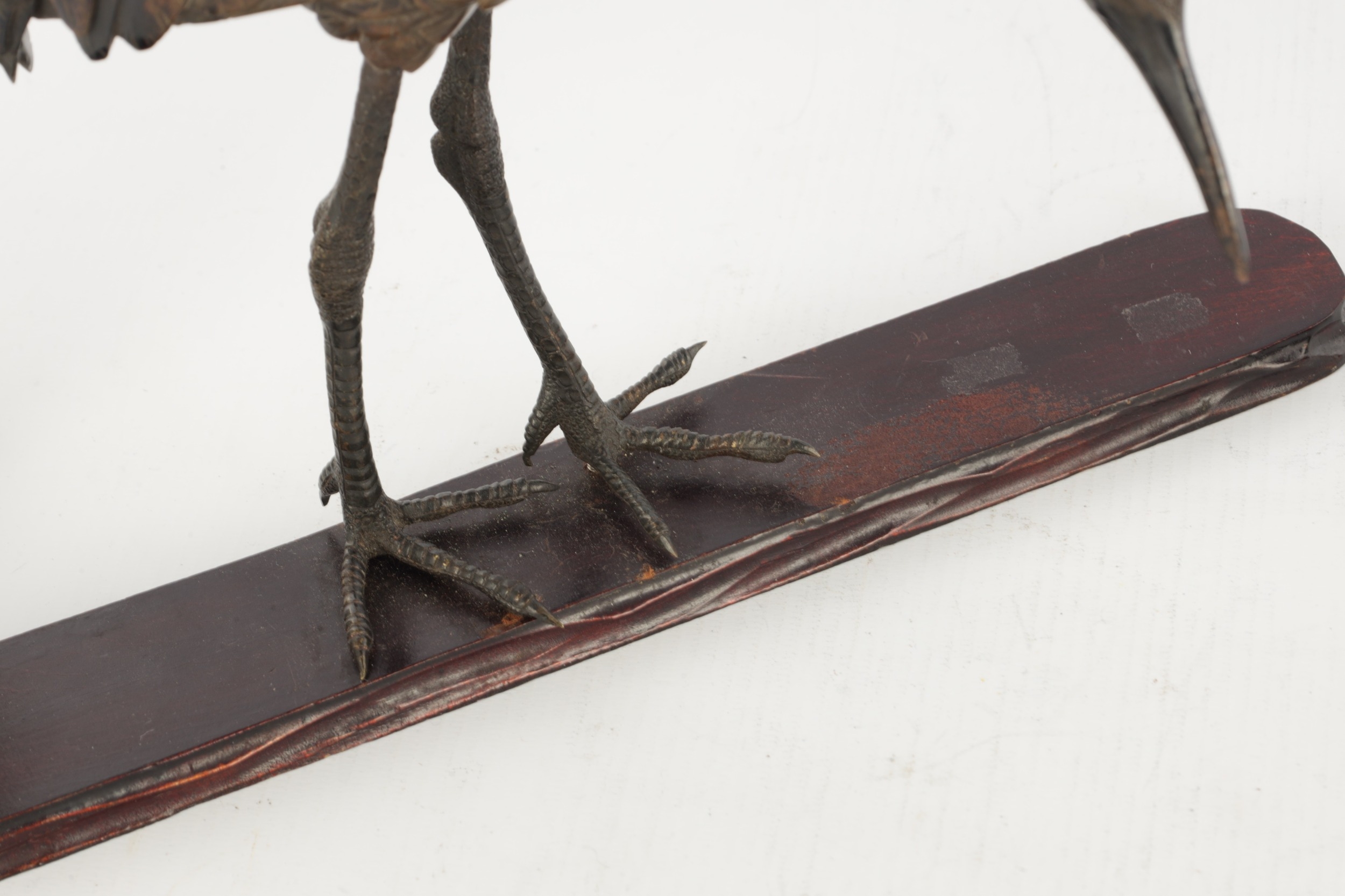 A PAIR OF JAPANESE MEIJI PERIOD BRONZE SCULPTURES OF CRANES with a silvered and patinated finish on hardwood bases. (30.5cm high )