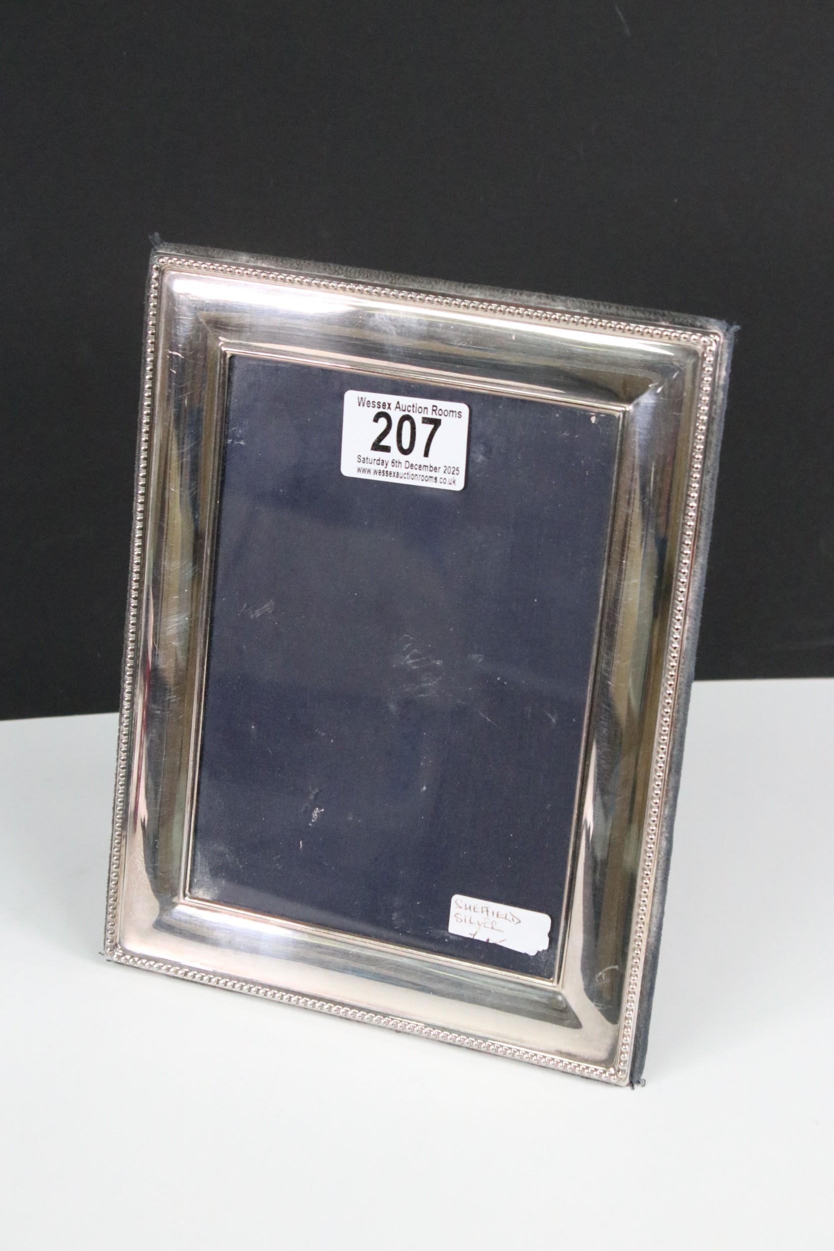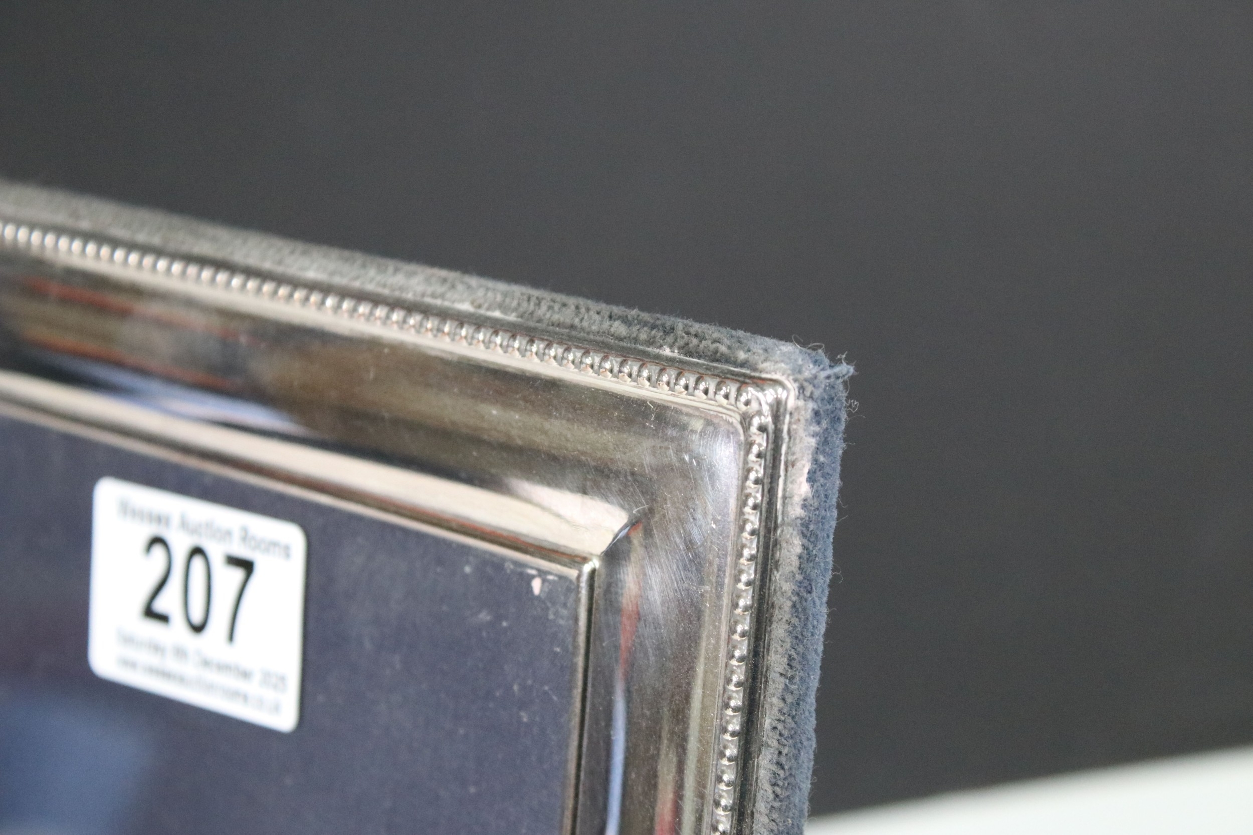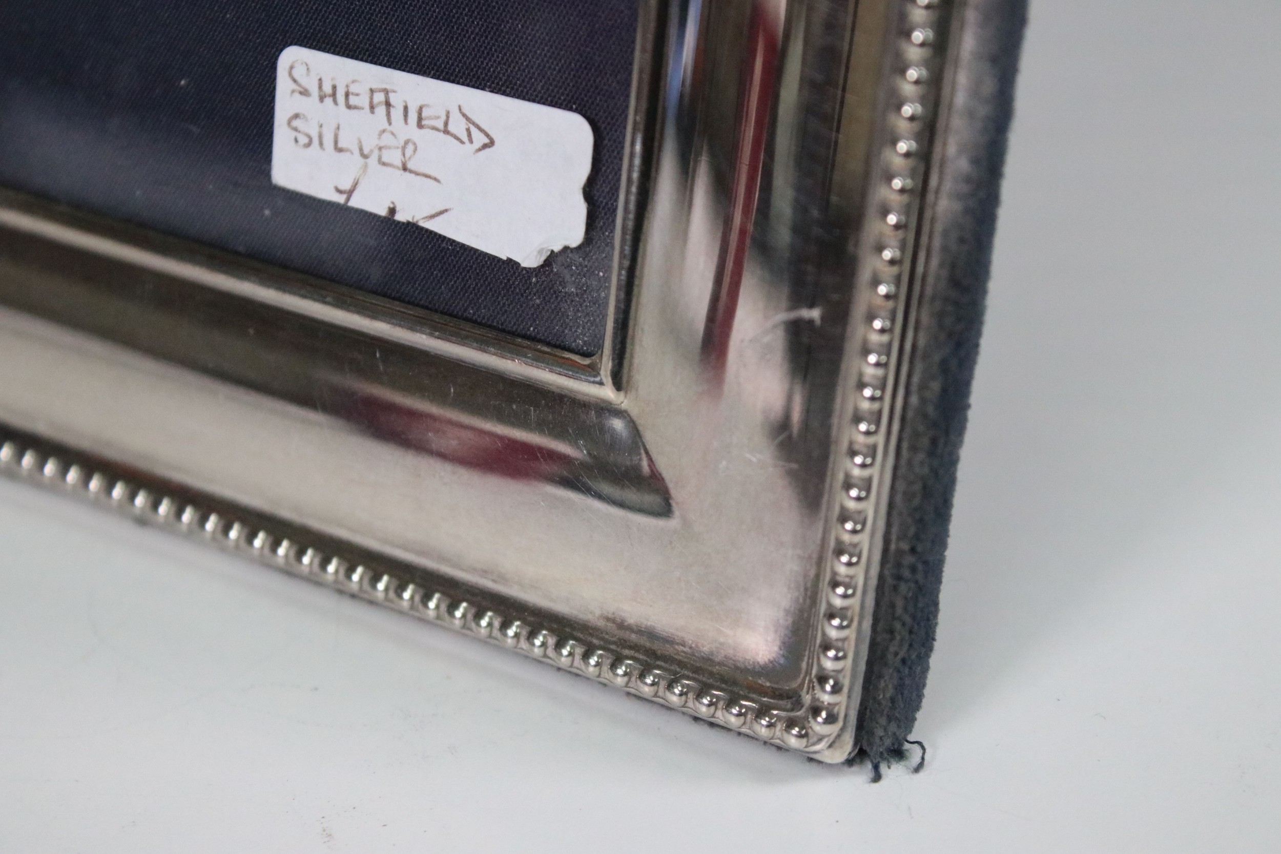 Rectangular Sheffield silver photograph frame with beaded edge detail, hallmarked Carr's of Sheffield Ltd, 1920, frame measures 17.5cm x 22.5cm, glass measures - 12cm x 17cm (1)