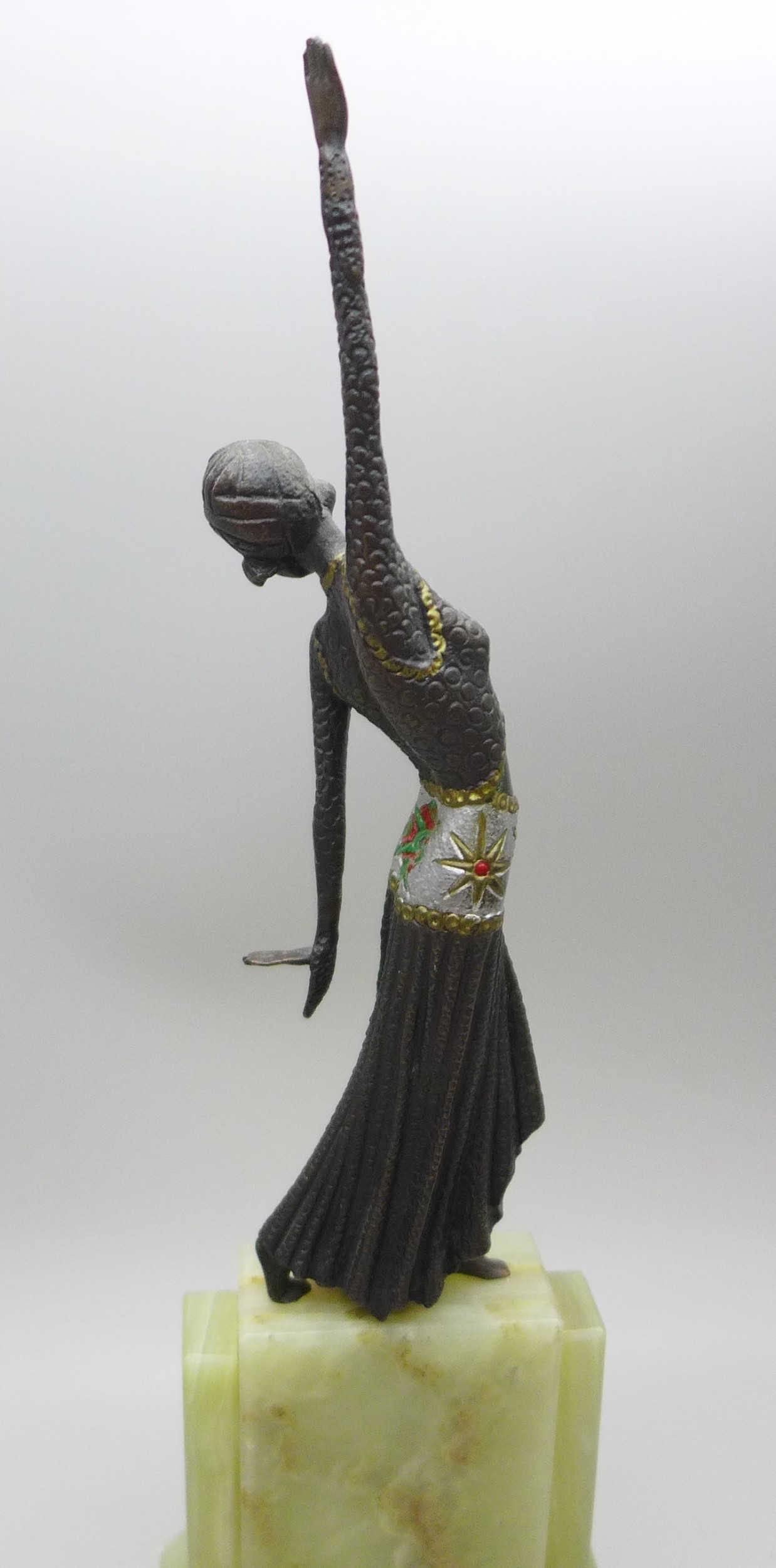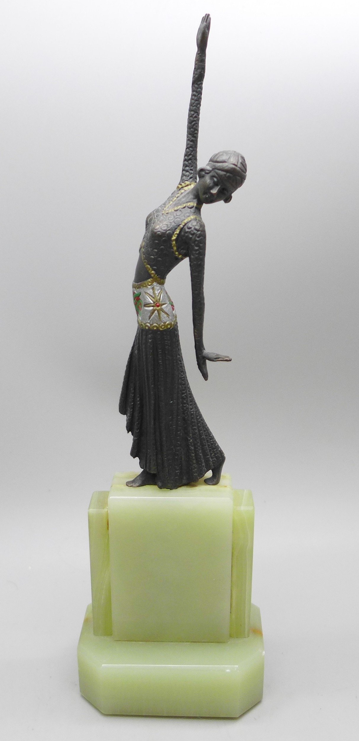 A small bronze Art Deco style figure on an onyx base, in the manner of Demetre Chiparus, (Romanian 1886-1947), 22cm