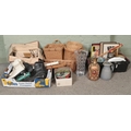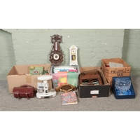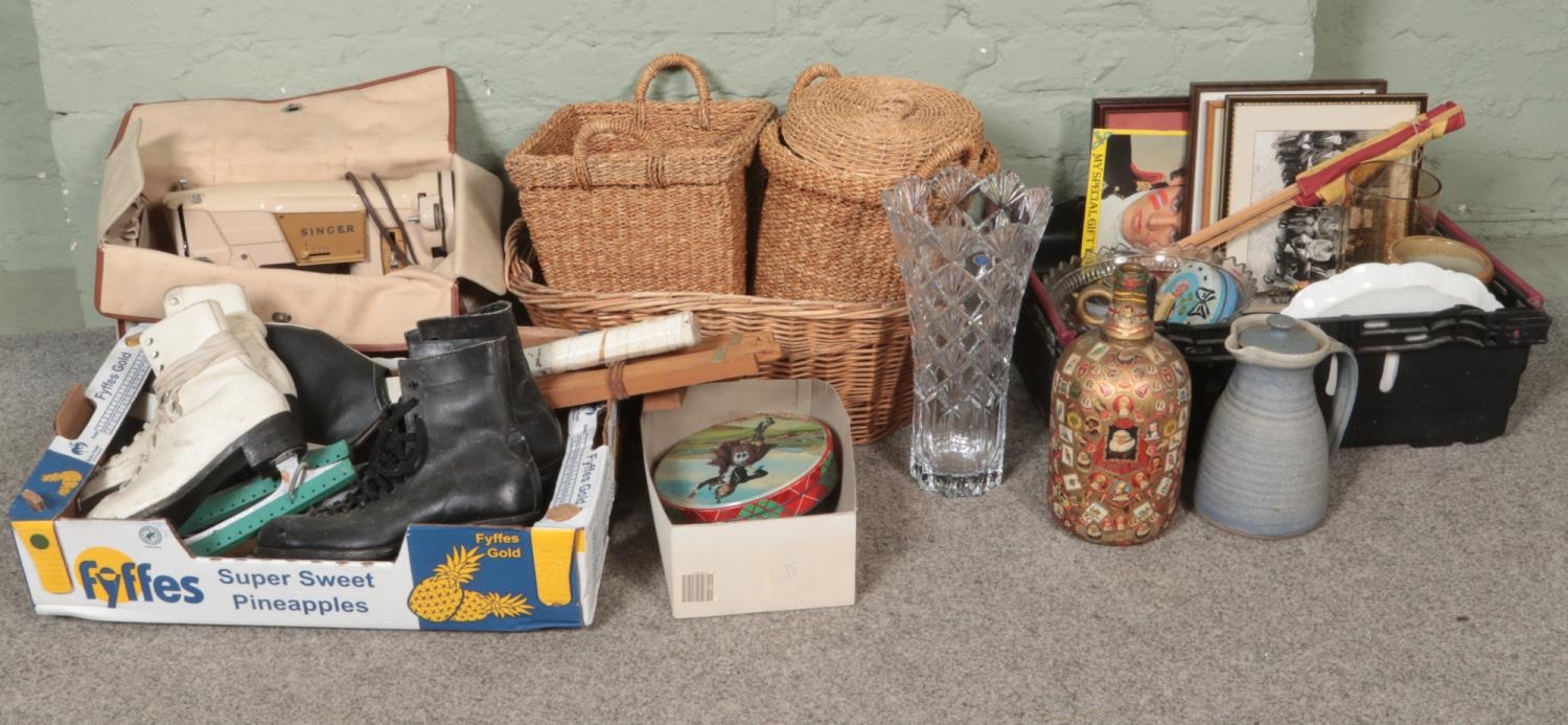 Four boxes of assorted items, to include wicker baskets, tools, vintage sporting equipment, Bohemian glass vase, Singer sewing machine, easel etc.
