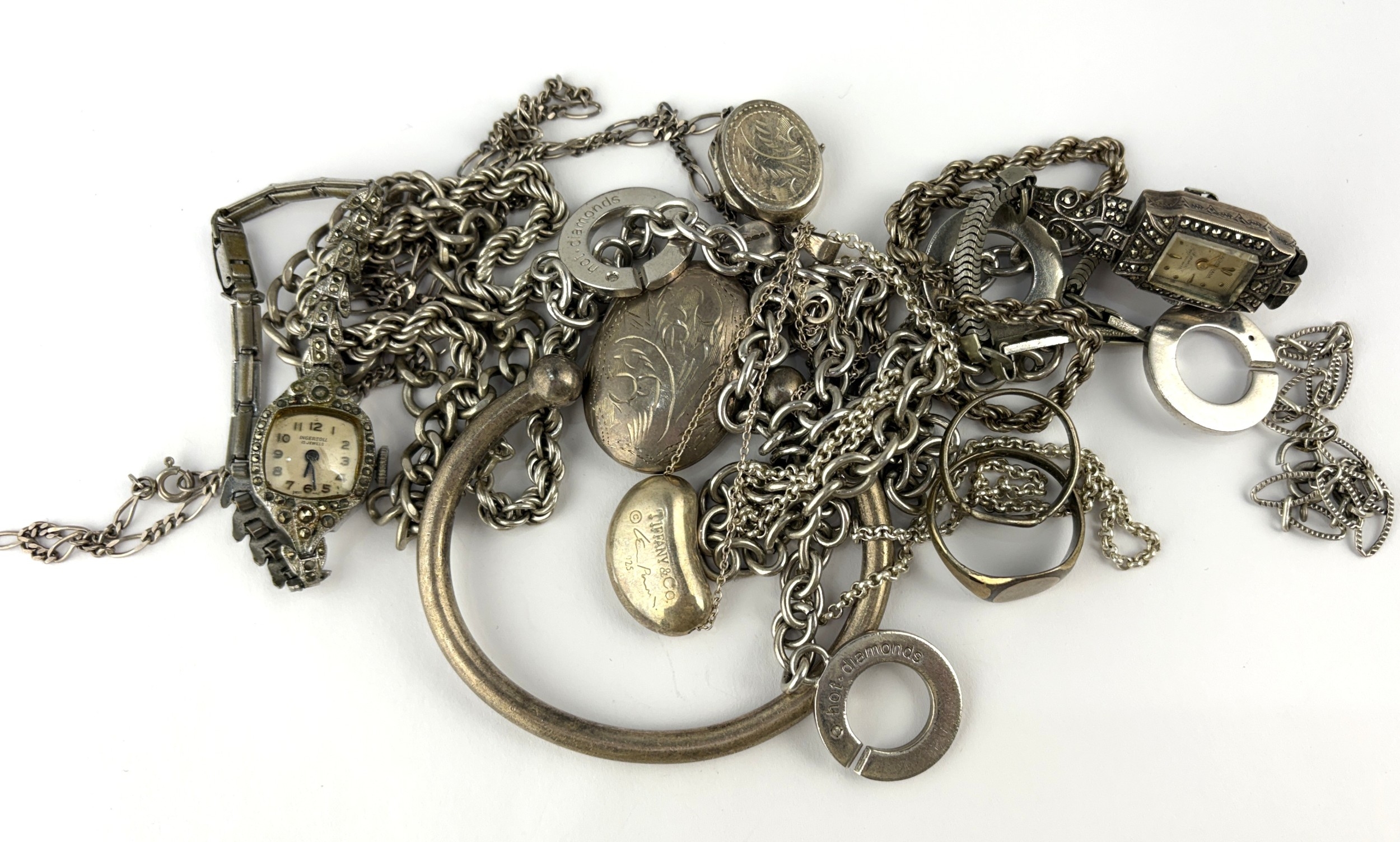 A group of eleven items of mostly silver jewellery including a bangle and two rings, also two ladies marcasite set wrist watches combined gross weight including the two wrist watches 146g