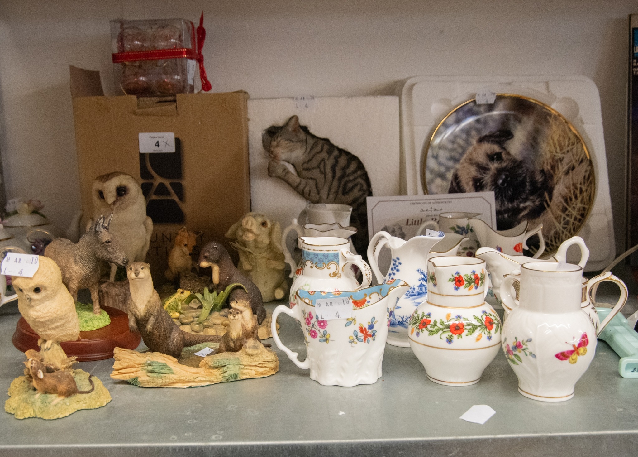 BORDER FINE ARTS AND OTHER CAST RESIN MODELS OF ANIMALS AND 12 ROYAL WORCESTER MILK JUGS, FLORAL DECORATED
