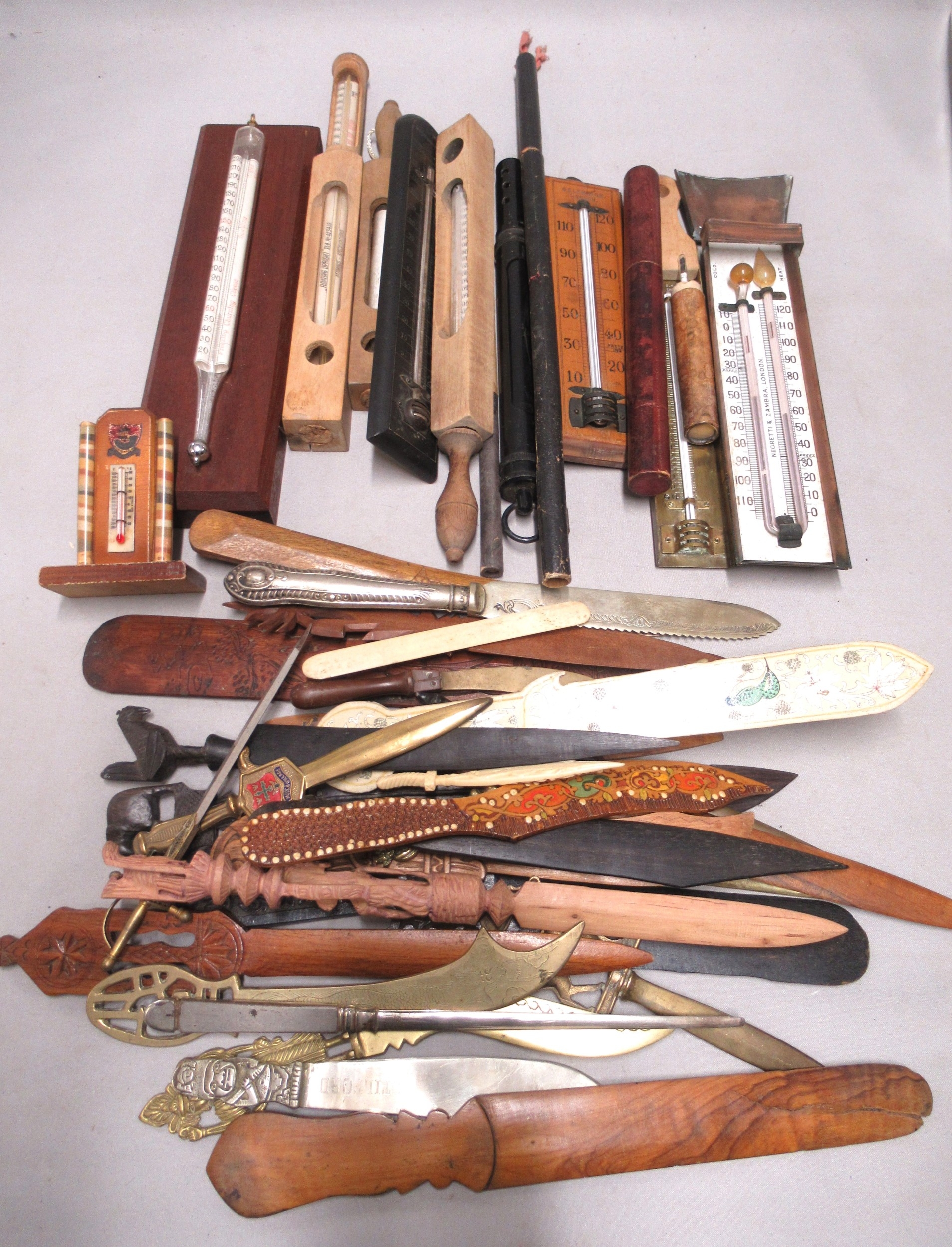 Collection of various paper knives and thermometers