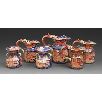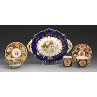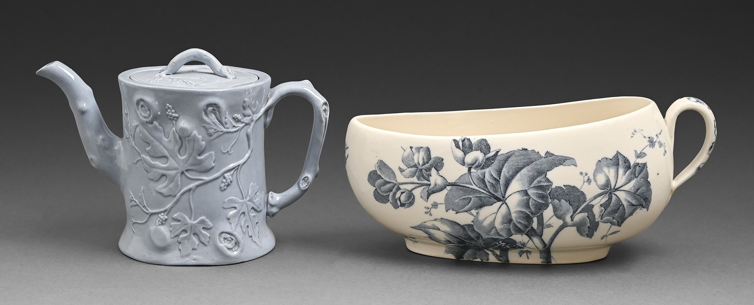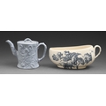 A Spode blue earthenware teapot and cover, c1840, moulded as a tree trunk with climbing vines, 13cm h, impressed mark and a Wedgwood earthenware Selbourne pattern bourdaloue, 24.5cm w, impressed and printed mark (2)
