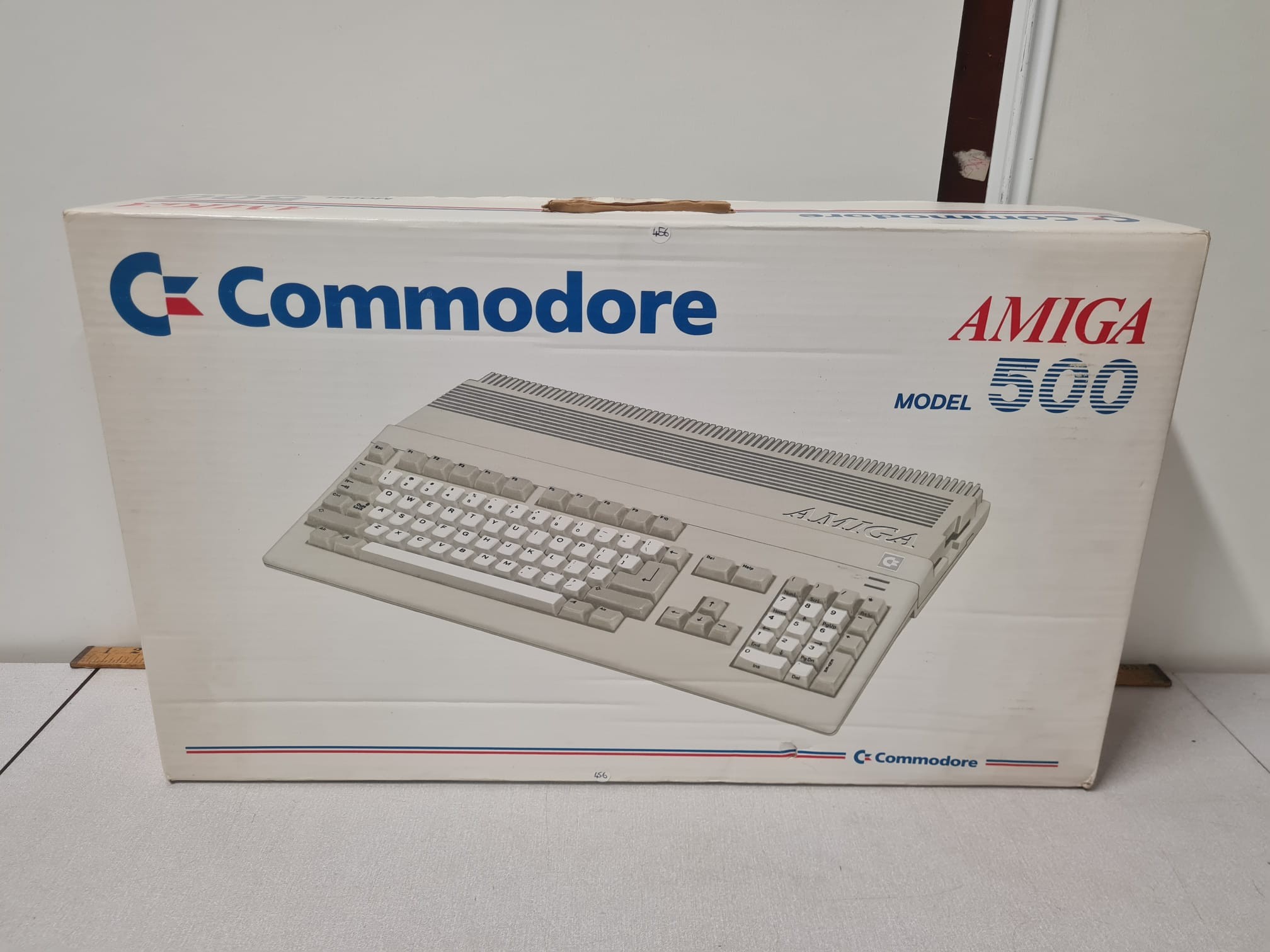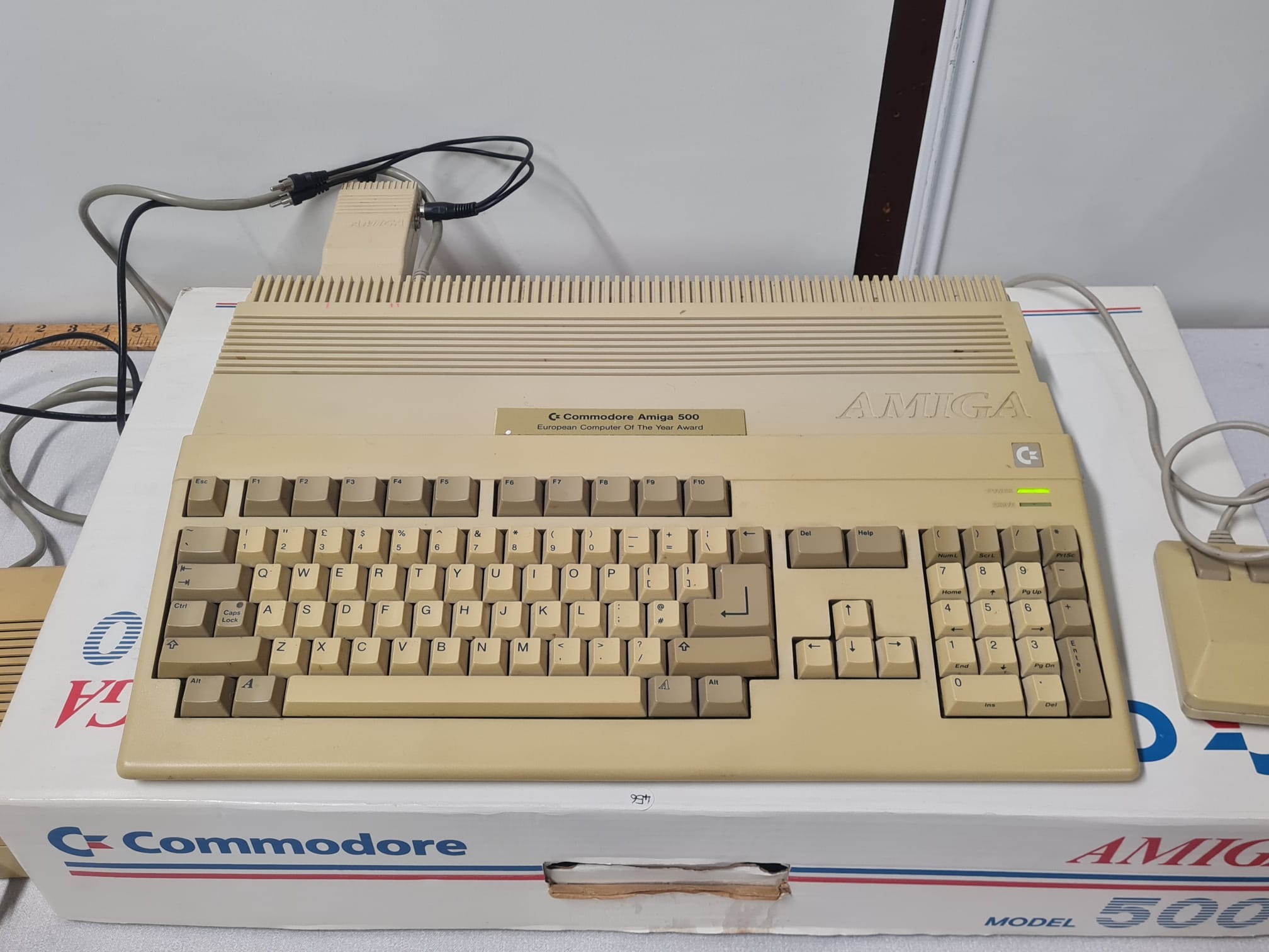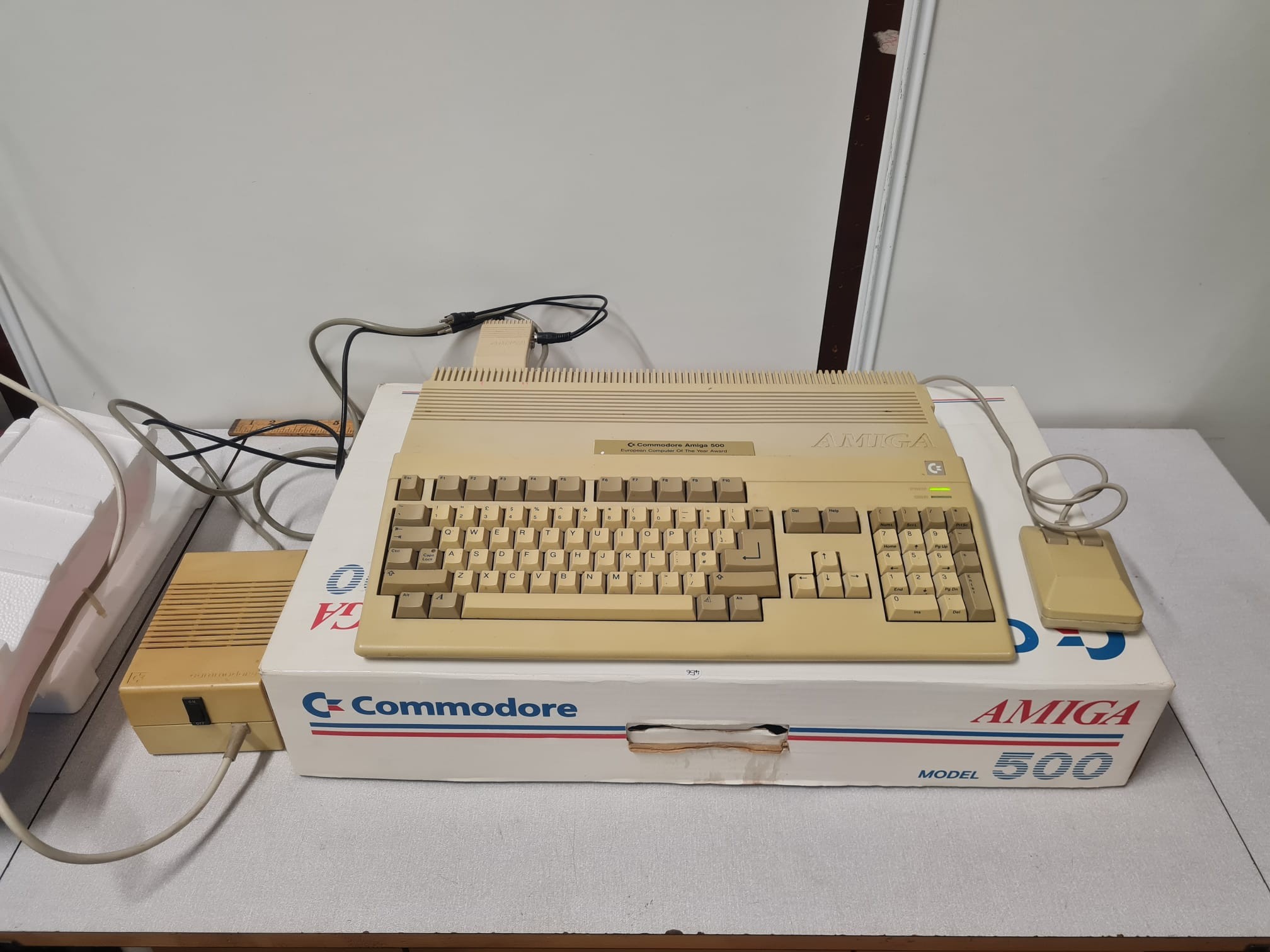 vintage commodore amiga 500 in original box with power pack (powering up ok)