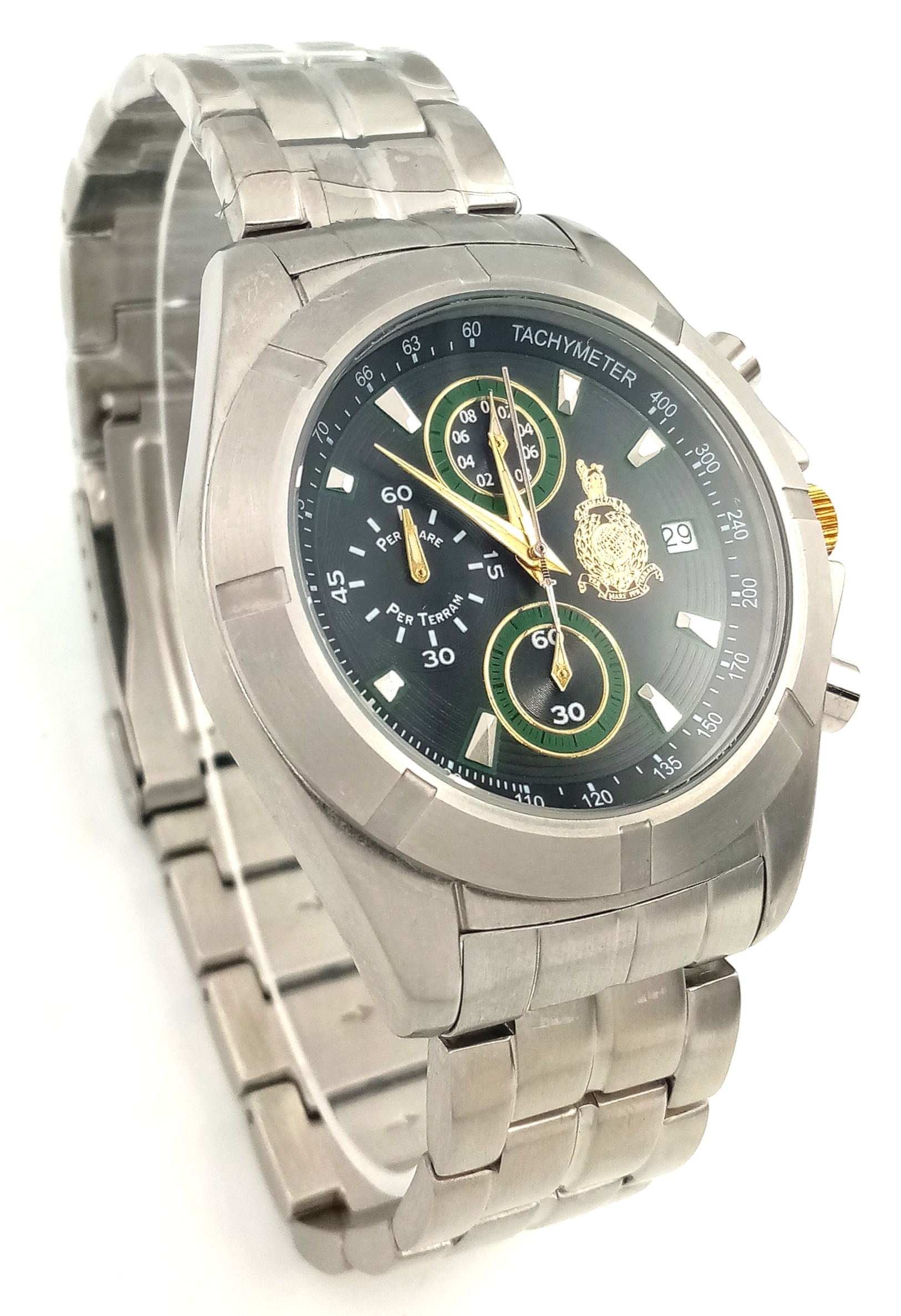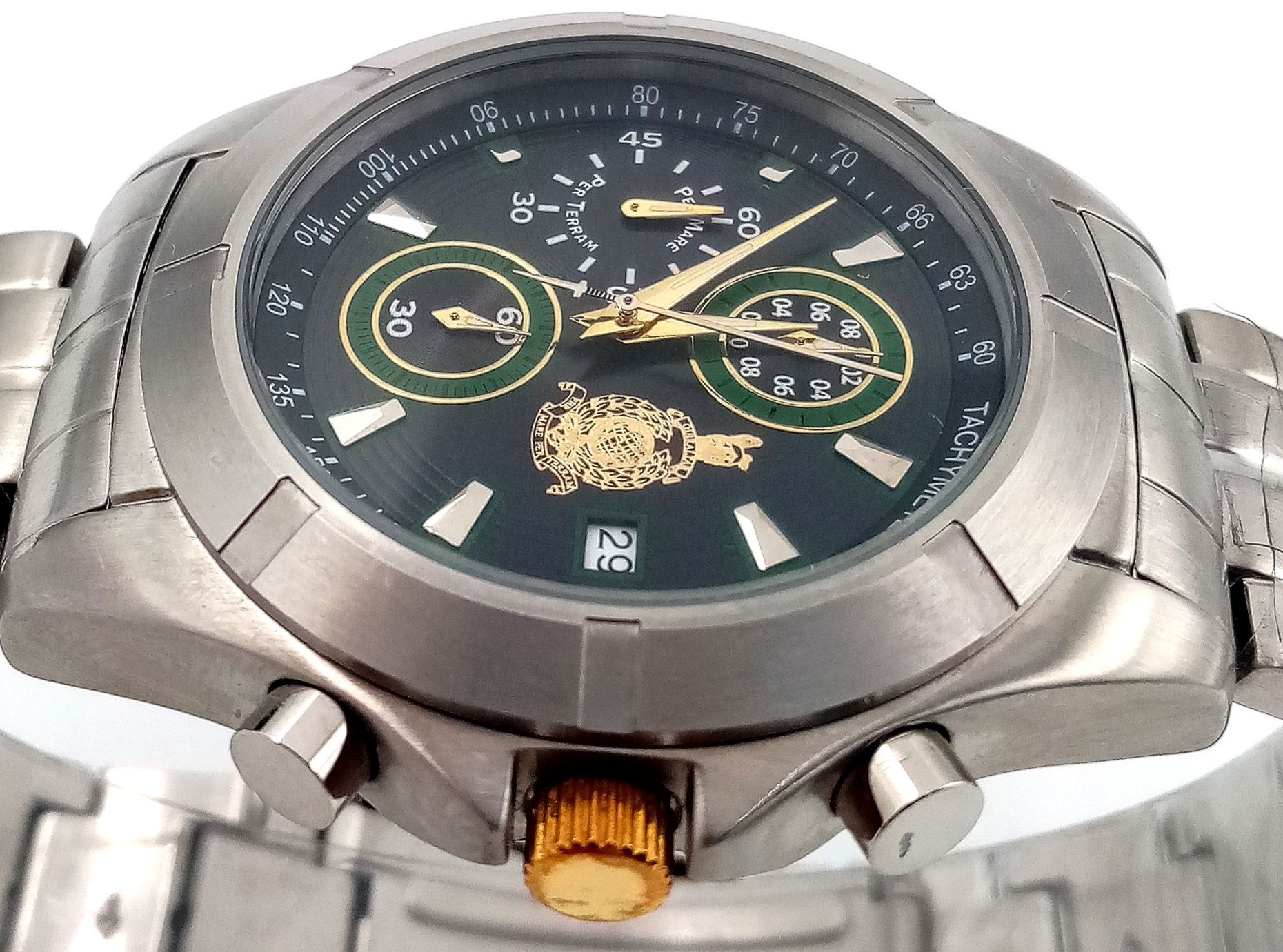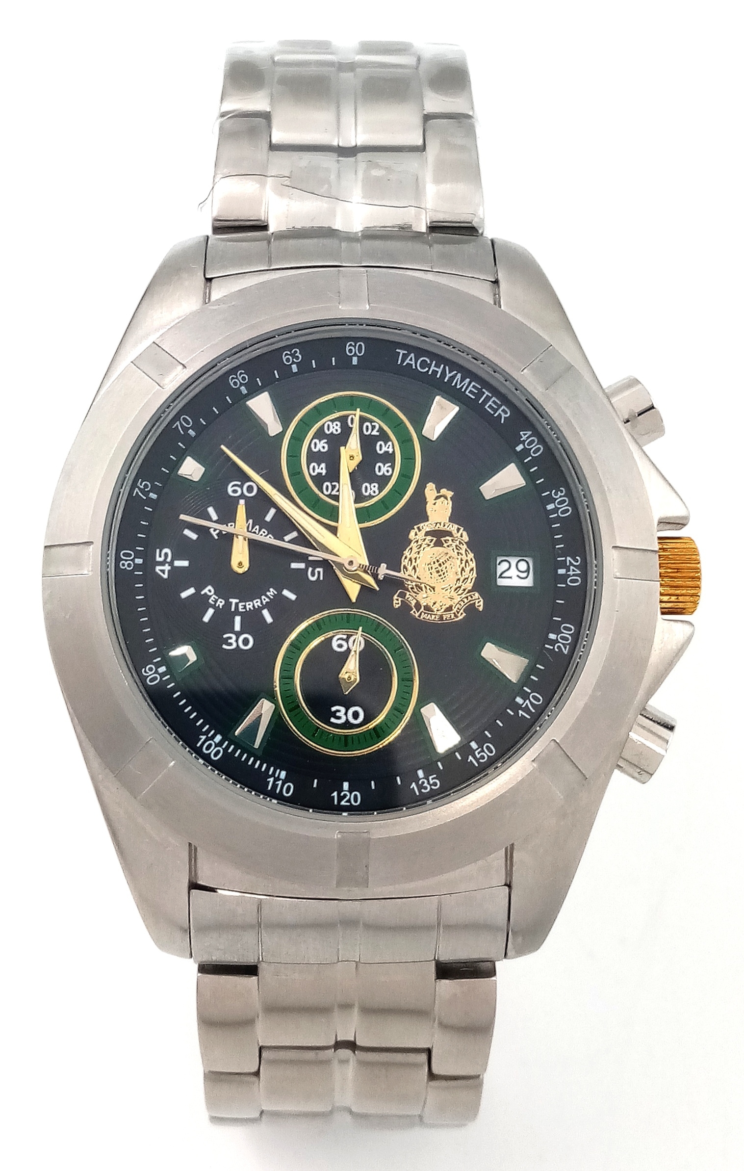 A Rare and Collectible, Limited Edition Royal Navy Royal Marines Commando Watch-45mm Case width including crown. As produced by the Bradford Exchange in Collaboration with the Royal Navy. Limited to 4999 pieces worldwide. This watch is no. 4629. New battery fitted November 2025. Complete with Certificate of Authenticity, Instructions and Original Box.