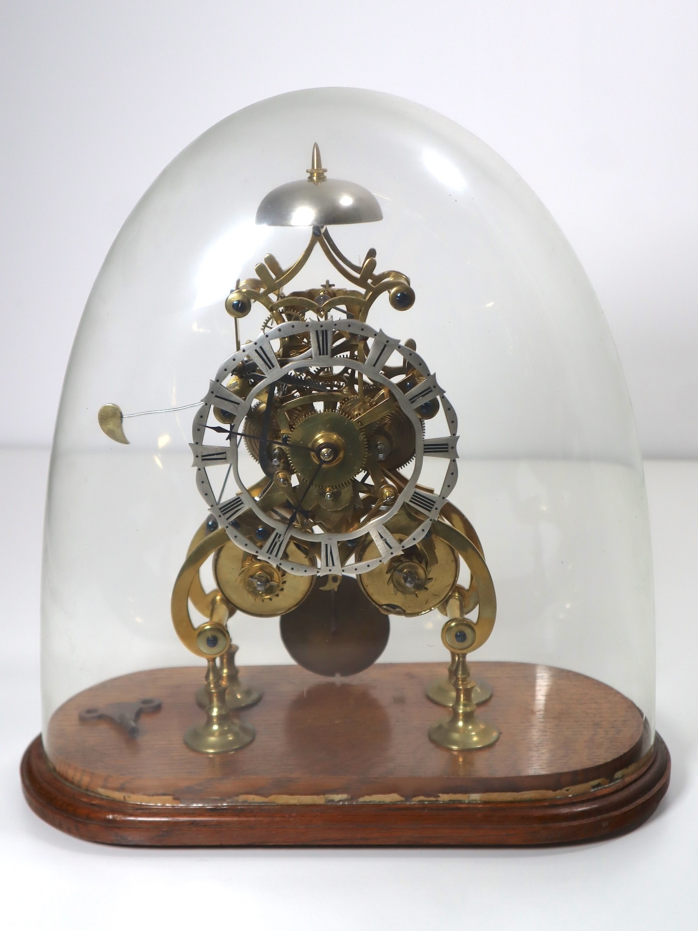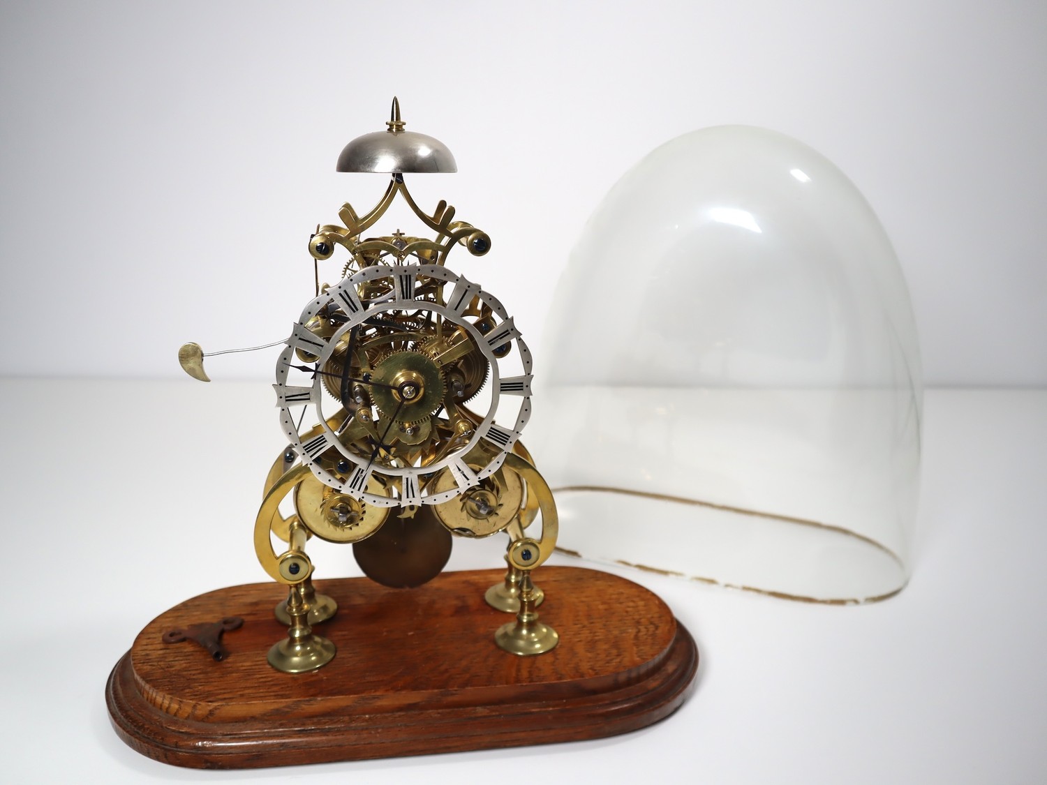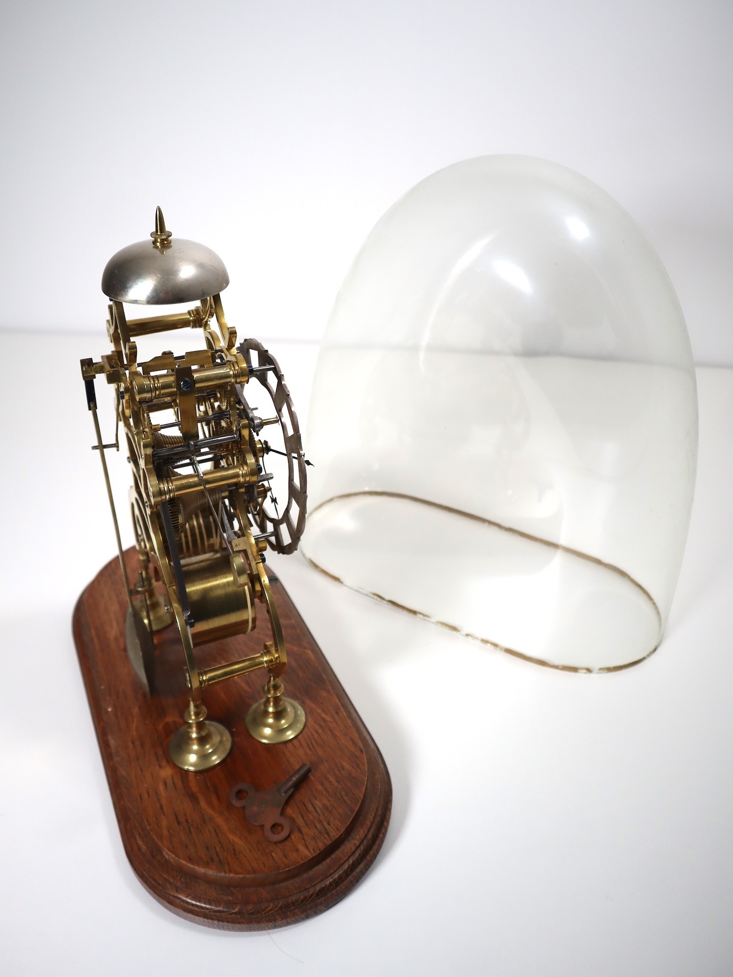 The clock is mounted on an oak plinth and retains its period glass dome, together with the key and pendulum.