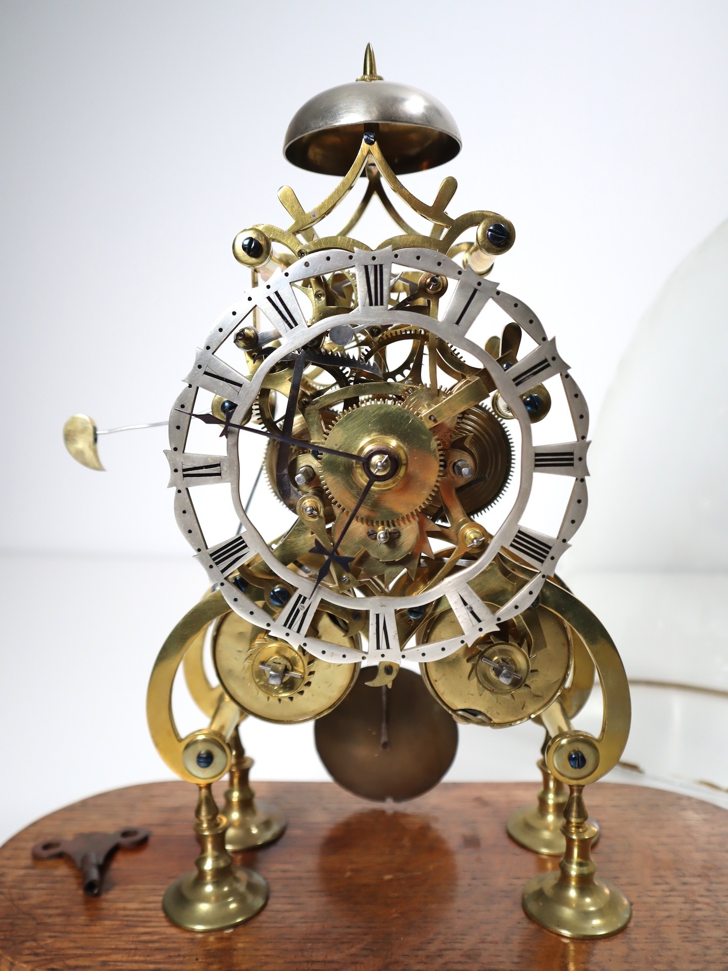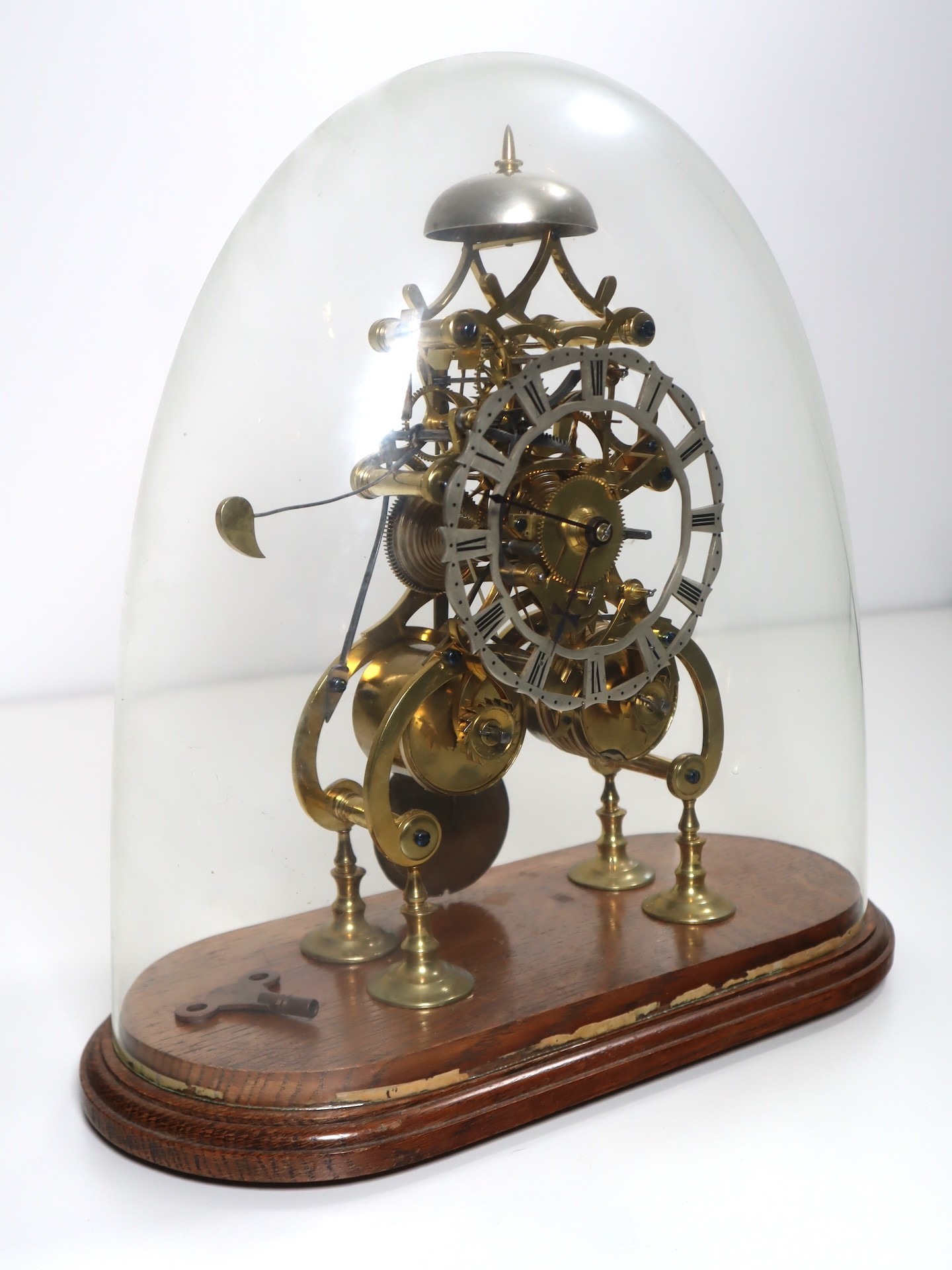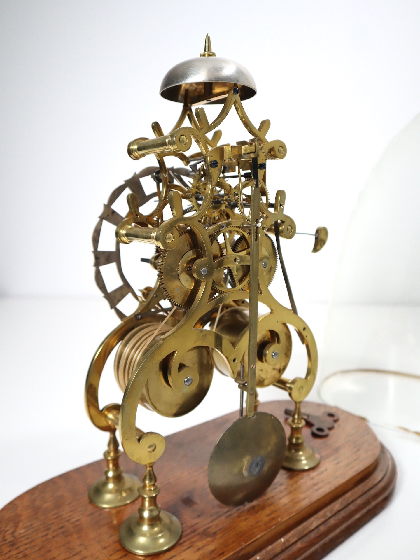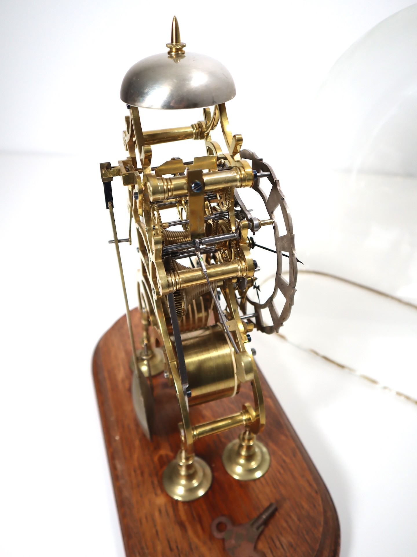 The clock is mounted on an oak plinth and retains its period glass dome, together with the key and pendulum.