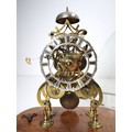 An elegant late 19th-century brass skeleton clock with an eight-day twin fusee movement. The silvered circular chapter ring is engraved with black Roman hour numerals, set within an open scrollwork frame, and surmounted by a bell.