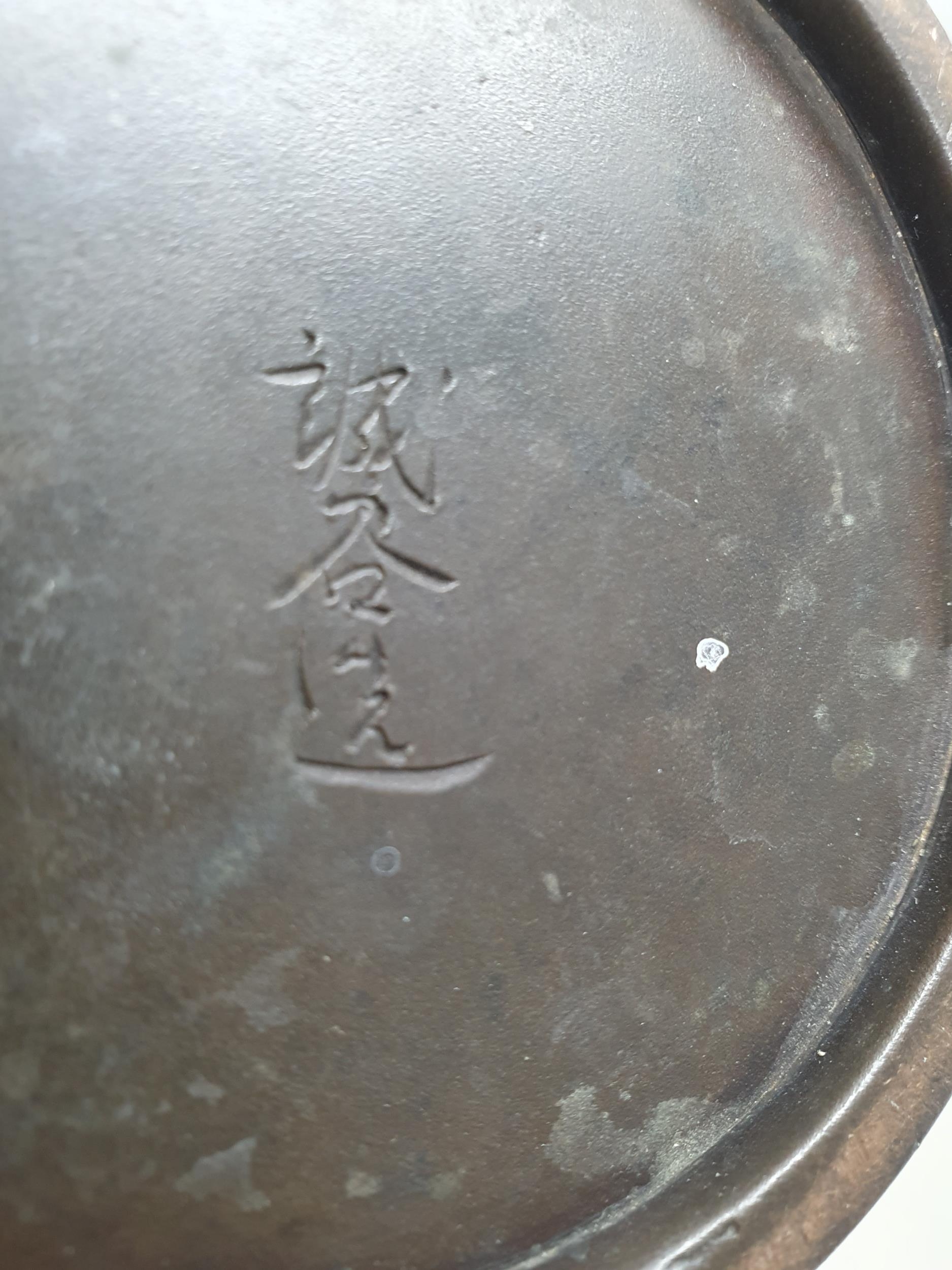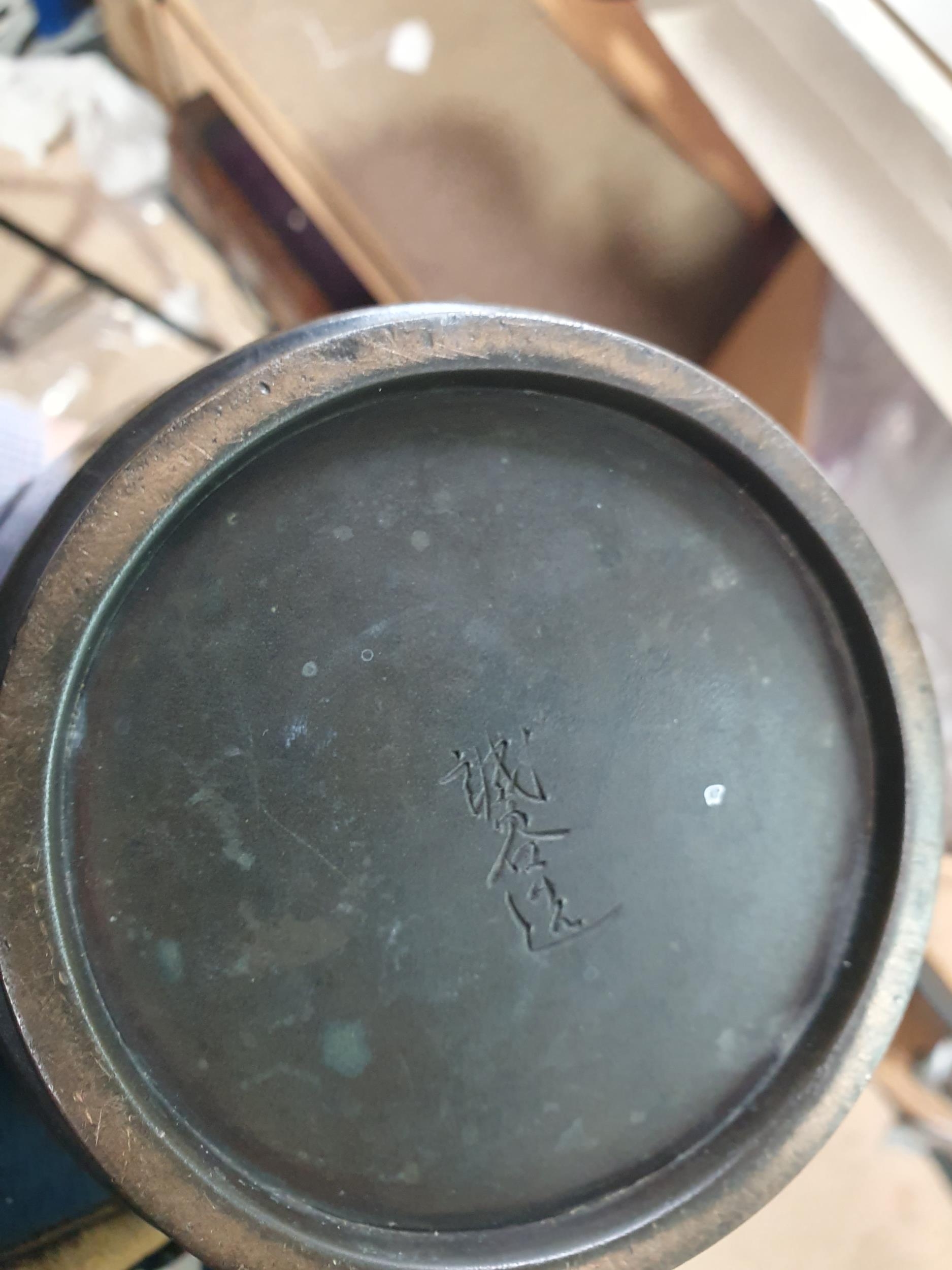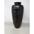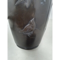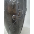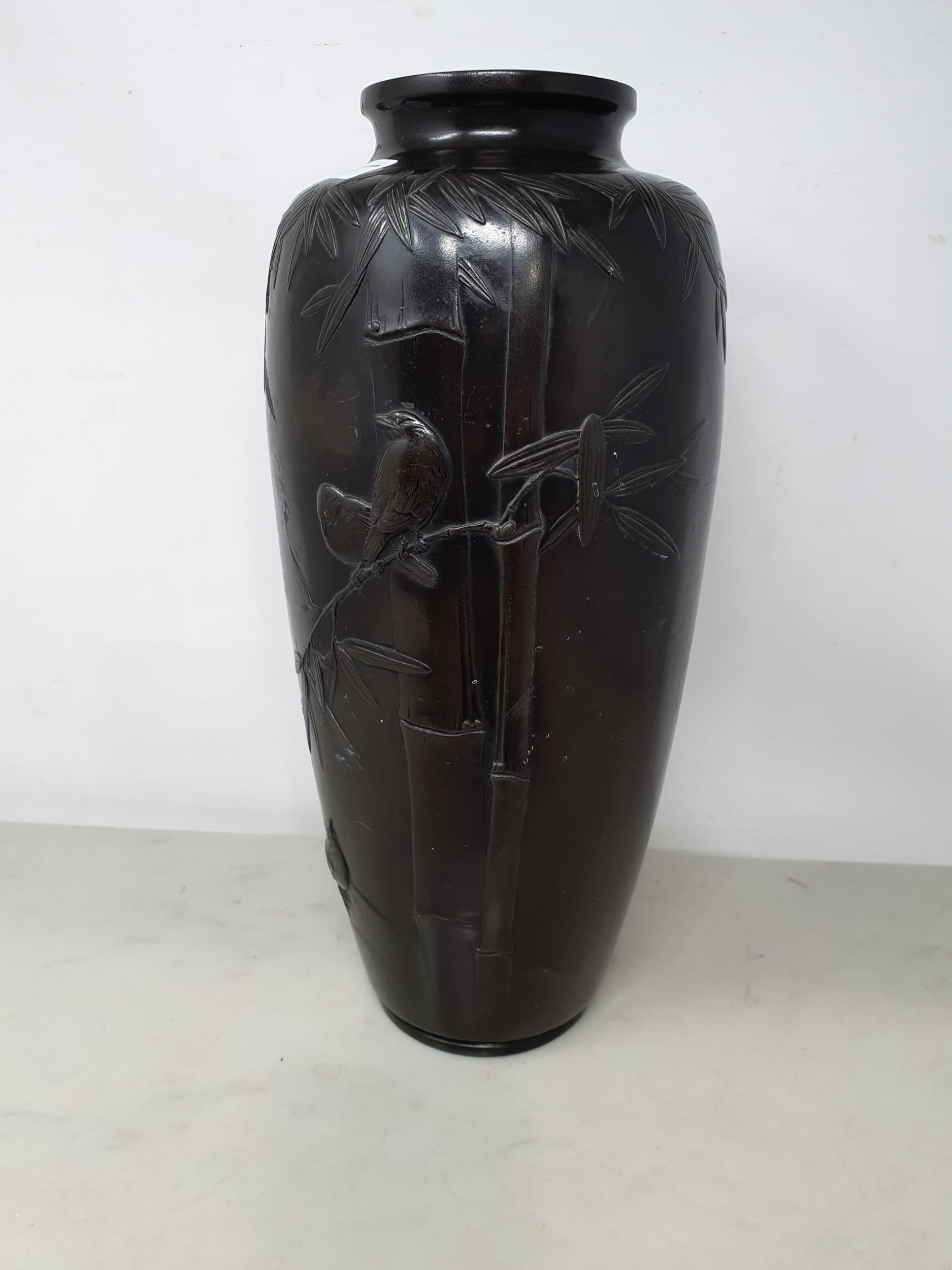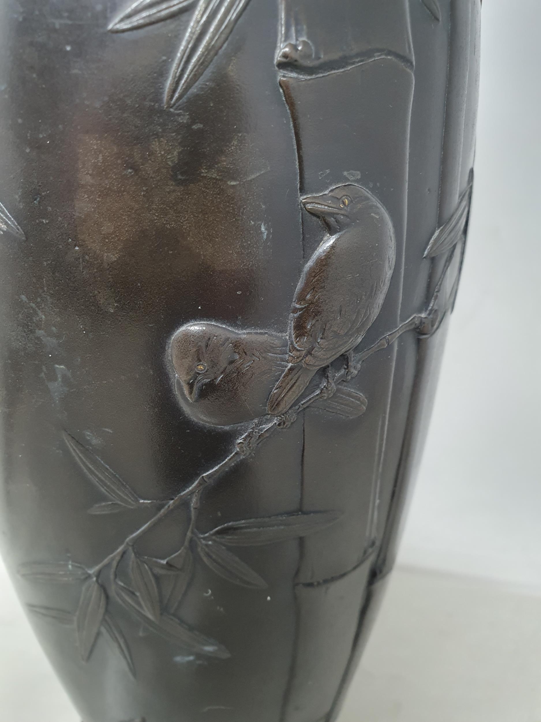 A Japanese bronze Vase decorated birds amongst shrubs in low relief, 13in, signed