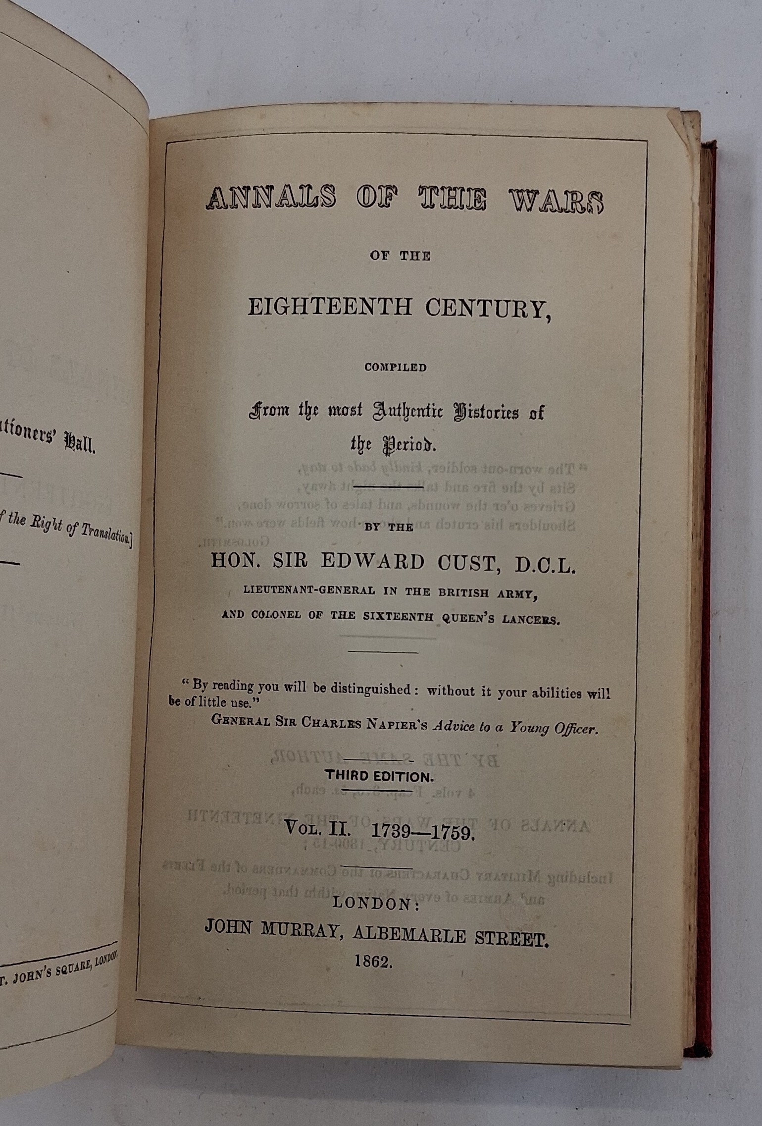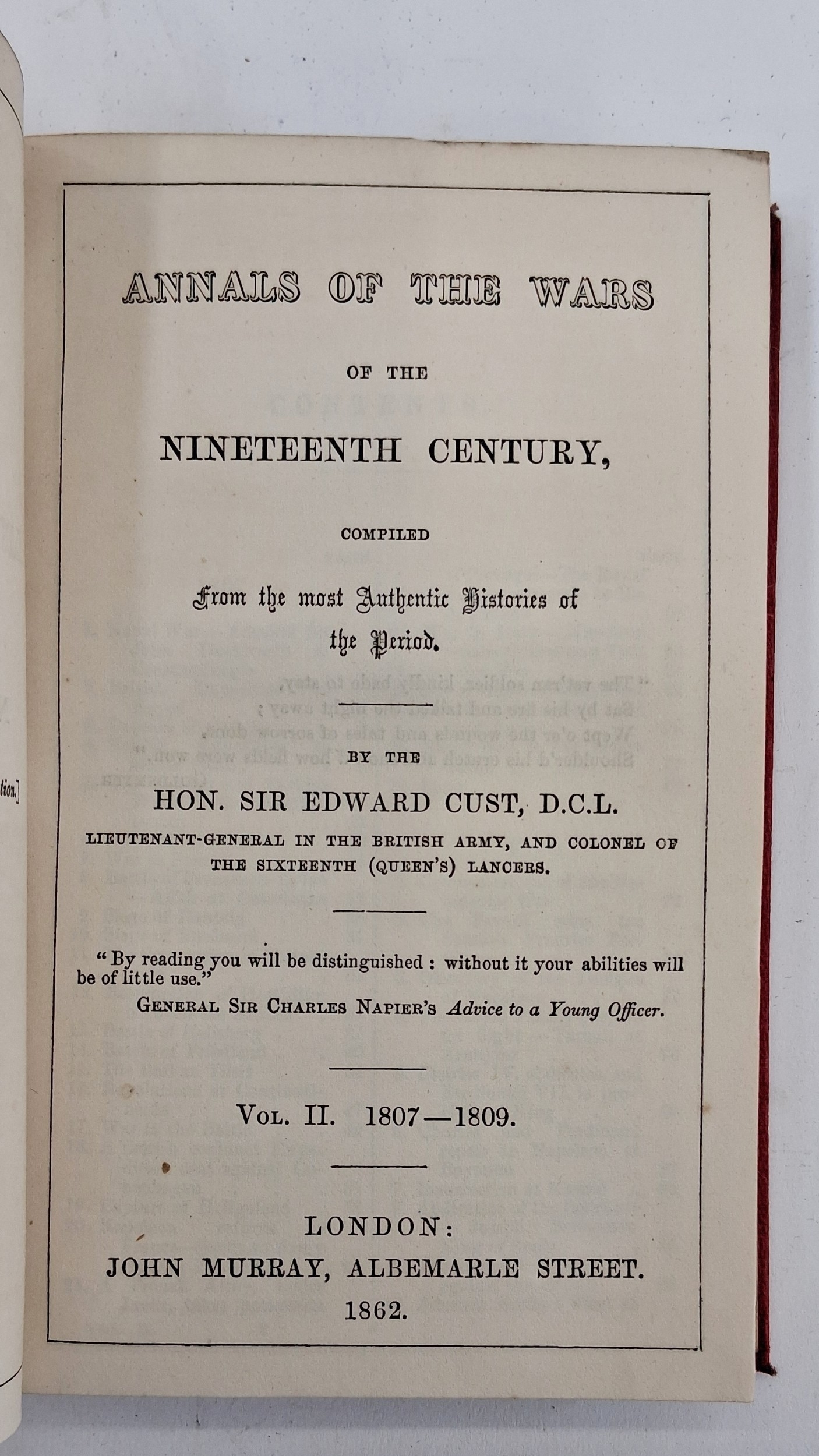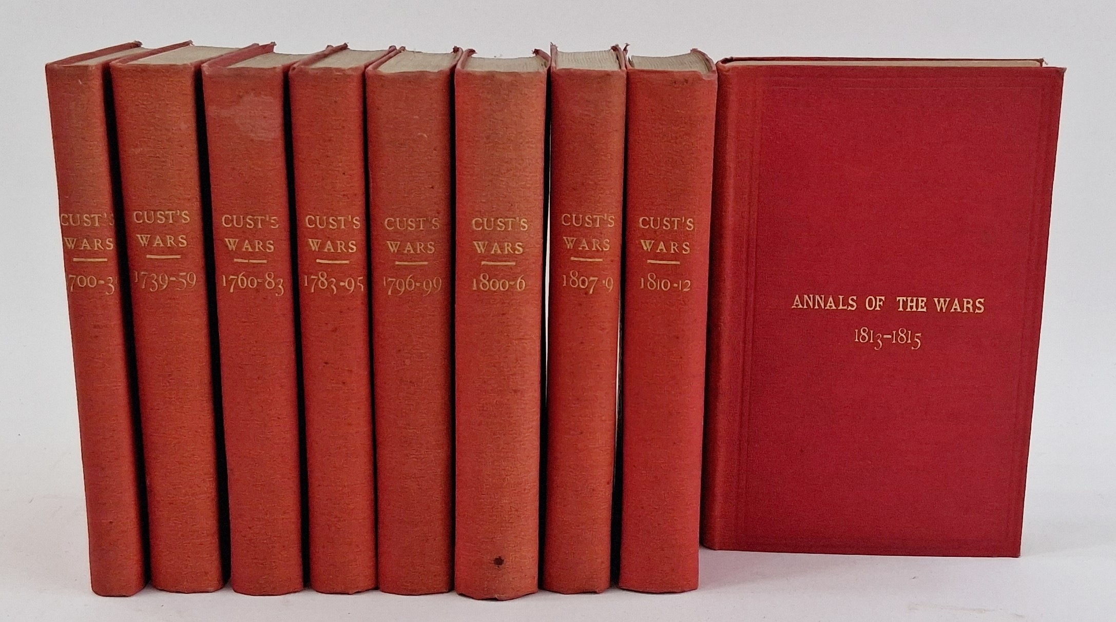 Cust, Hon Sir Edward "Annals of the War of the 18th Century", 3rd edition, John Murray 1862, 5 vols from 1700 to 1799 and "Annals of the Wars of the 19th Century ...", John Murray 1862, 1800 through to 1815, red buckram with gilt titles to the backstrip and front boards (9)