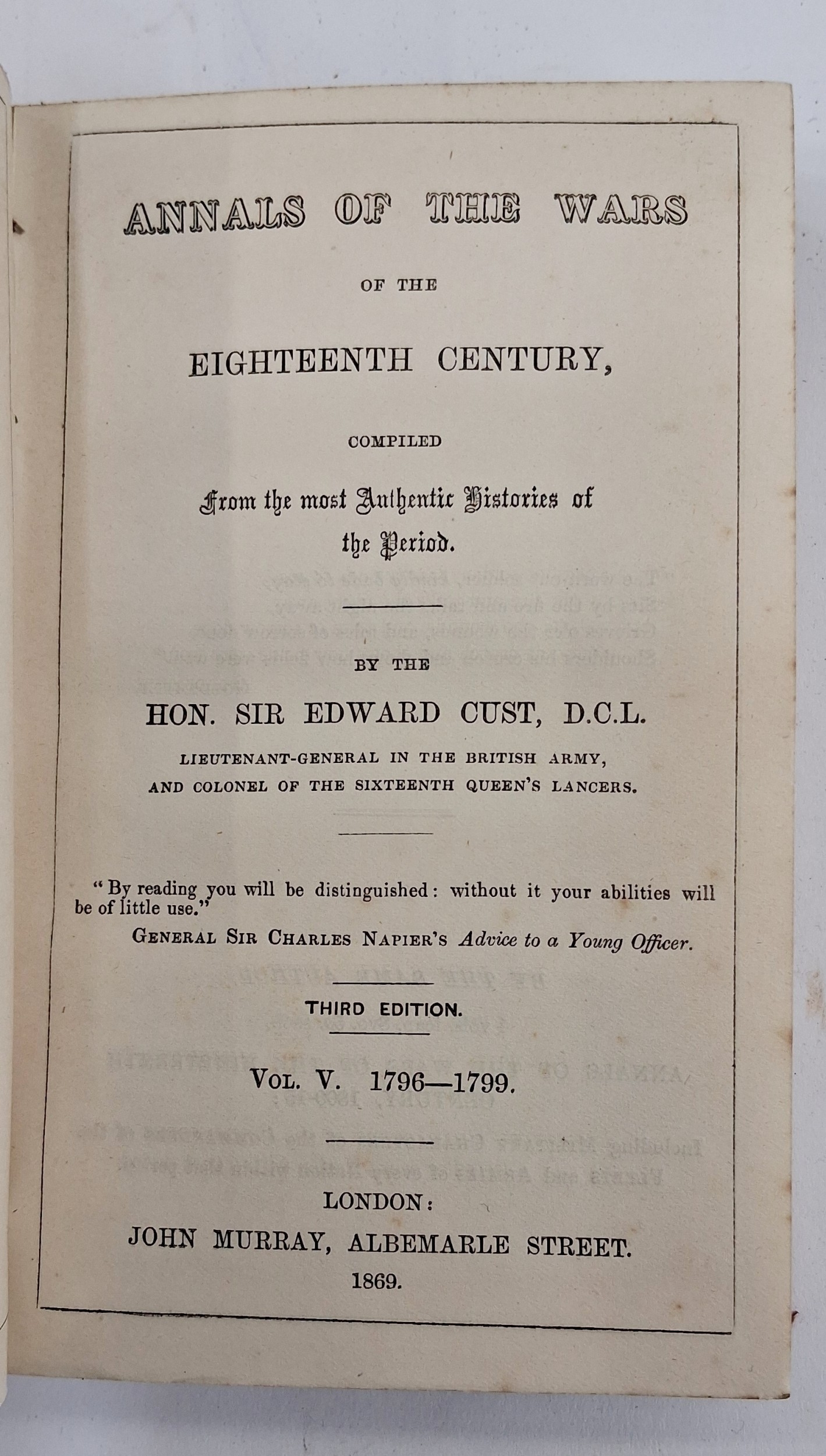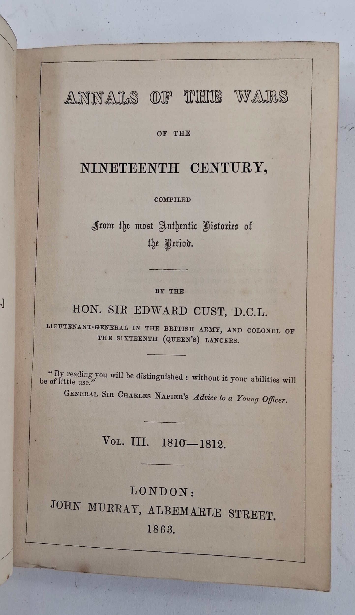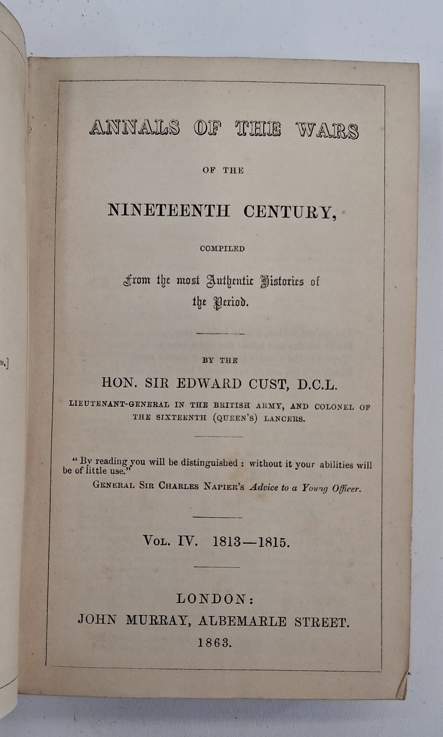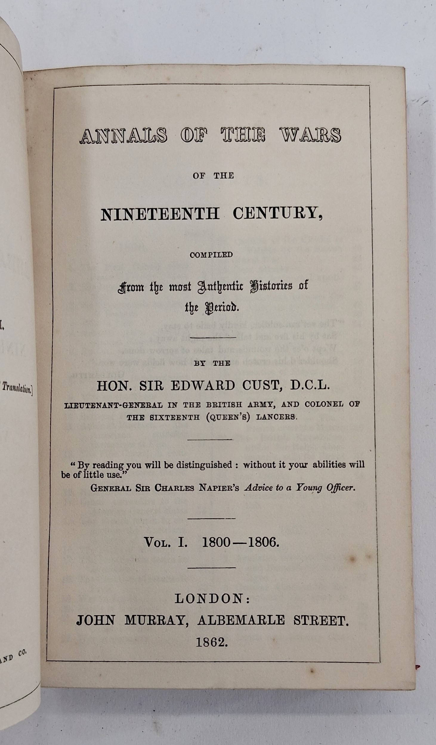 Cust, Hon Sir Edward "Annals of the War of the 18th Century", 3rd edition, John Murray 1862, 5 vols from 1700 to 1799 and "Annals of the Wars of the 19th Century ...", John Murray 1862, 1800 through to 1815, red buckram with gilt titles to the backstrip and front boards (9)