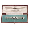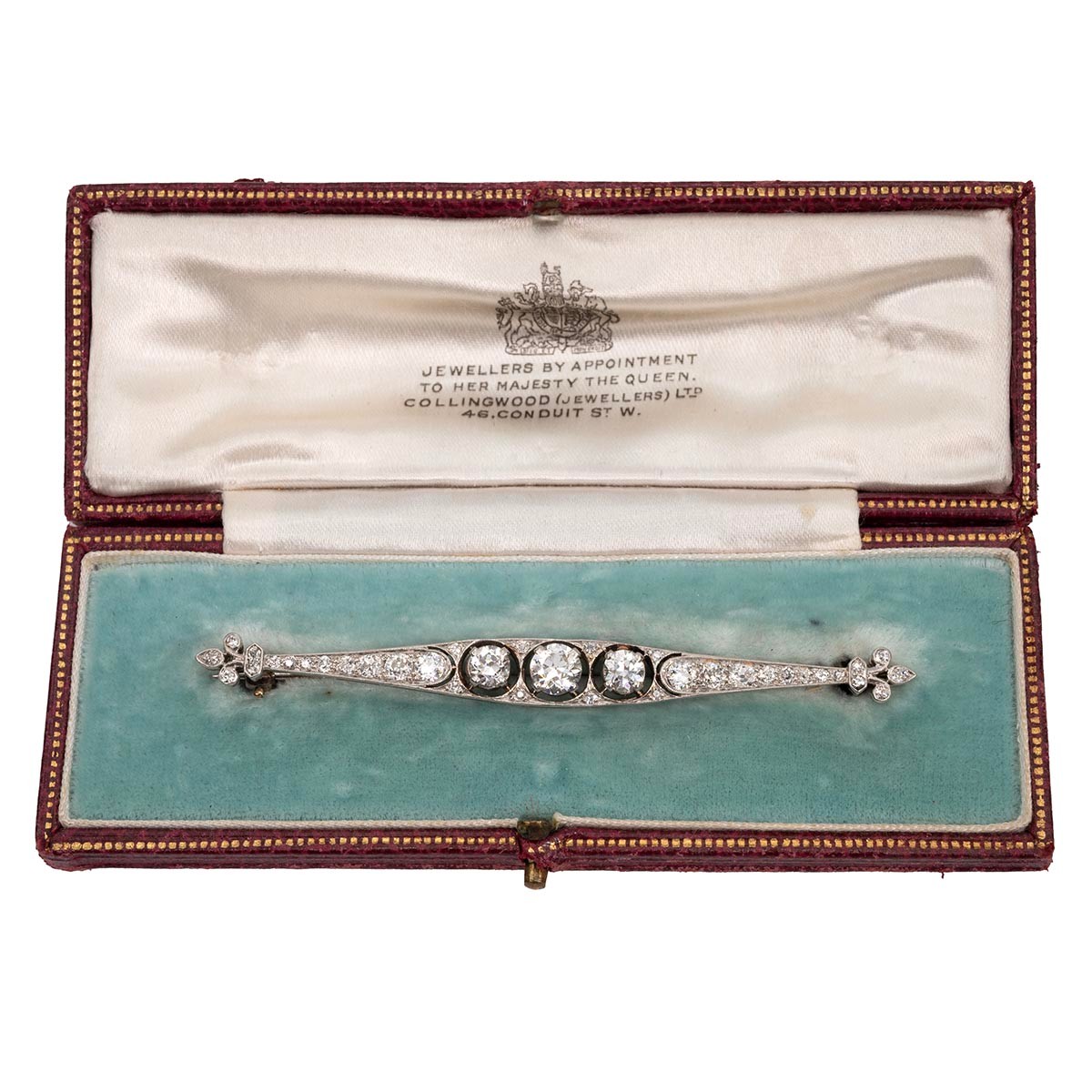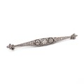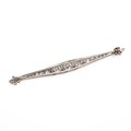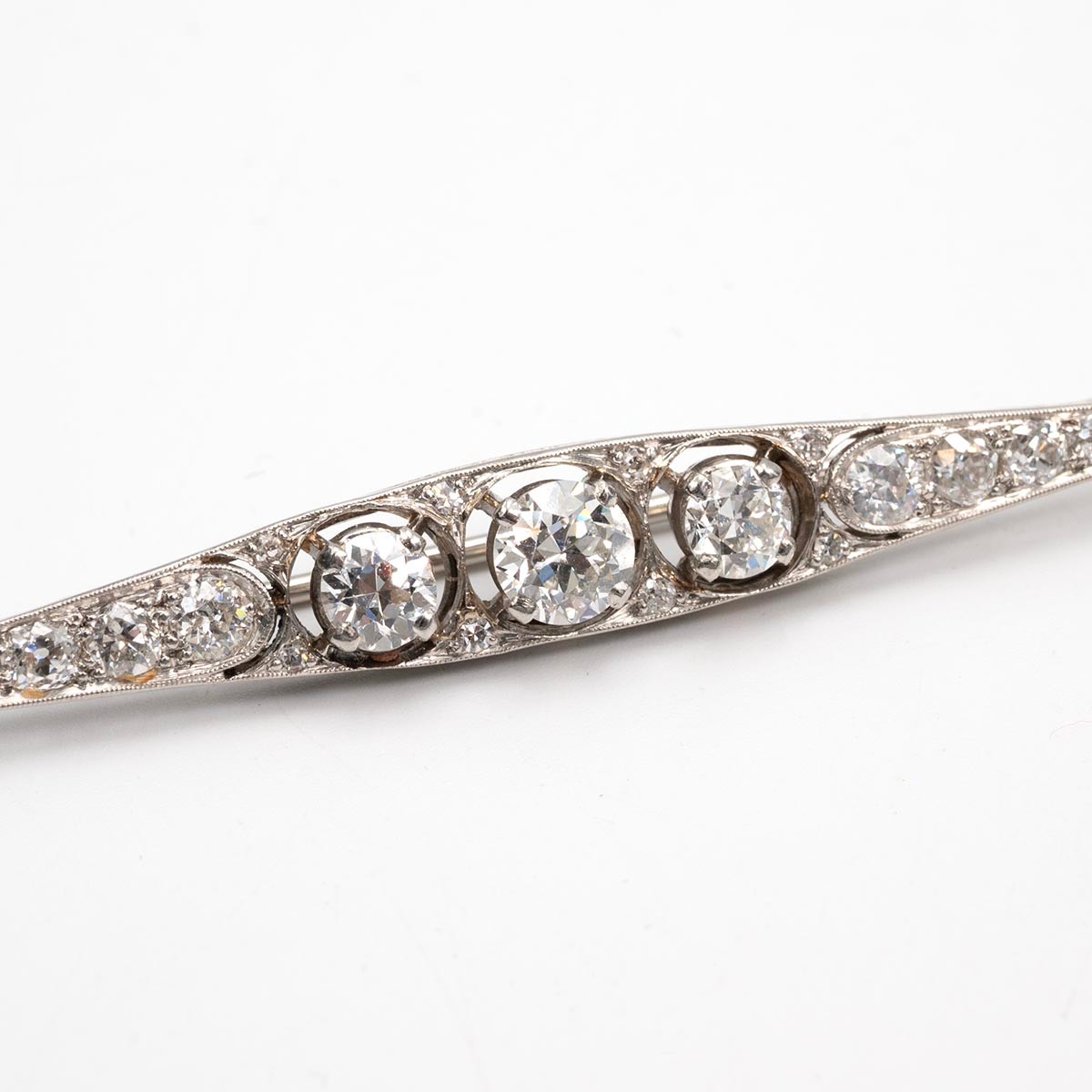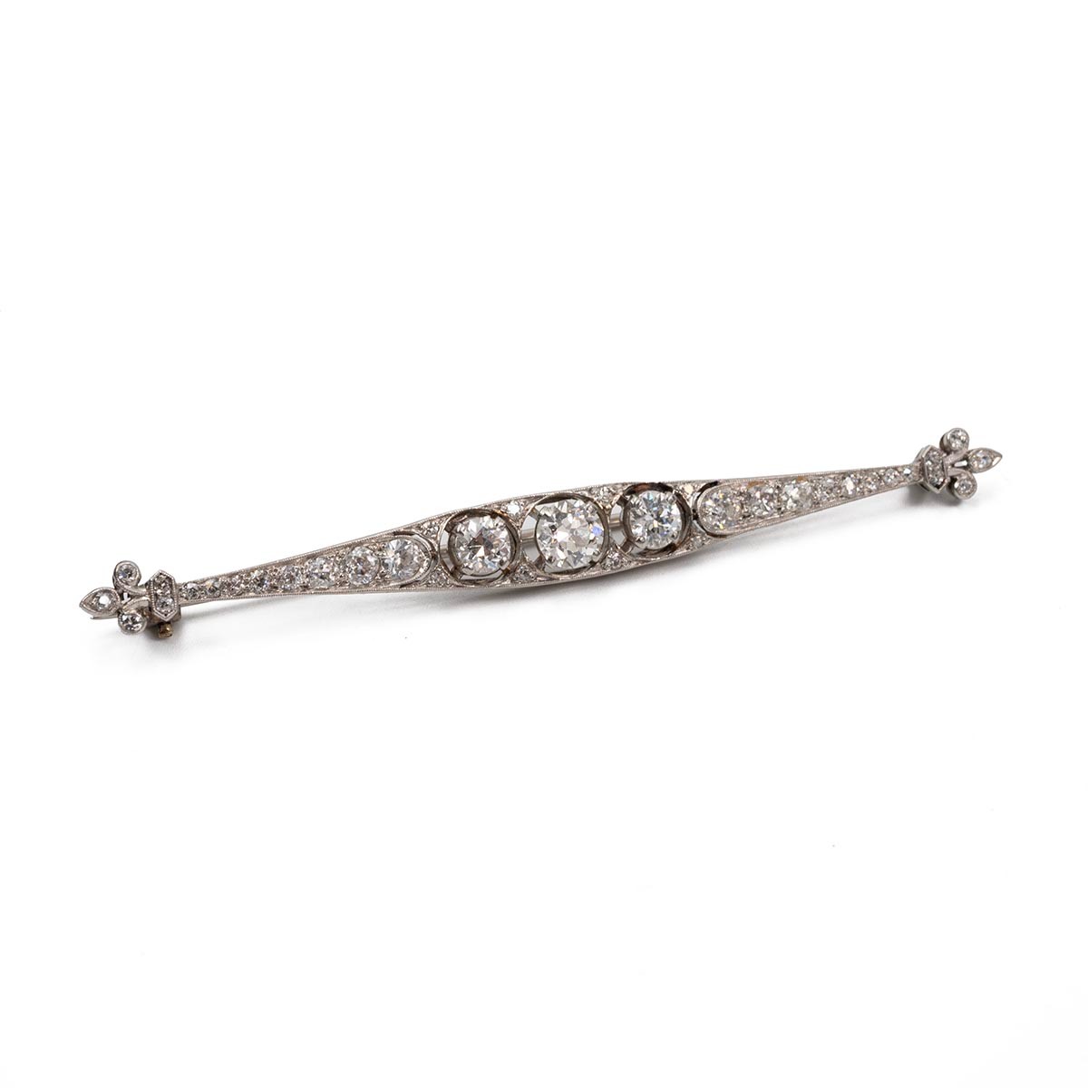 18ct white gold (tested) with 9ct white gold clip (tested) diamond encrusted bar brooch, the central diamond approx 0.75ct flanked by two diamonds each approx 0.4ct, with two rows of seven graduating diamonds terminating in a fleur de lys with five diamonds. The body decorated with eight further diamonds, all in a claw setting raised on a double elongated setting with open spacers, L8cm, weight 8.4 grams.