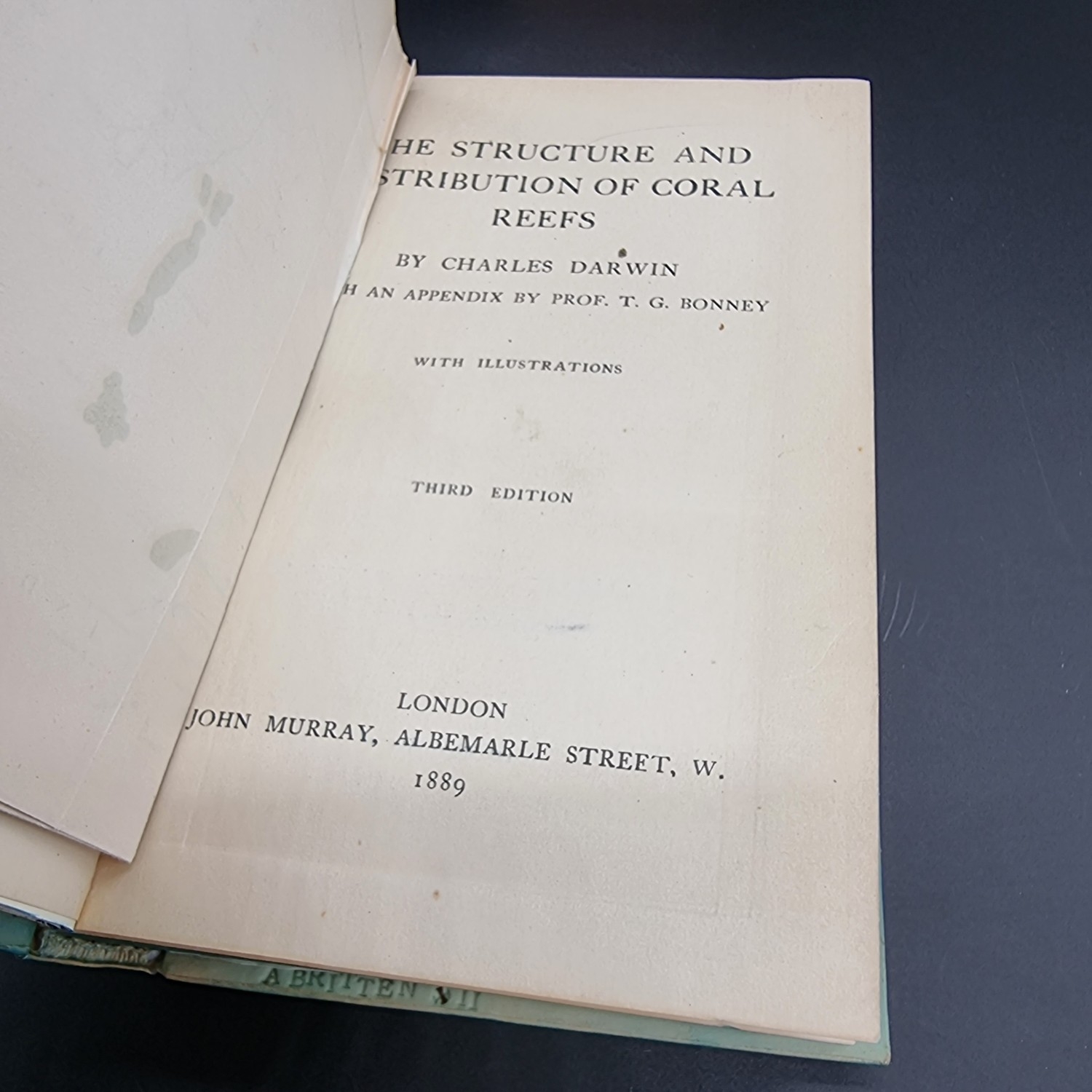 (Designer Bindings): DARWIN (Charles): 'The Structure and Distribution of Coral Reefs...': London, John Murray, 1899: 3rd Edition. Folding map frontispiece, and folding chart at rear, modern craft binding, decorated with sand and coral and painted, signed in blind within lower board 'A Britten', contained in modern solander box, 8vo. (1)